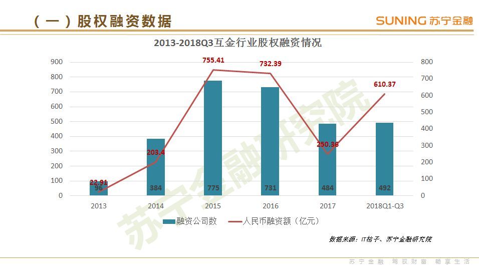 股权融资:据IT桔子不完全统计,2018年前三季度,金融科技行业发生股权融资的公司数为492家,相比2017年有小幅增长;披露的人民币融资金额为610.37亿元。