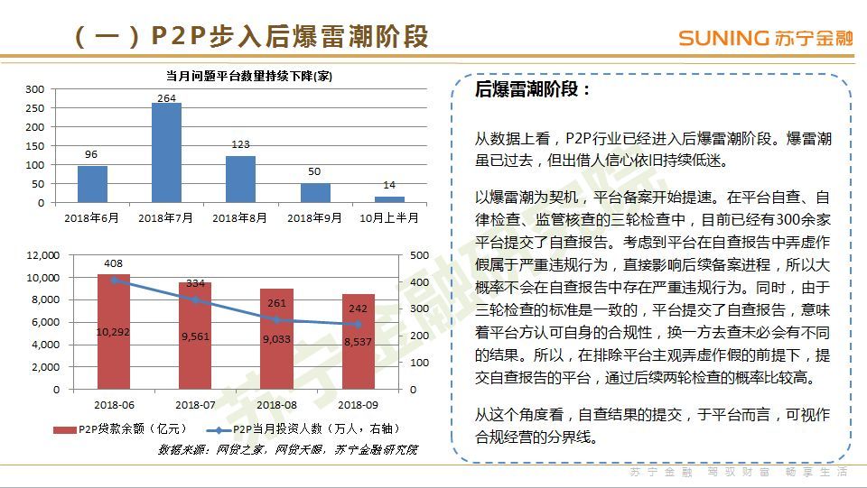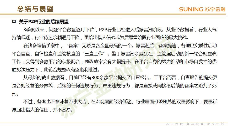 P2P步入后爆雷潮阶段:三季度以来,问题平台数量逐月下降,P2P行业已经进入后爆雷潮阶段。从业务数据看,行业人气持续低迷,待还余额逐月下降,重拾出借人信心,成为后爆雷阶段行业面临的最大挑战。