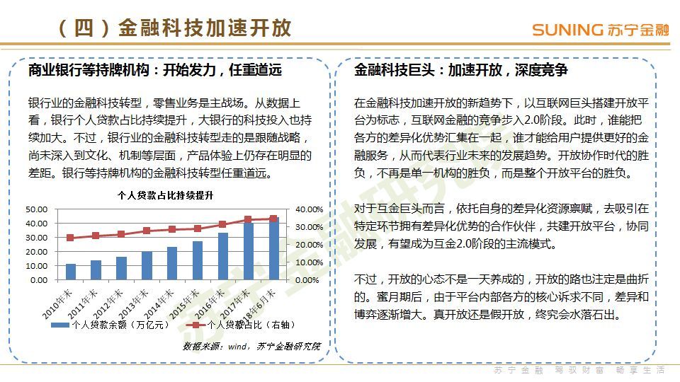 金融科技加速开放:从姿态上看,商业银行开始全面发力金融科技,不过,从“发力”到“成功”,注定是个长期的过程。对金融科技巨头而言,开放也步入“深水区”,各方核心诉求不同,博弈增大,真开放还是假开放,这是个试金石。