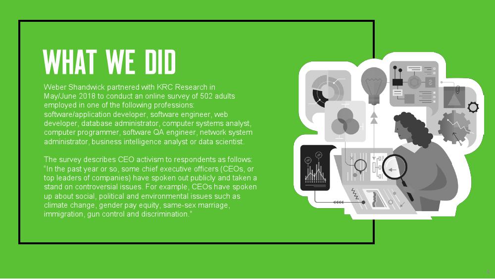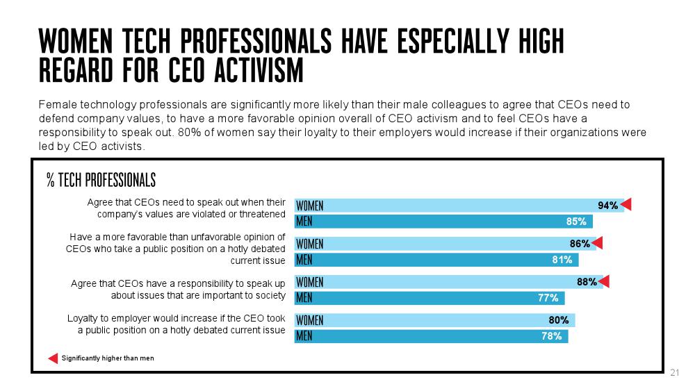 女性技术专家们更加注重能就社会热点问题发表意见的CEO。如果公司希望吸引更多的女性技术人才,行动派CEO将会成为提高公司吸引力的一大优势。