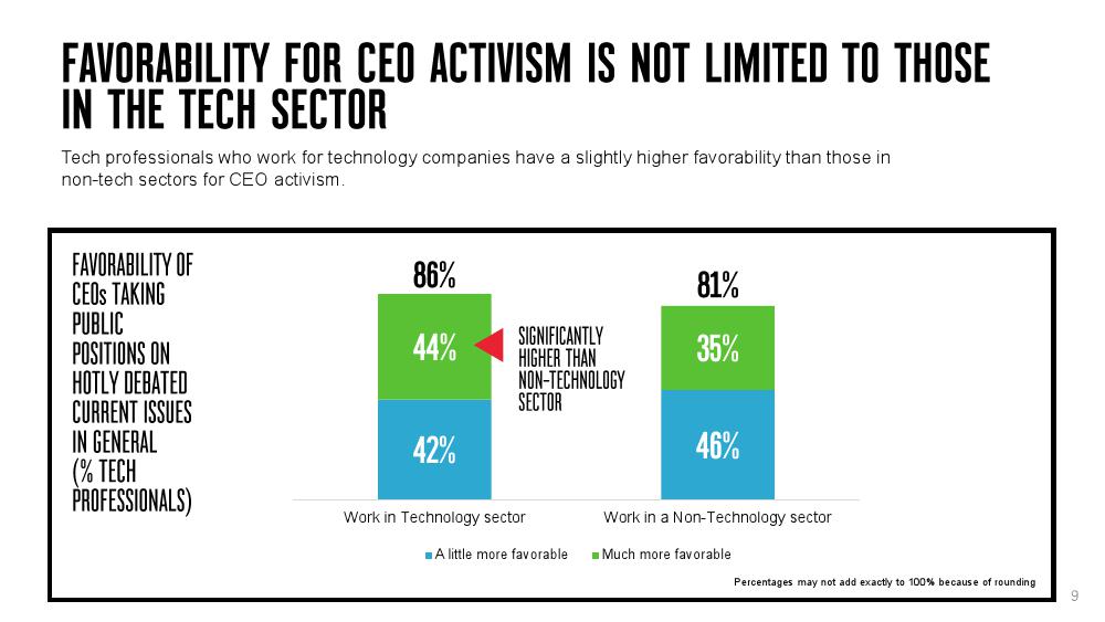 报告显示,在技术导向型行业中,人们极其青睐并热衷于能就社会问题发表自己意见的CEO,技术专家们更是对这些踊跃表达观点的CEO持有积极正面的看法。其中高达82% 的技术专家支持他们的CEO对社会事件公开发表自己的观点,81%的人员表示这是CEO需要承担的社会责任。当然,青睐此类CEO的技术专家也不仅局限于特定的技术行业,不论是技术导向型行业或其它行业,技术专家的总体倾向具有一定的相似性。