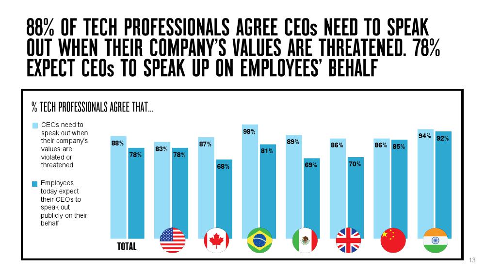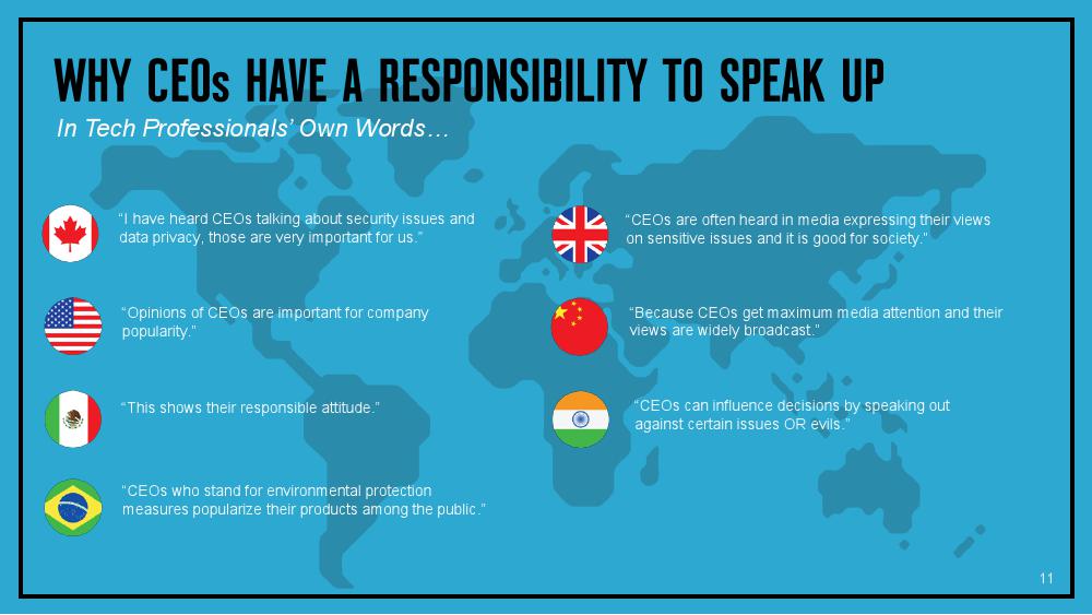 我们的调查显示,七大市场高级技术专家都非常希望CEO就社会热点问题畅所欲言。