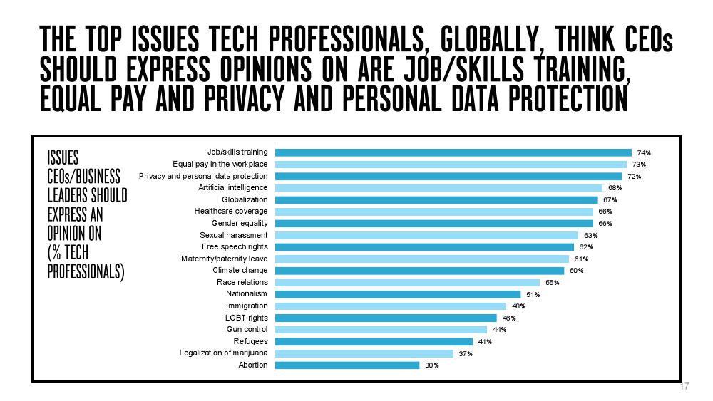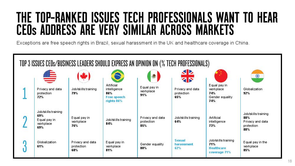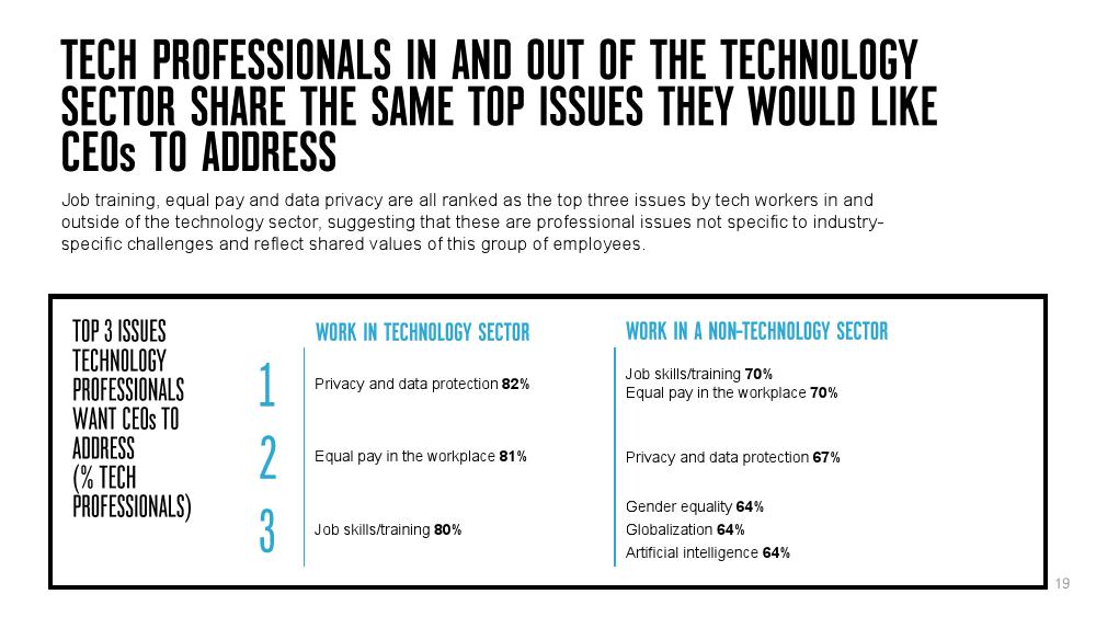本次调查为受访者罗列出19个当下社会热点问题,并询问哪些是他们最希望CEO和其他企业高层能够关注并公开发表自己观点的社会问题。不论是从事技术性行业还是非技术性行业者,他们最关心的问题呈现一定的相似性,分别是:数据隐私、同工同酬和职业培训(各占82%、81%、80%)。这表明了这些现实问题并非针对某个行业的人员而言,而是代表了所有的从业者。更有趣的发现是,由于受到非技术性行业中女性技术专家的直接推动,非技术性行业中的员工认为性别平等这一项社会问题也同样值得被重视。