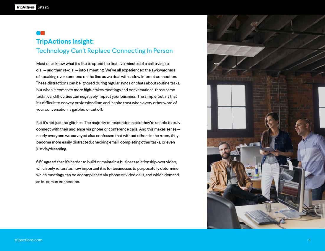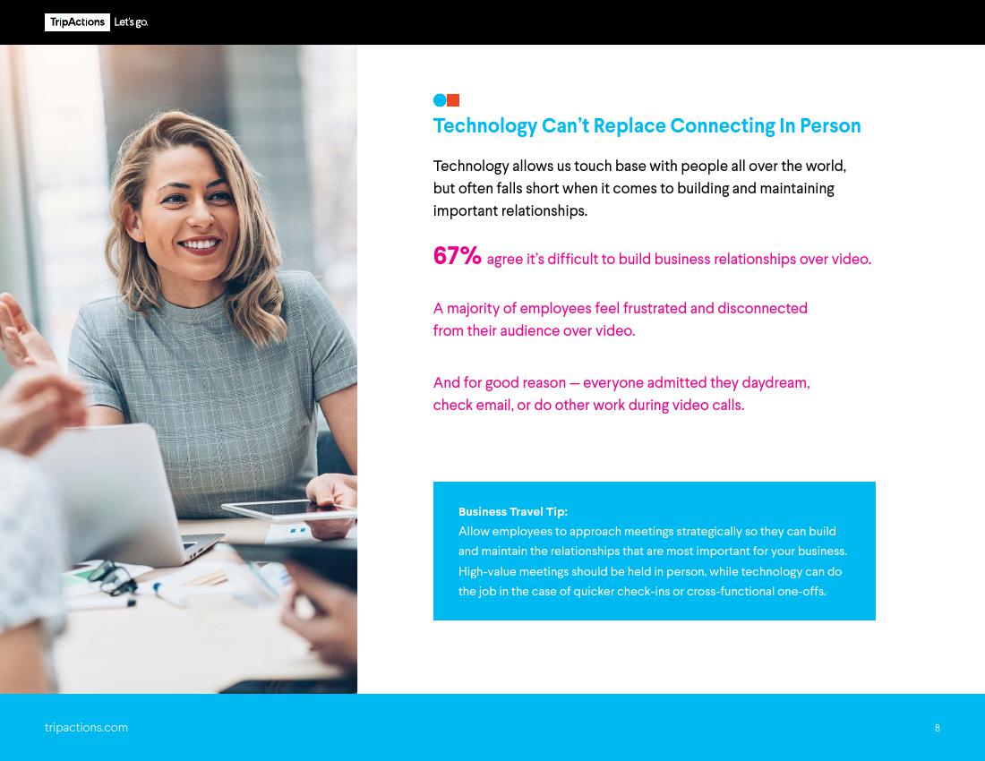 TripActions认为,“高价值的会议需要双方亲身参与,当面进行讨论。但在一些需要进行快速对接或跨职能多方的突发会议中,企业可以采用视频通话的方式。”