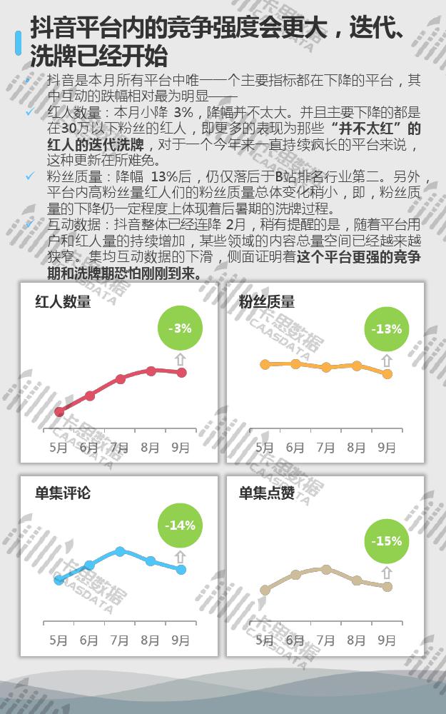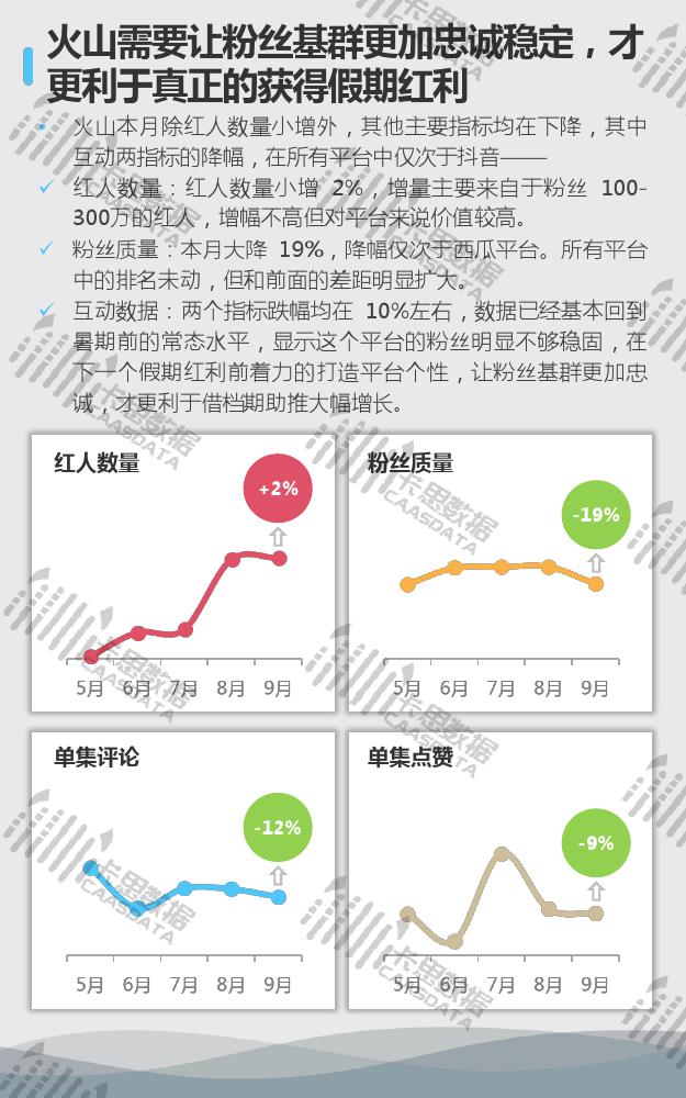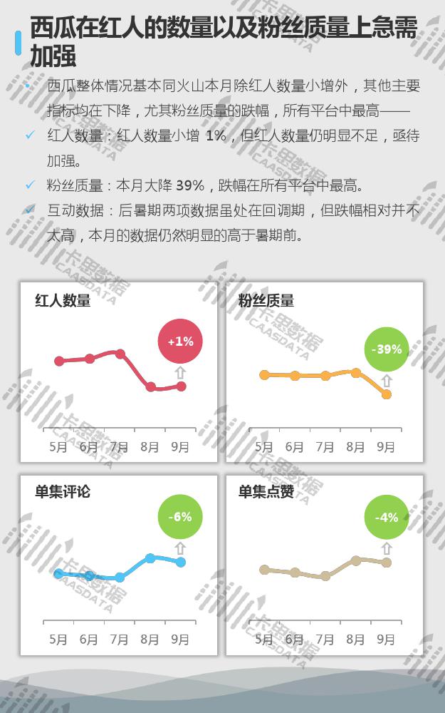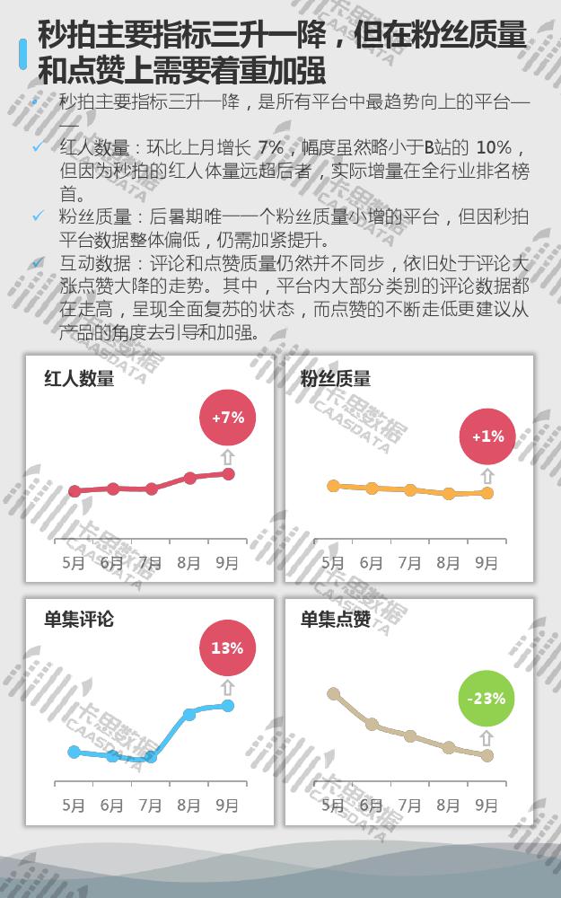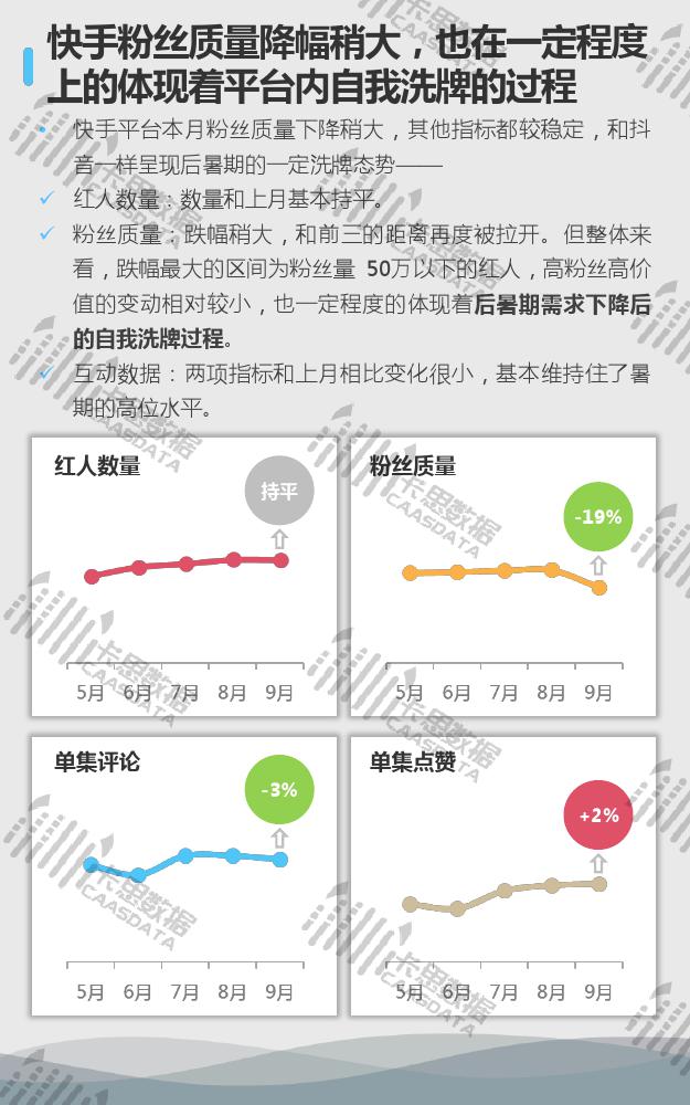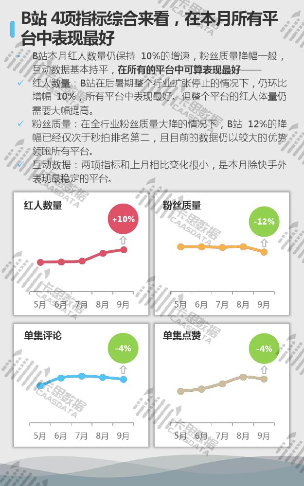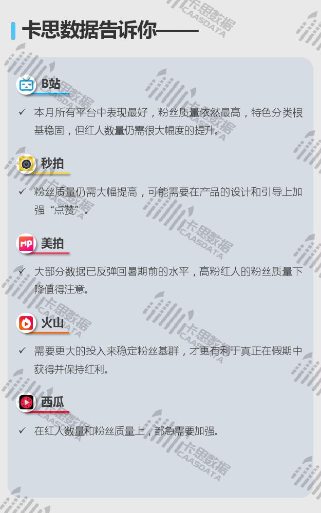 7大KOL平台中,抖音的迭代、洗牌已经开始,内部竞争会加强。快手粉丝质量急需增长,平台内也有呈现一定的自我洗牌过程。B站四项指标综合来看,在本月所有平台中表现最好。