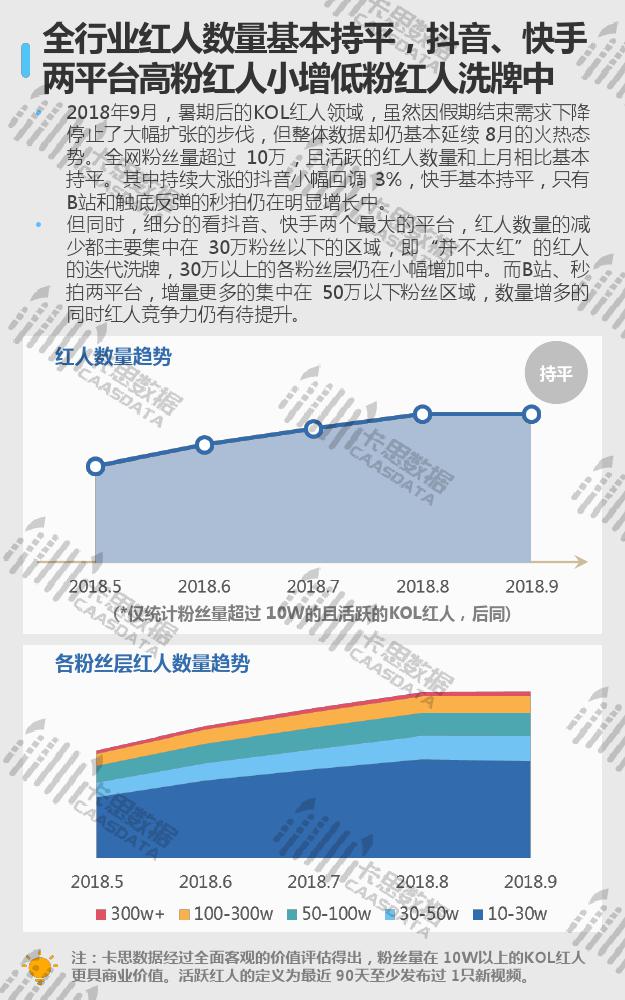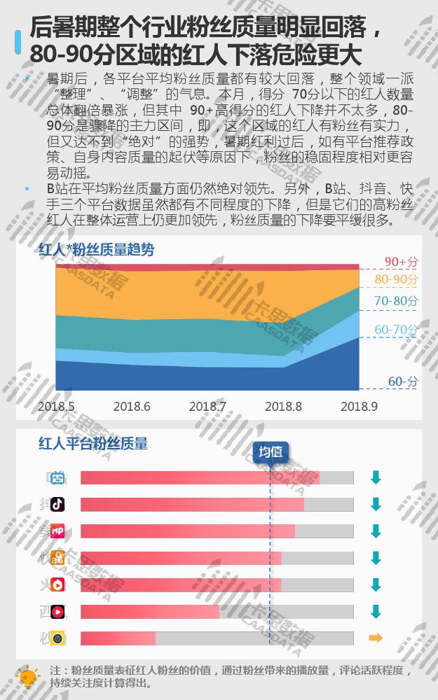 从KOL红人的发展态势来看,全行业粉丝量超过10万,且活跃的红人数量与上月相比基本持平。抖音30万粉丝以下的红人迭代洗牌,30万粉丝以上的红人小幅增长。此外,暑期结束后,红人粉丝质量明显回落,80-90分区域的红人下降风险更大。各平台平均粉丝质量也有较大下滑,不过B站仍然遥遥领先。