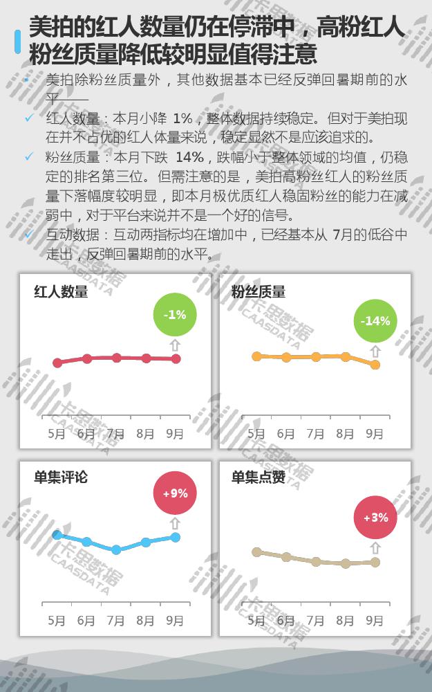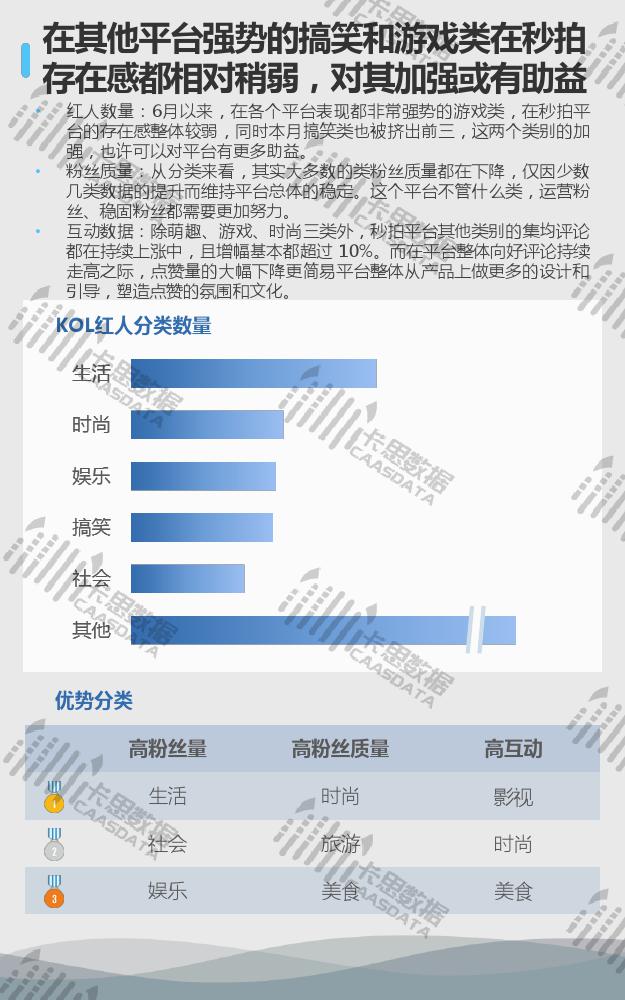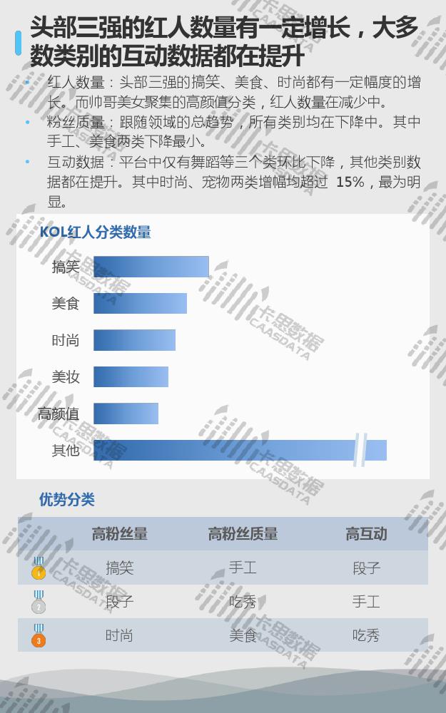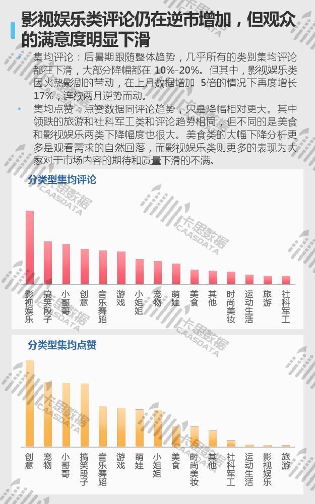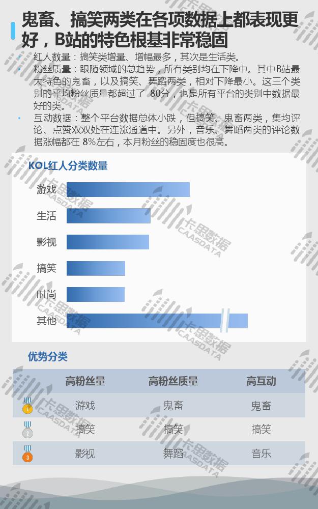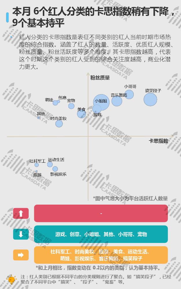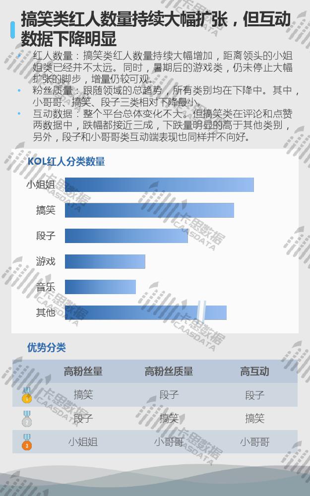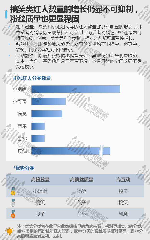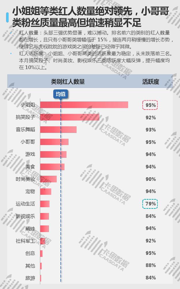 从15个分类的红人现状来看,小姐姐、搞笑段子、音乐舞蹈类红人在数量上优势显著,三强地位较难撼动。小哥哥类红人数量上增速较缓,与排在其后的游戏类差距微乎其微。互动方面,影视娱乐类红人的集均评论量连续两个月逆势上涨,但从集均点赞来看,观众的满意度在下降。