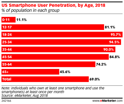 青少年痴迷于使用智能手机的形象已经成为陈词滥调,人们很容易忘记他们获得设备的速度很慢。就在2012年,Common Sense的民意调查显示,只有41%的青少年拥有智能手机(13-17岁)。就此而言,他们仍然落后于千禧一代和X世代。但是,现在大多数青少年都有智能手机。eMarketer估计,今年12至17岁的美国人中有81.1%拥有智能手机,到2022年这一数字将达到85.0%。