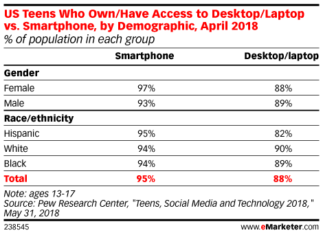 智能手机现在已经成为青少年生活的必需品,而且在各个收入层中都如此。2018年3月和4月Common Sense的调查发现,低收入家庭中有88%的青少年拥有智能手机,中等收入家庭占87%,高收入家庭占92%。