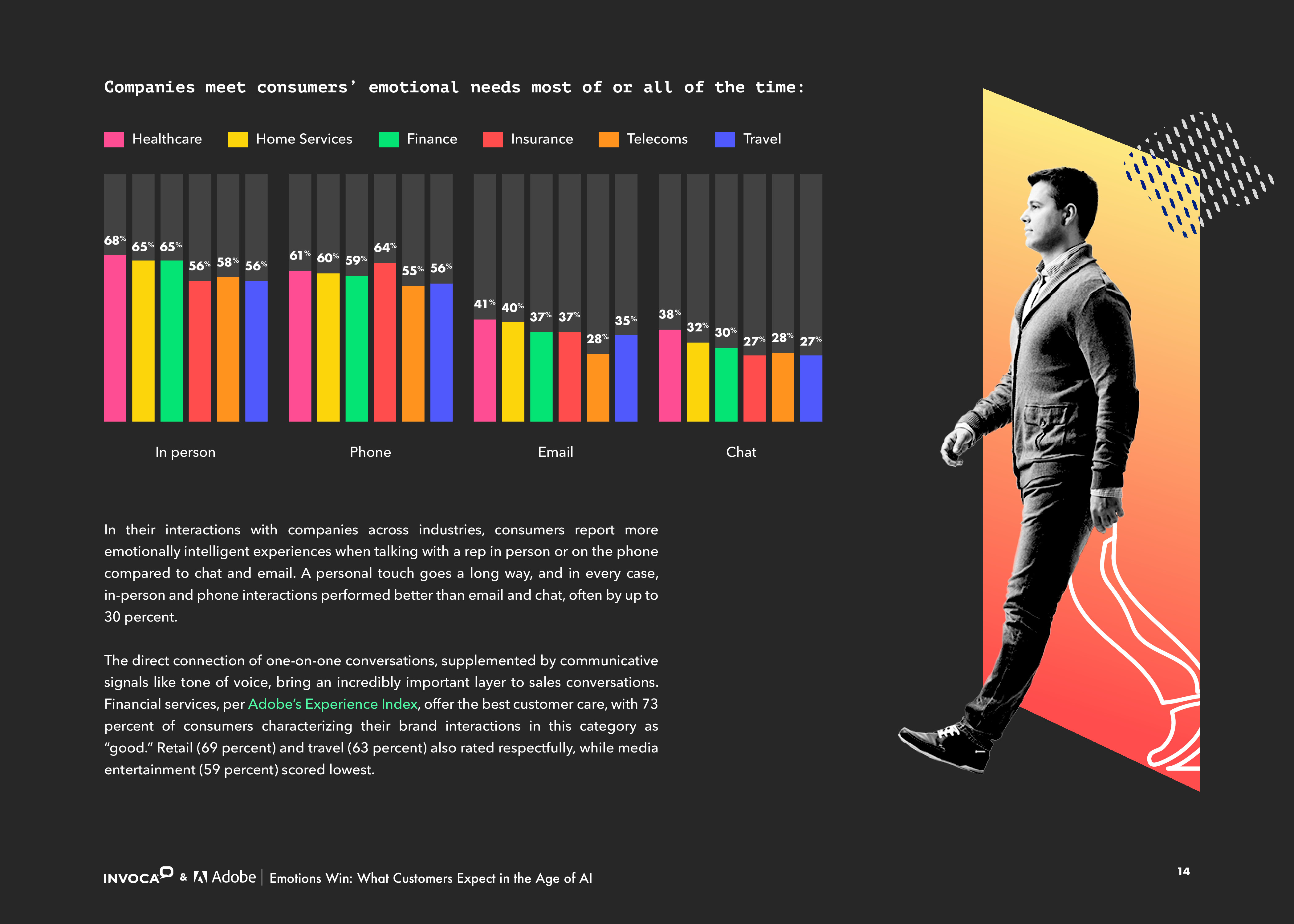 最后,虽然大多数受访者认为各行各业的公司大部分时间通过电话满足他们的情感需求,但只有大约35-40%的人对电子邮件有这种感觉,而对于聊天则只有不到1/3的人选择。