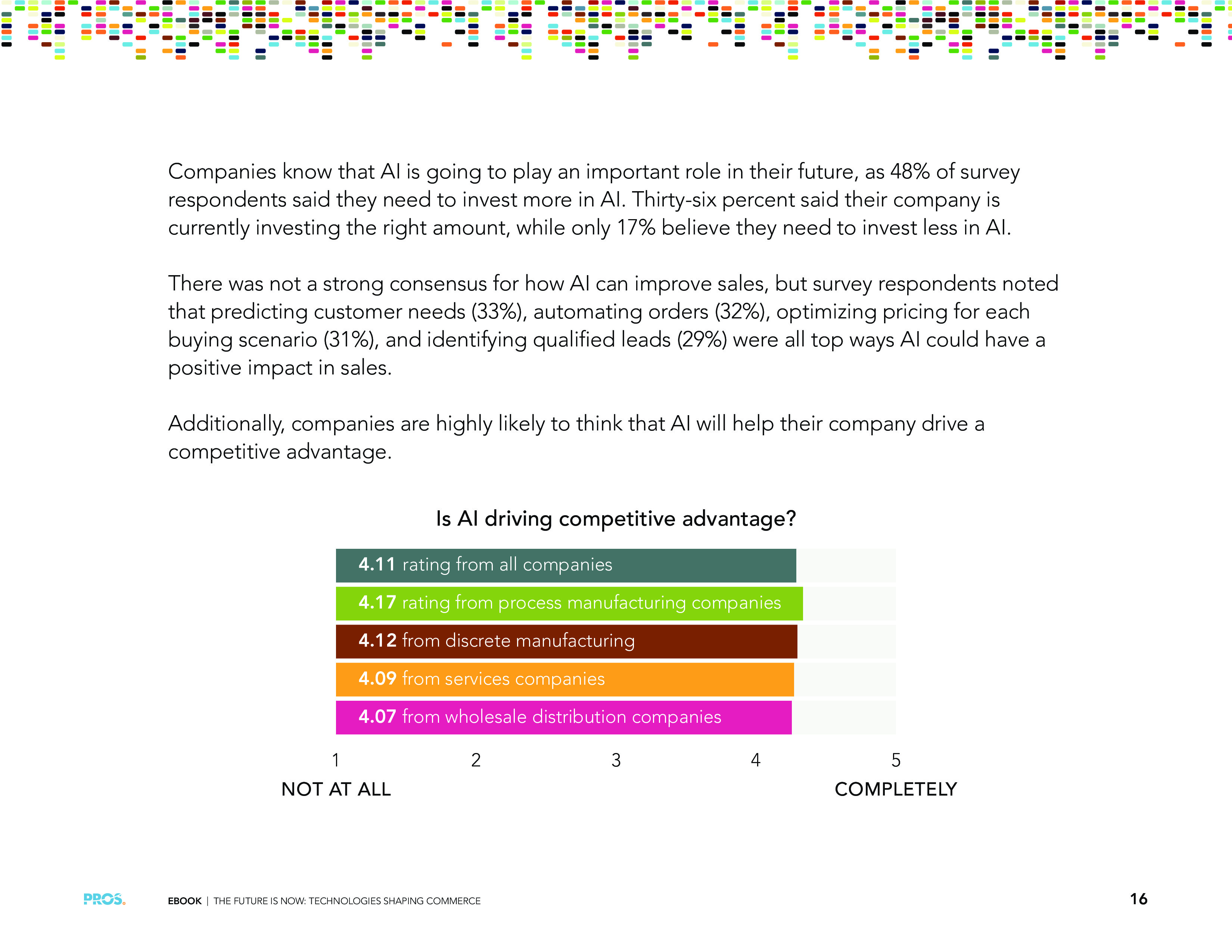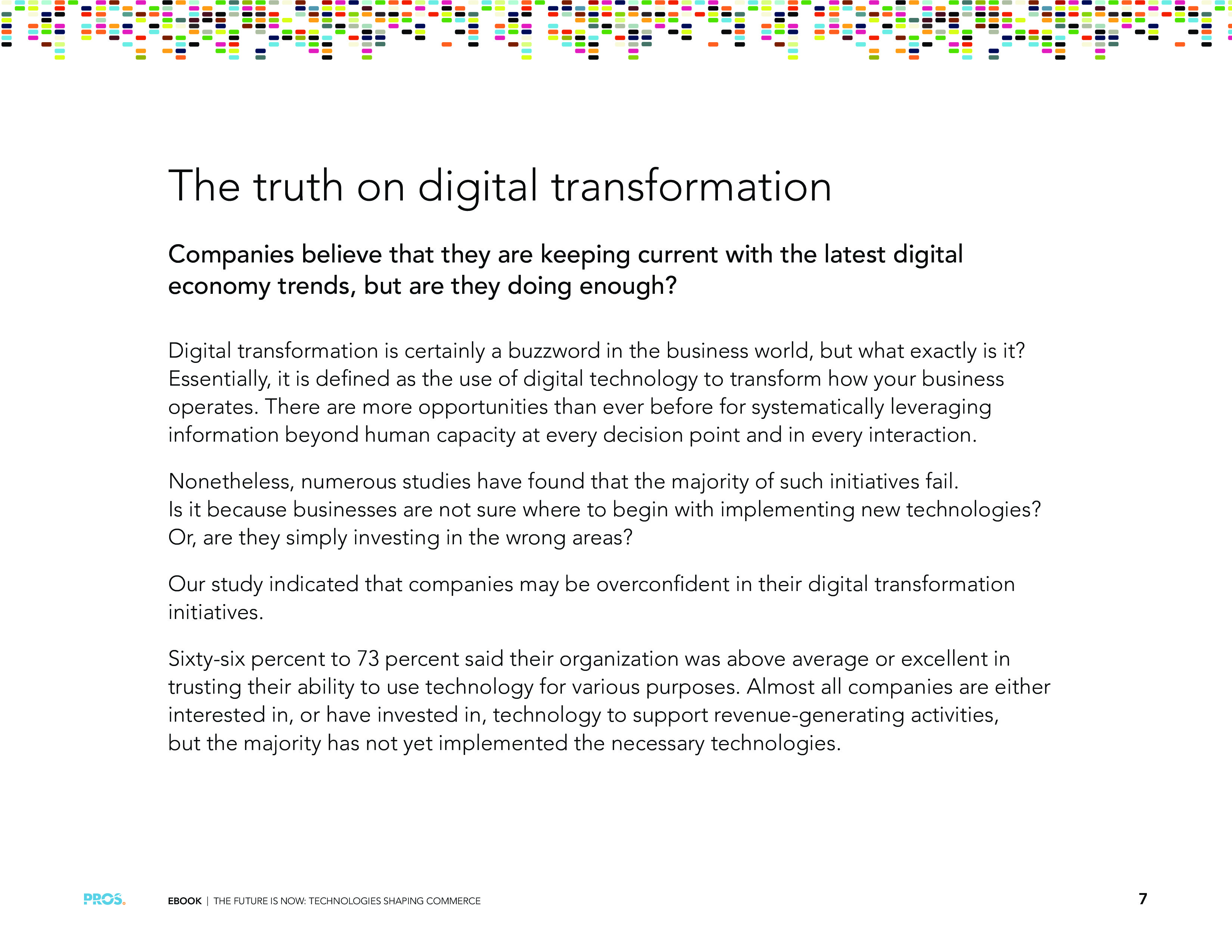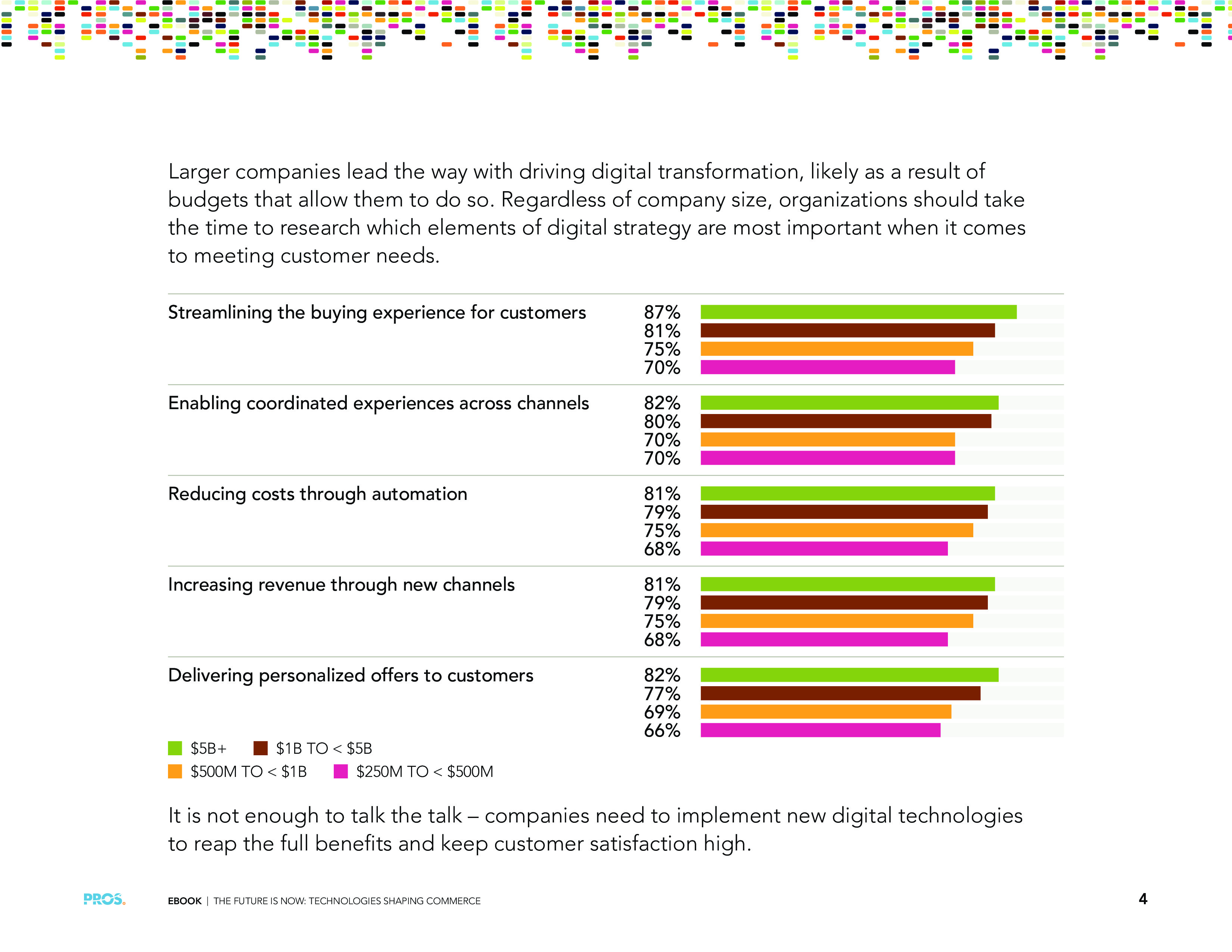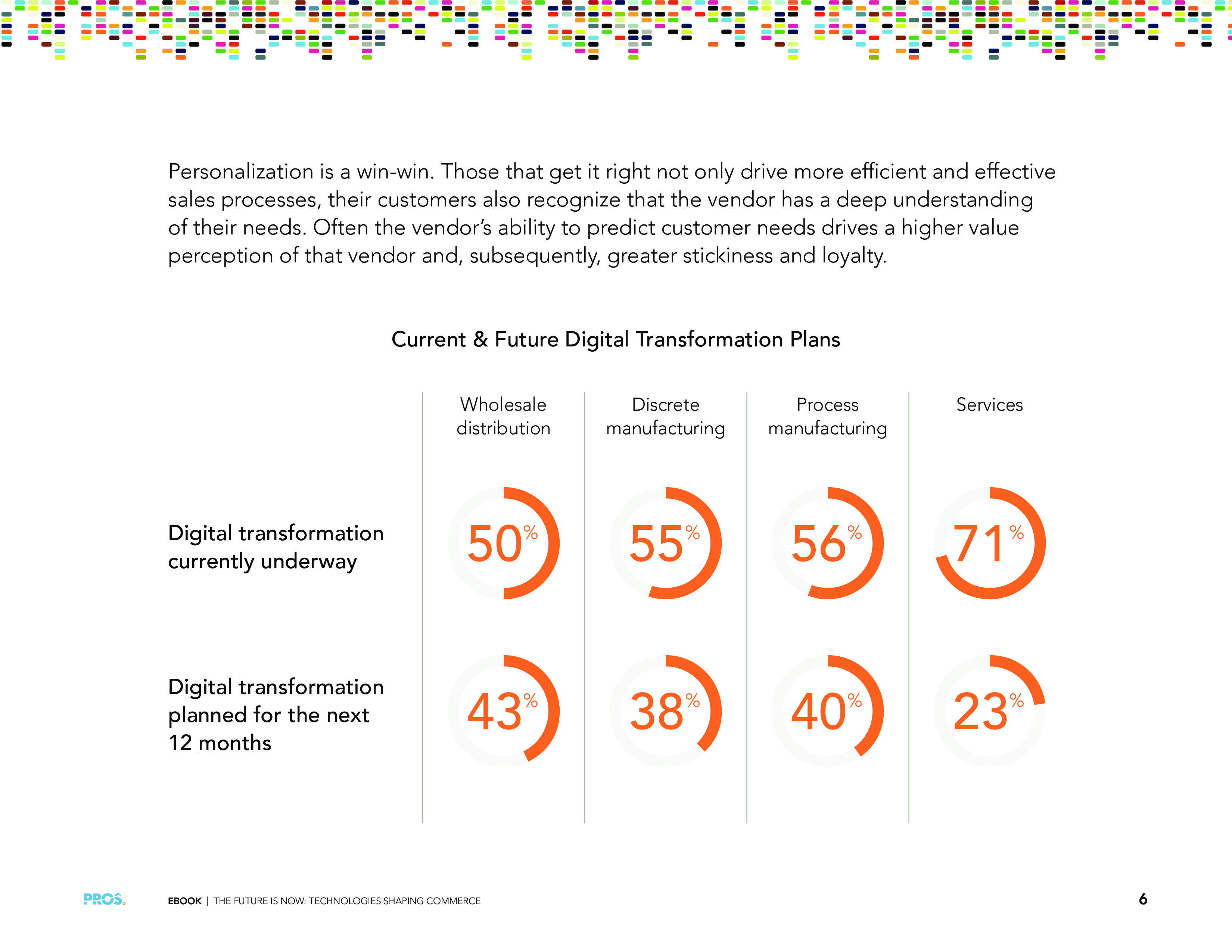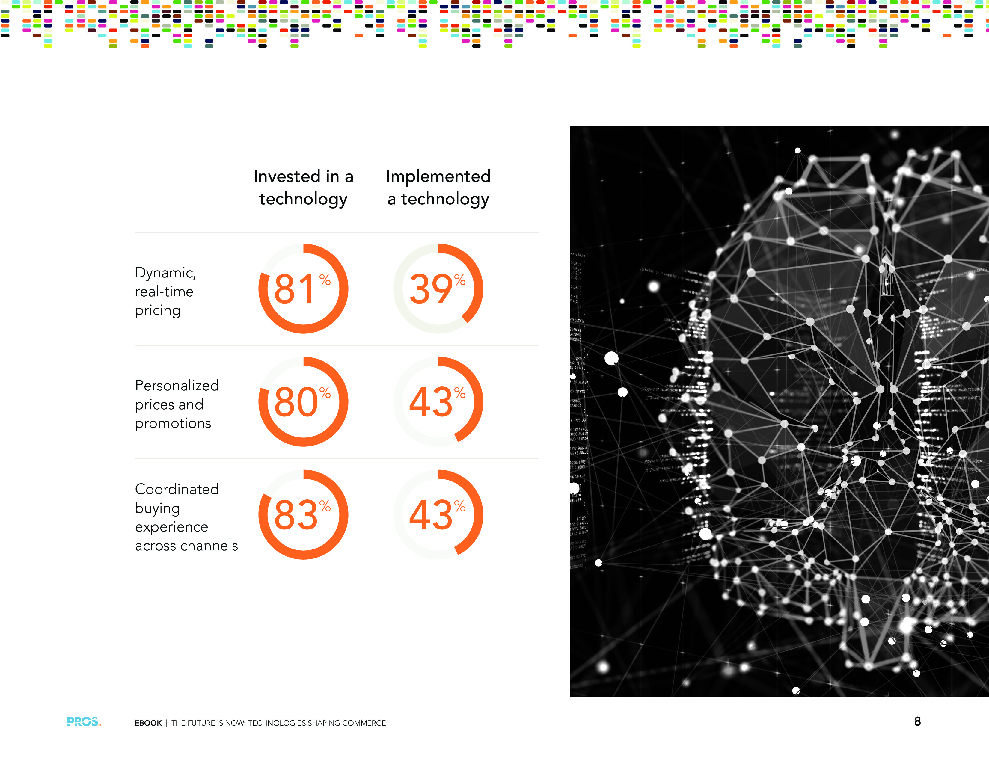 PROS的报告表明,B2B公司正在这些领域进行投资,但实际实施的技术却少得可怜。例如,虽然81%的企业投资于动态实时定价技术,但只有39%的公司实施了其中一项。同样,虽然8/10的人投资了个性化的价格和促销技术,但只有一半(43%)的公司实施了这种技术。83%的公司投资统一各渠道的购买体验方面的技术,但是只有43%真正实施了这种技术。