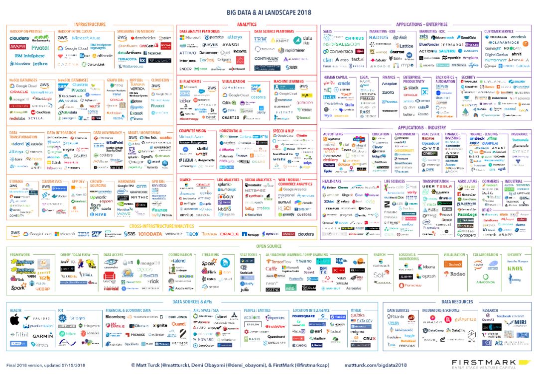 风险资本家Matt Turc分享了2018年大数据和人工智能的全景图,有1095家大数据公司被纳入其中。本文将基于这份全景研究对大数据和人工智能领域进行详细的解读,包括各细分领域的分布情况,上市及被收购的知名企业分析,以及MobData研究院对整个领域的趋势预测。