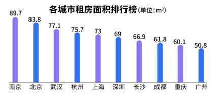 而在租房面积上,南京则以89.7平方米的套均面积位列第一,北京、武汉、杭州、上海紧随其后。可见,北京不仅房租领先其他城市,租房面积也同样位居前列。