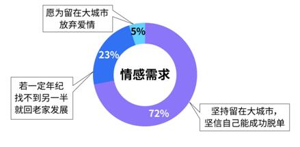 对于独自在大城市拼搏的单身租客们来说,他们的最终情感需求是什么呢?有超七成(72%)的租客表示,将会“坚持留在大城市,坚信自己能成功脱单”,23%表示将“若一定年纪找不到另一半就回老家发展”,另有5%表示“愿为留在大城市放弃爱情”。