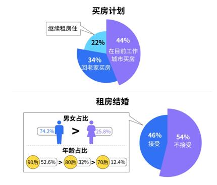 尽管城市的高房价让不少人望而却步,但仍有44%的租客表示计划在目前工作城市买房,而另有34%的租客计划回老家买房,22%的租客则选择继续租房住,认为租房更经济方便。