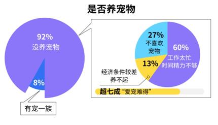 同时,随着“吸猫撸狗风”的兴起,养宠物成了单身租客们排解孤独和压力的一种方式。调研发现,尽管单身租客中的“爱宠族”不在少数,但“有宠一族”仅占8%,超九成租客没养宠物。其原因分别为:“工作太忙,时间精力不够”(60%)、“经济条件较差,养不起”(13%)和“不喜欢宠物”(27%)。可见,超七成的租客“爱宠难得”。