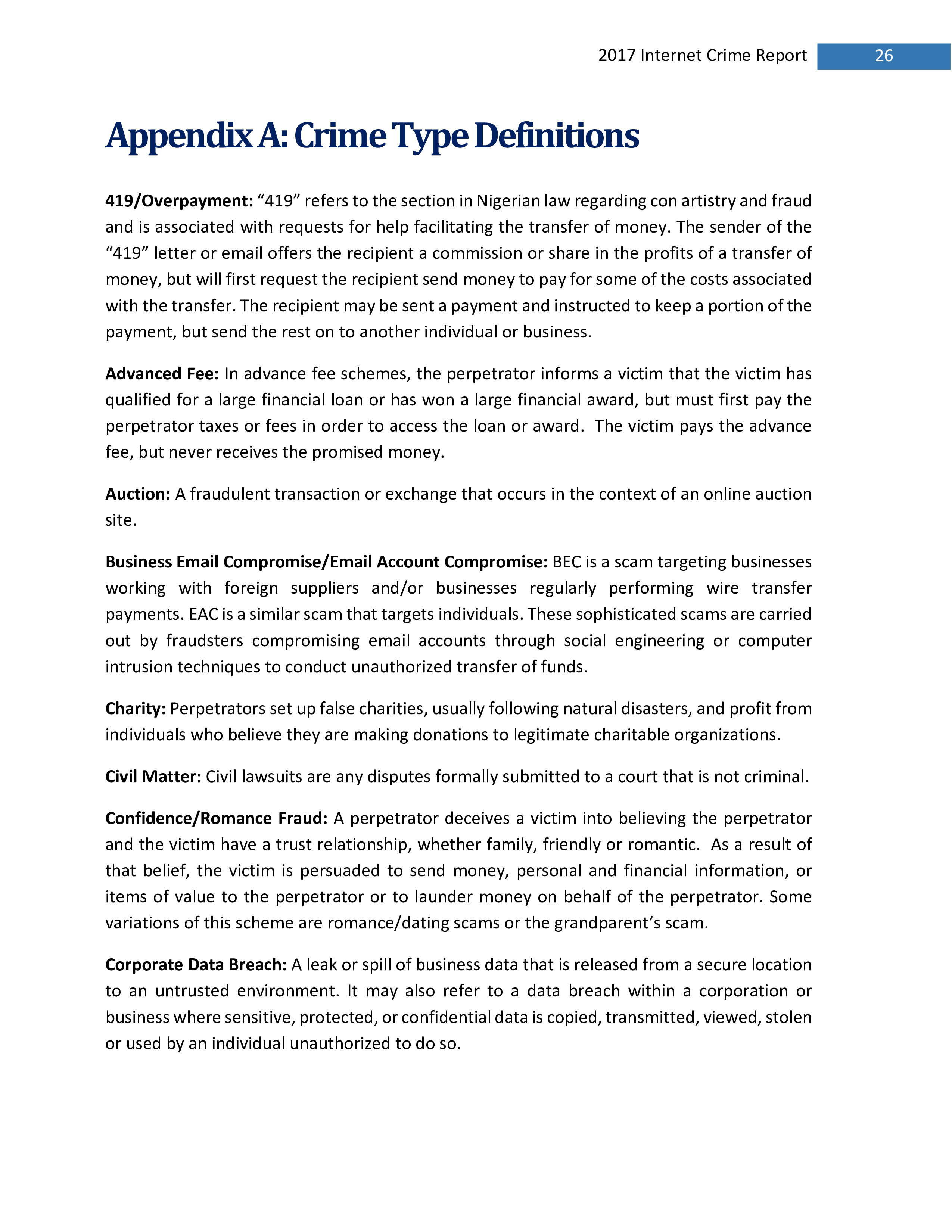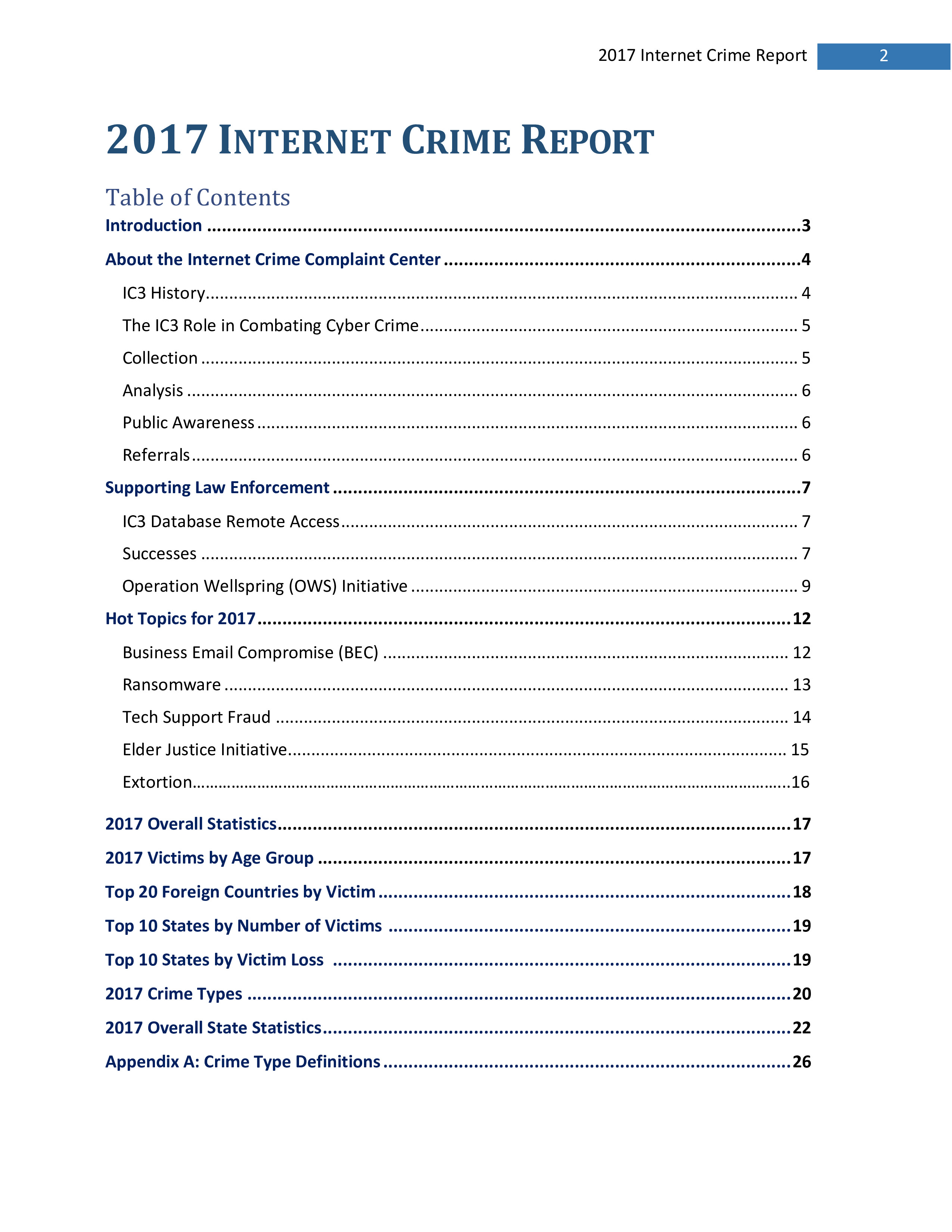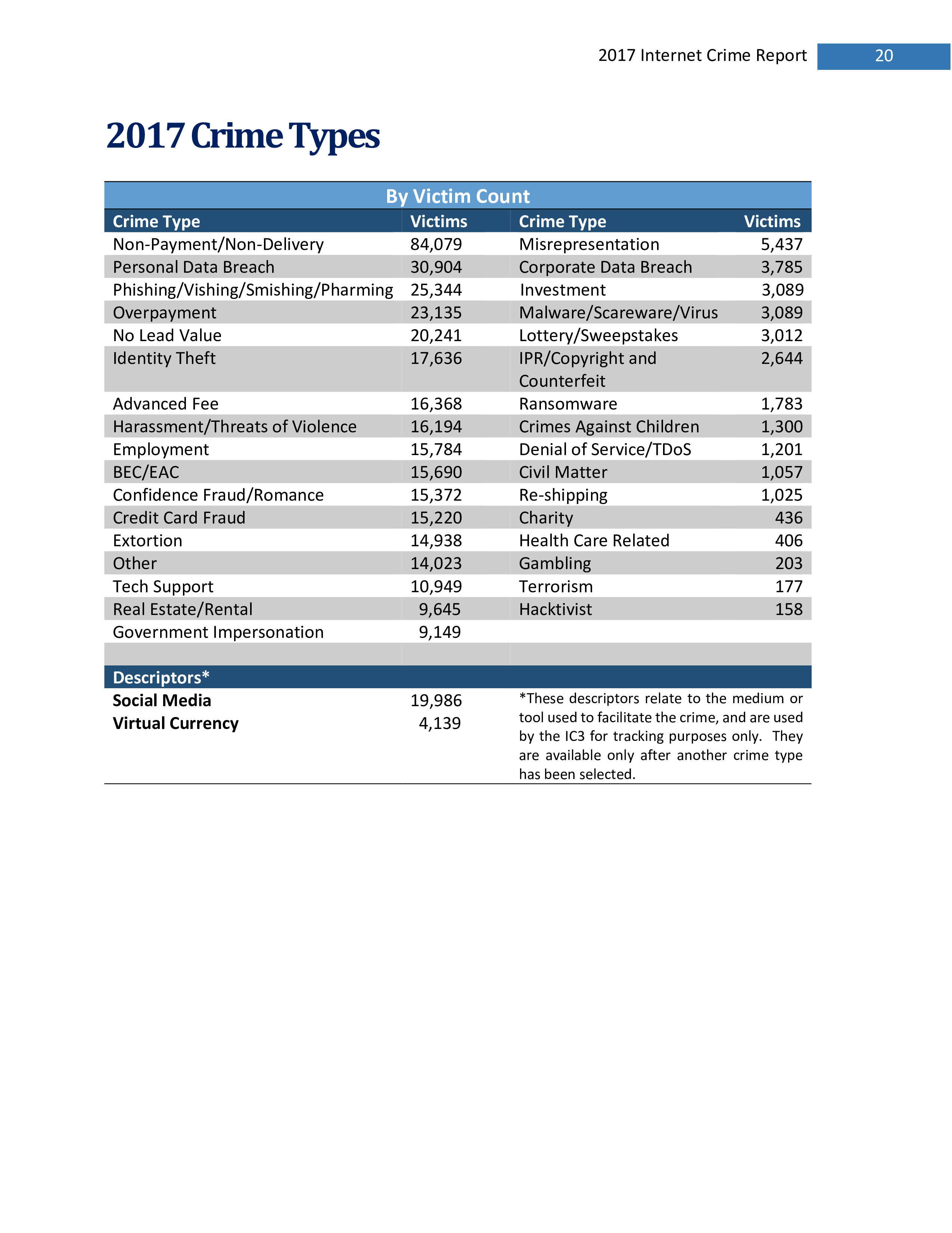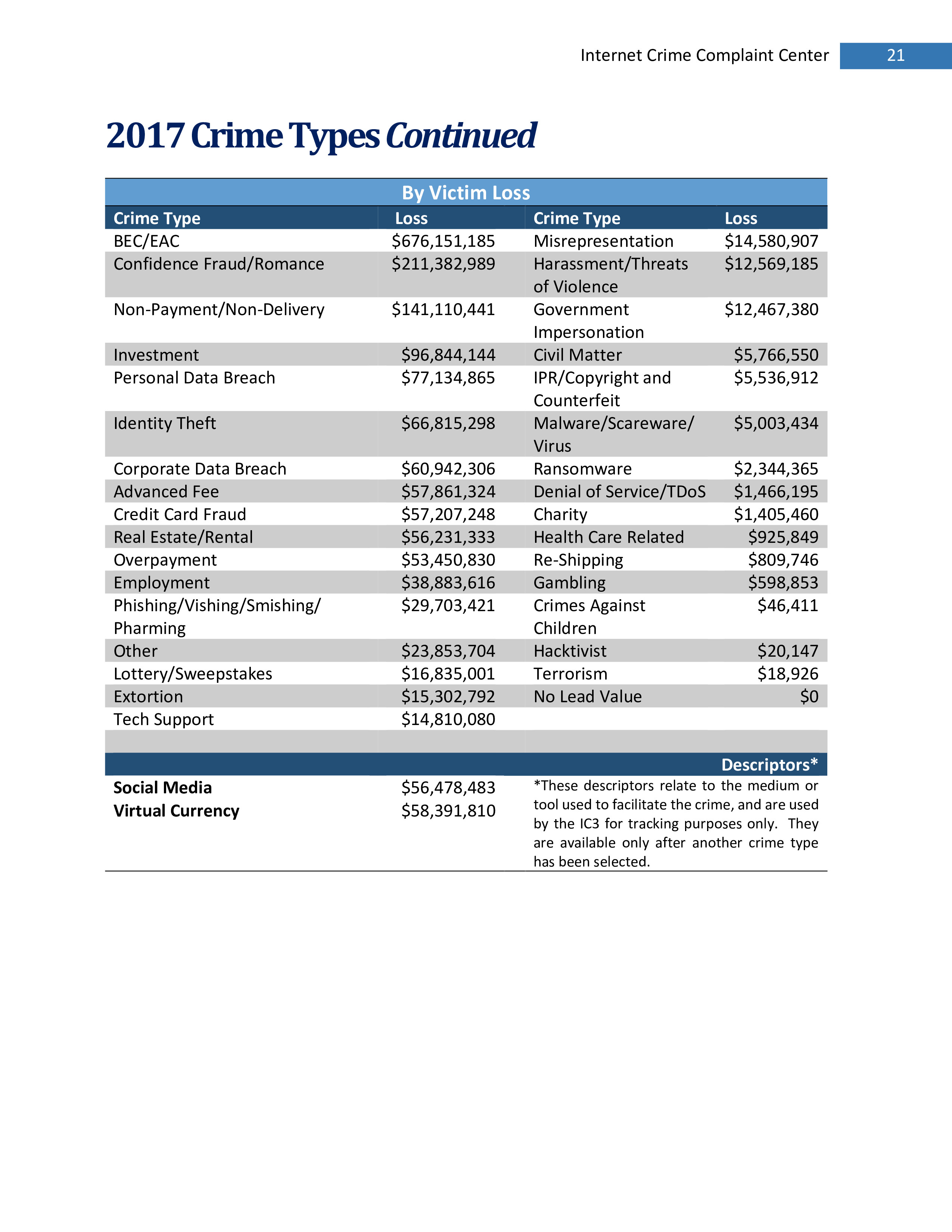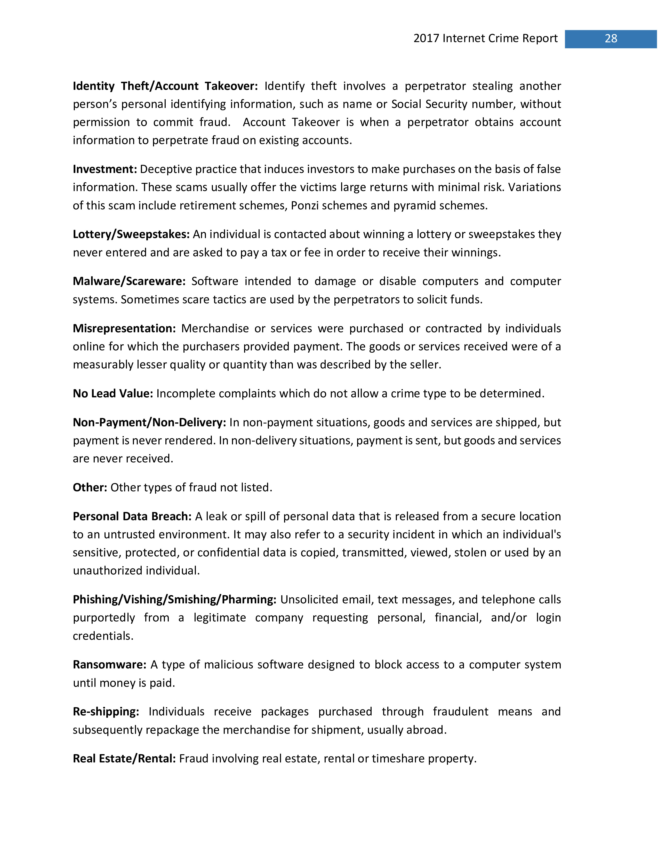 2017年,IC3共收到301,580起投诉,报告的损失超过14亿美元。在过去的一年里,受害者报告的最普遍的犯罪类型是不付款/未送达、个人数据泄露和网络钓鱼。报告损失最高的前三种犯罪类型是BEC、浪漫欺诈和不付款/未送达。