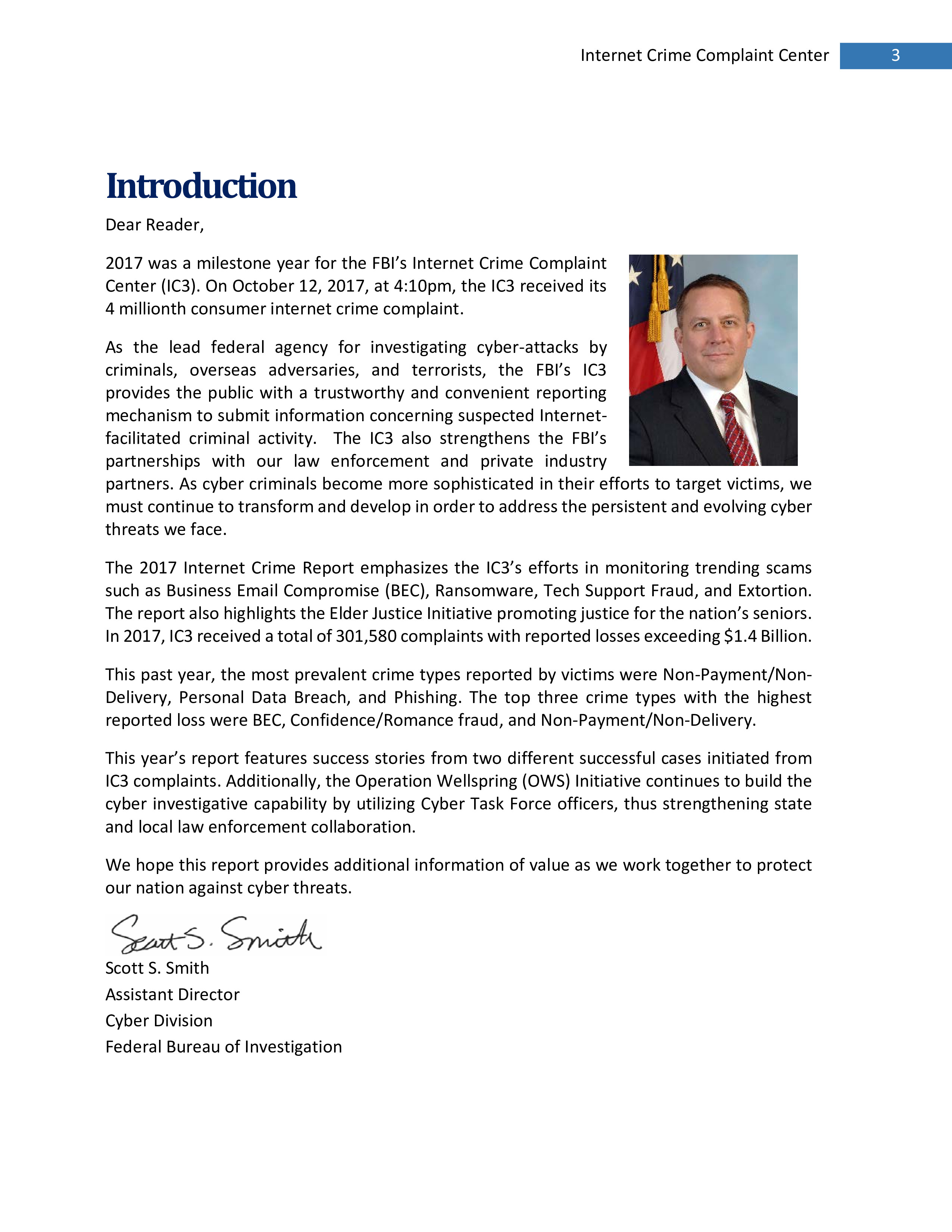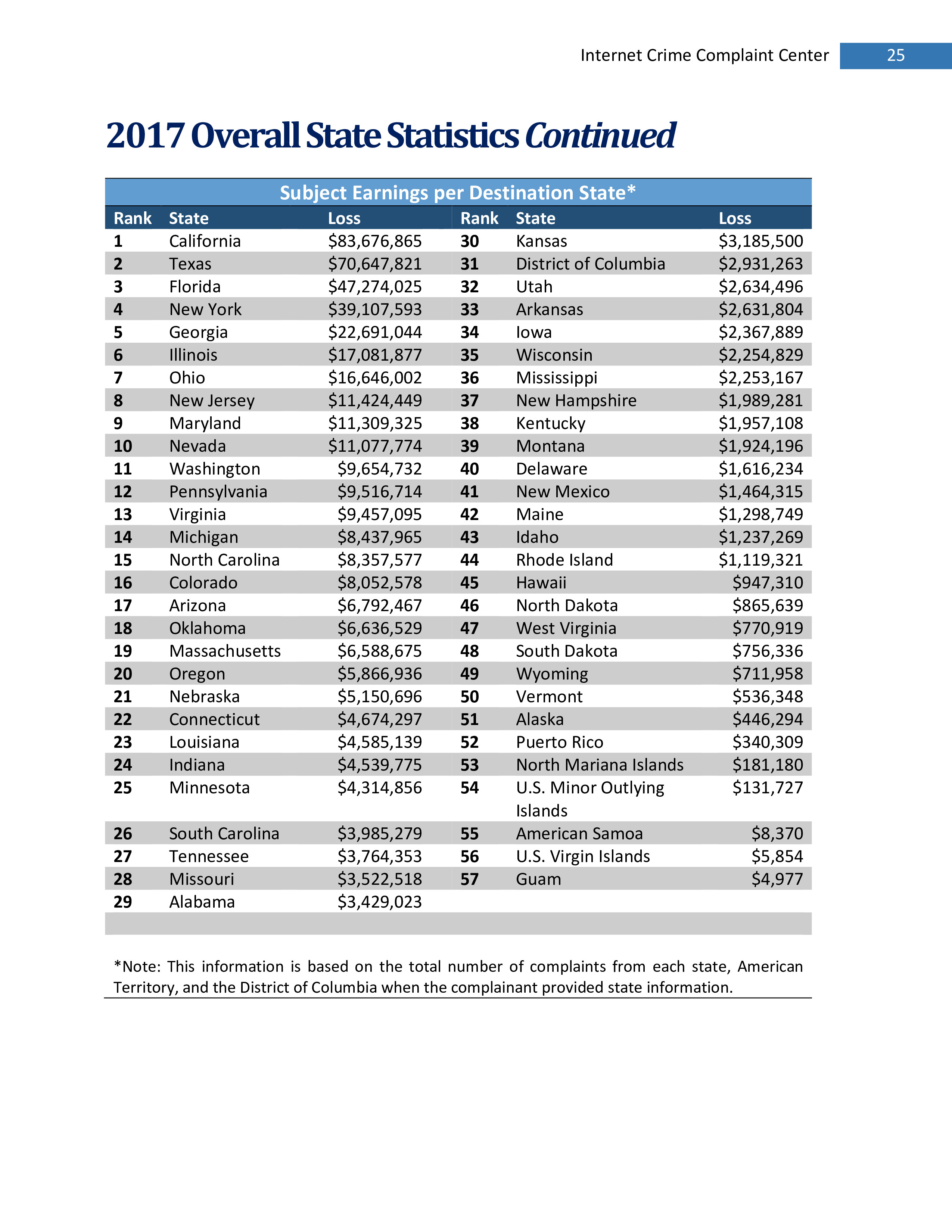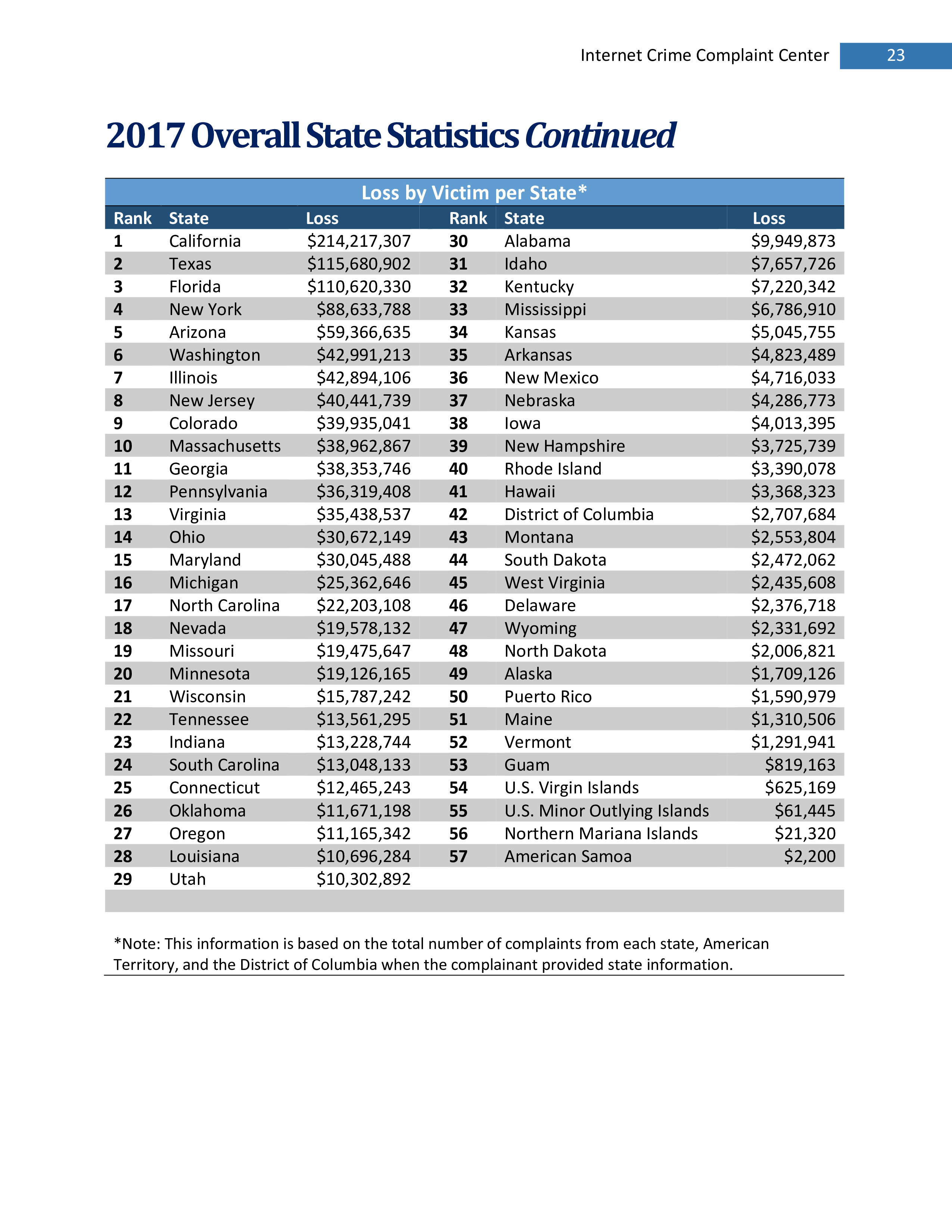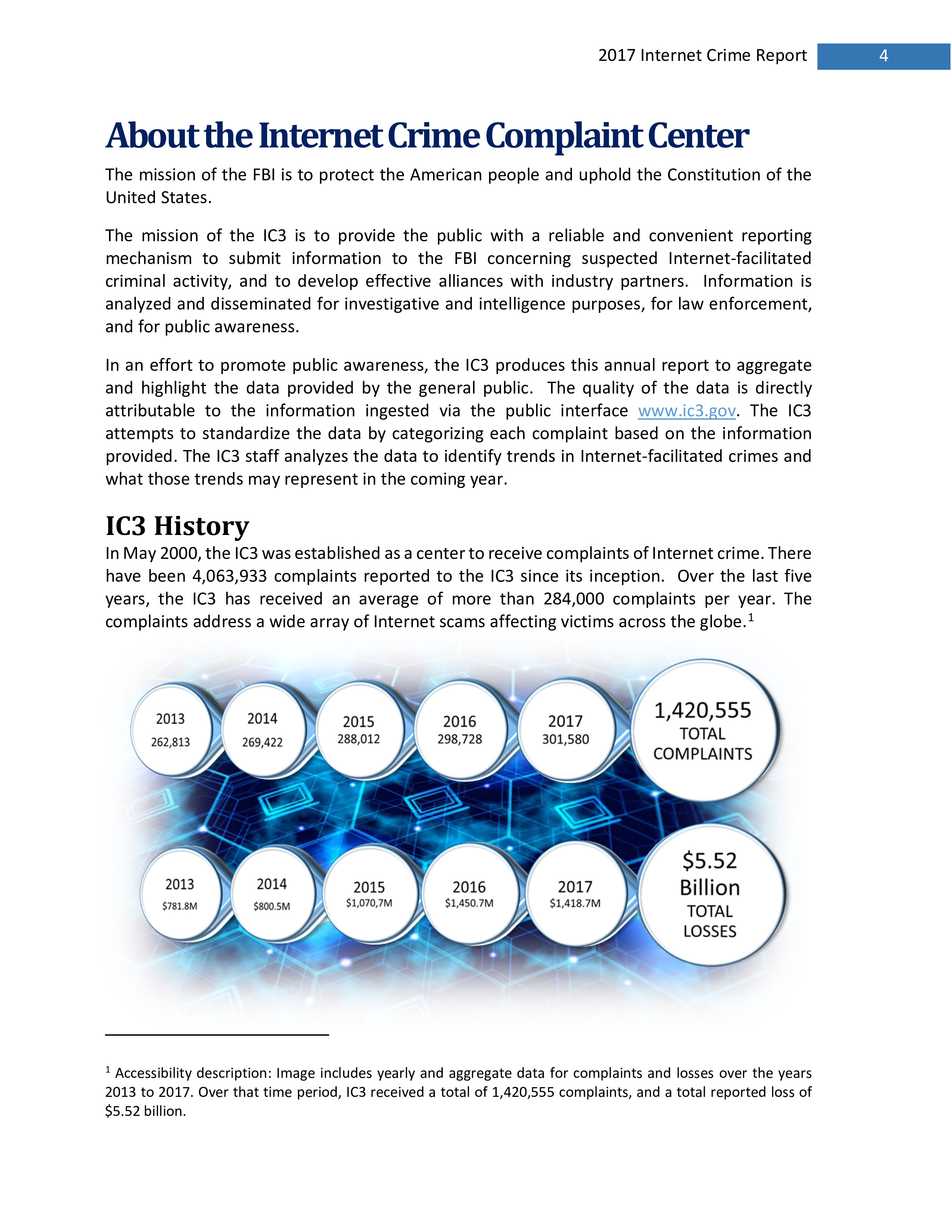 2017年,IC3共收到301,580起投诉,报告的损失超过14亿美元。在过去的一年里,受害者报告的最普遍的犯罪类型是不付款/未送达、个人数据泄露和网络钓鱼。报告损失最高的前三种犯罪类型是BEC、浪漫欺诈和不付款/未送达。