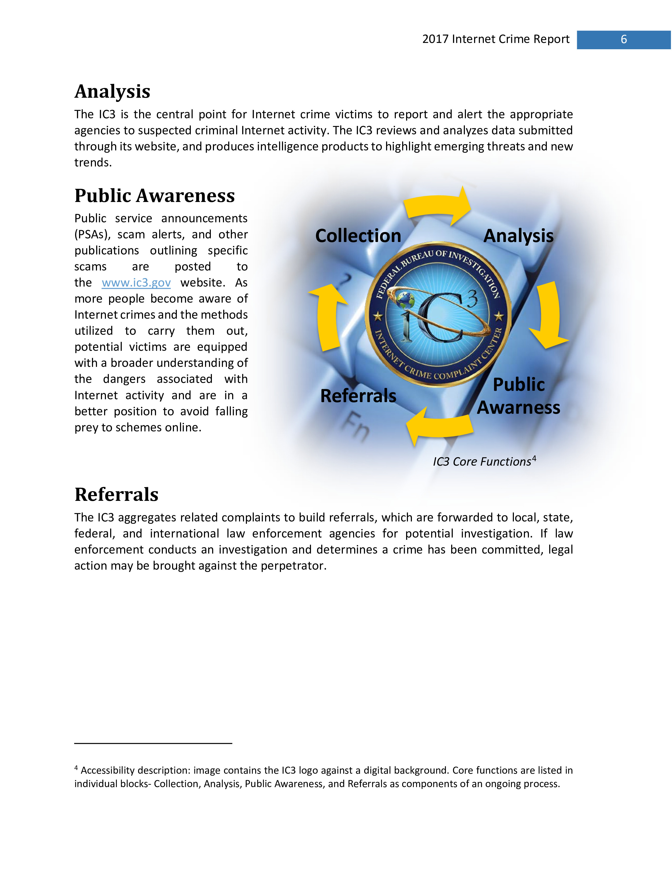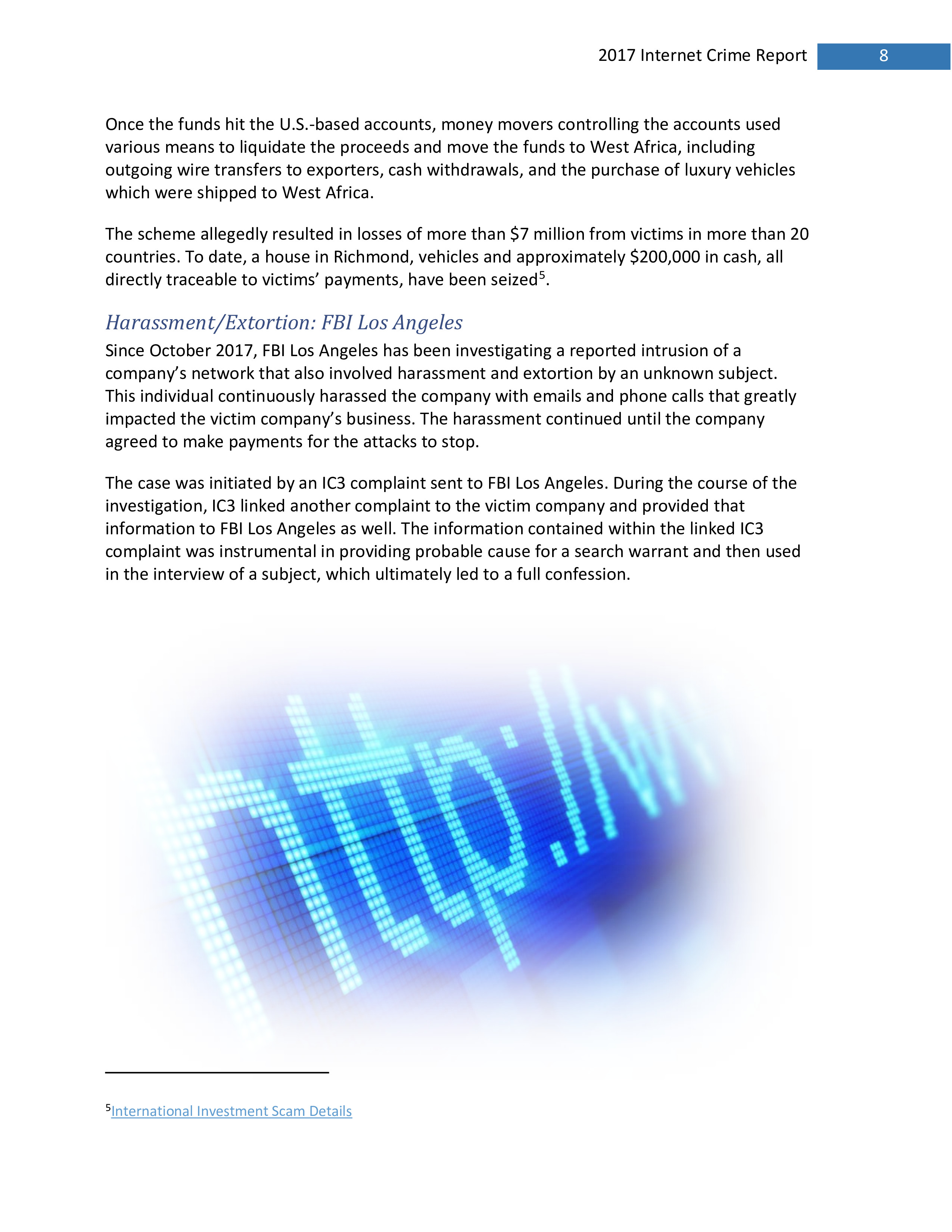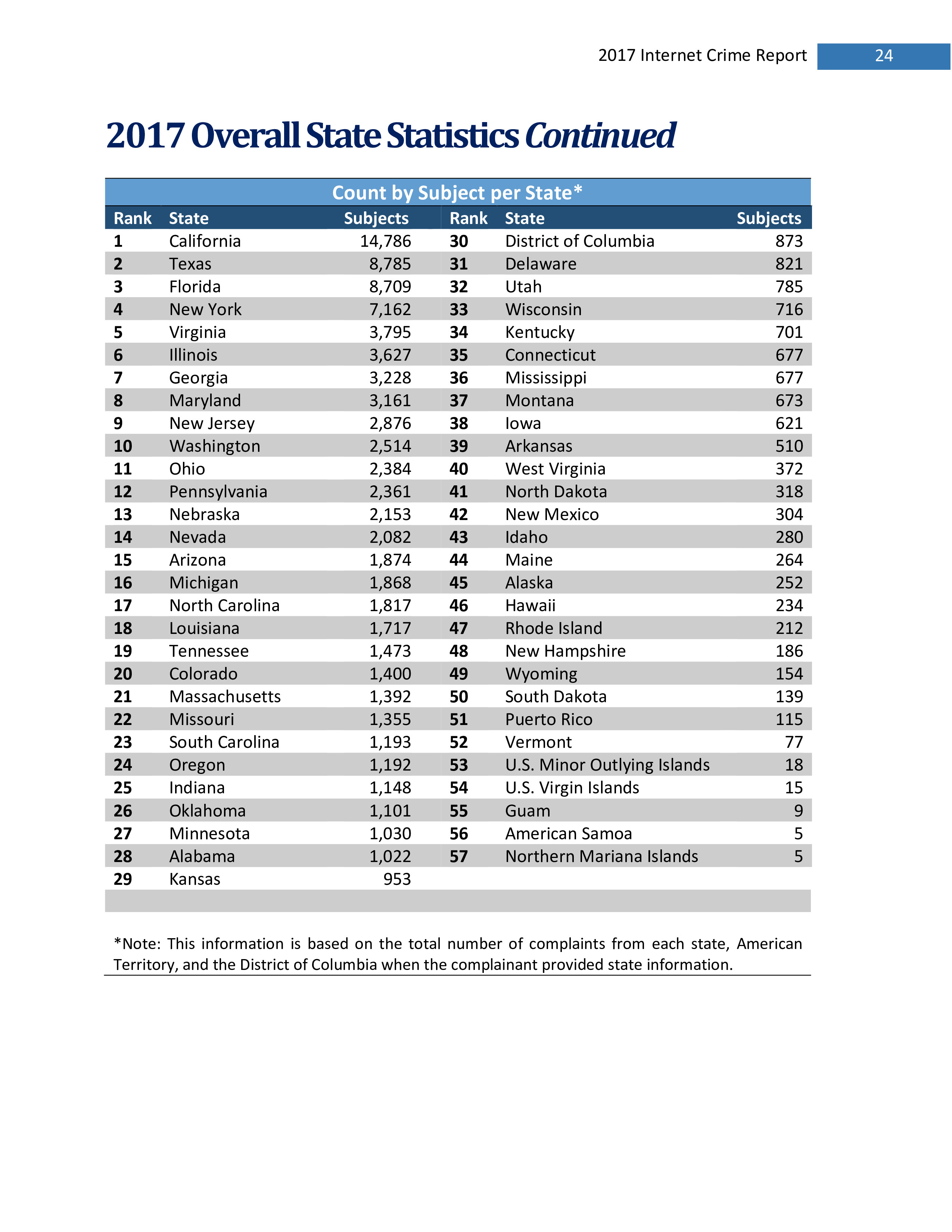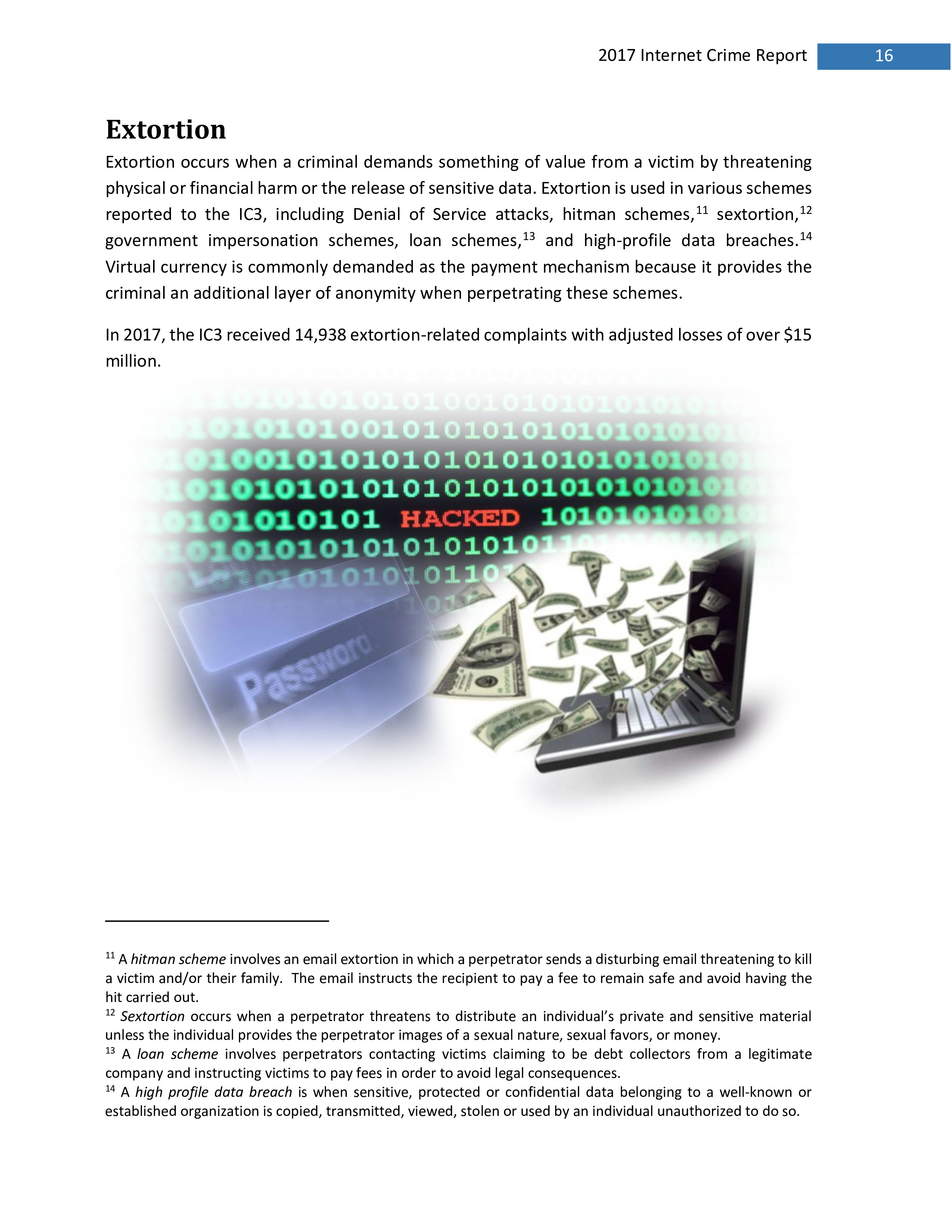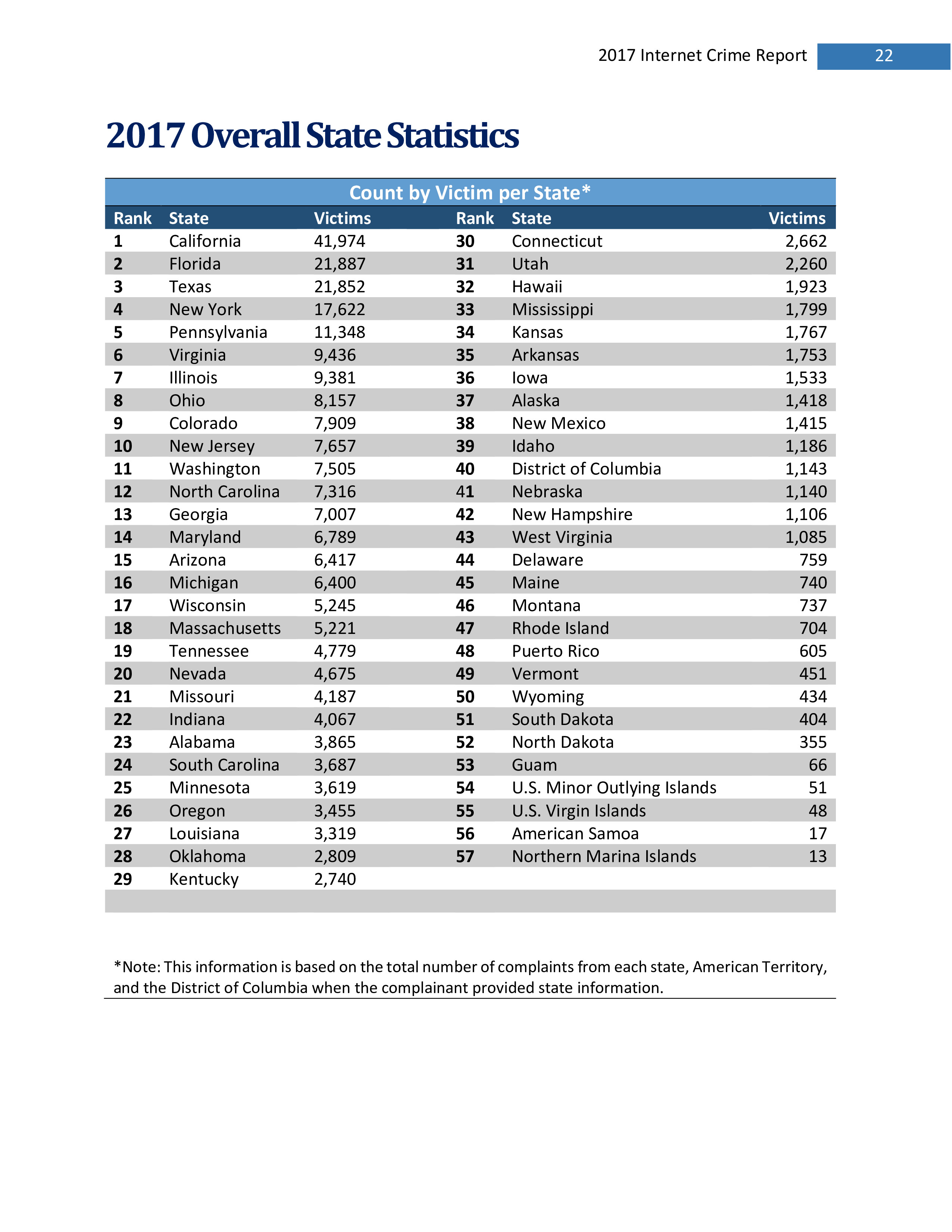 2017年,IC3共收到301,580起投诉,报告的损失超过14亿美元。在过去的一年里,受害者报告的最普遍的犯罪类型是不付款/未送达、个人数据泄露和网络钓鱼。报告损失最高的前三种犯罪类型是BEC、浪漫欺诈和不付款/未送达。