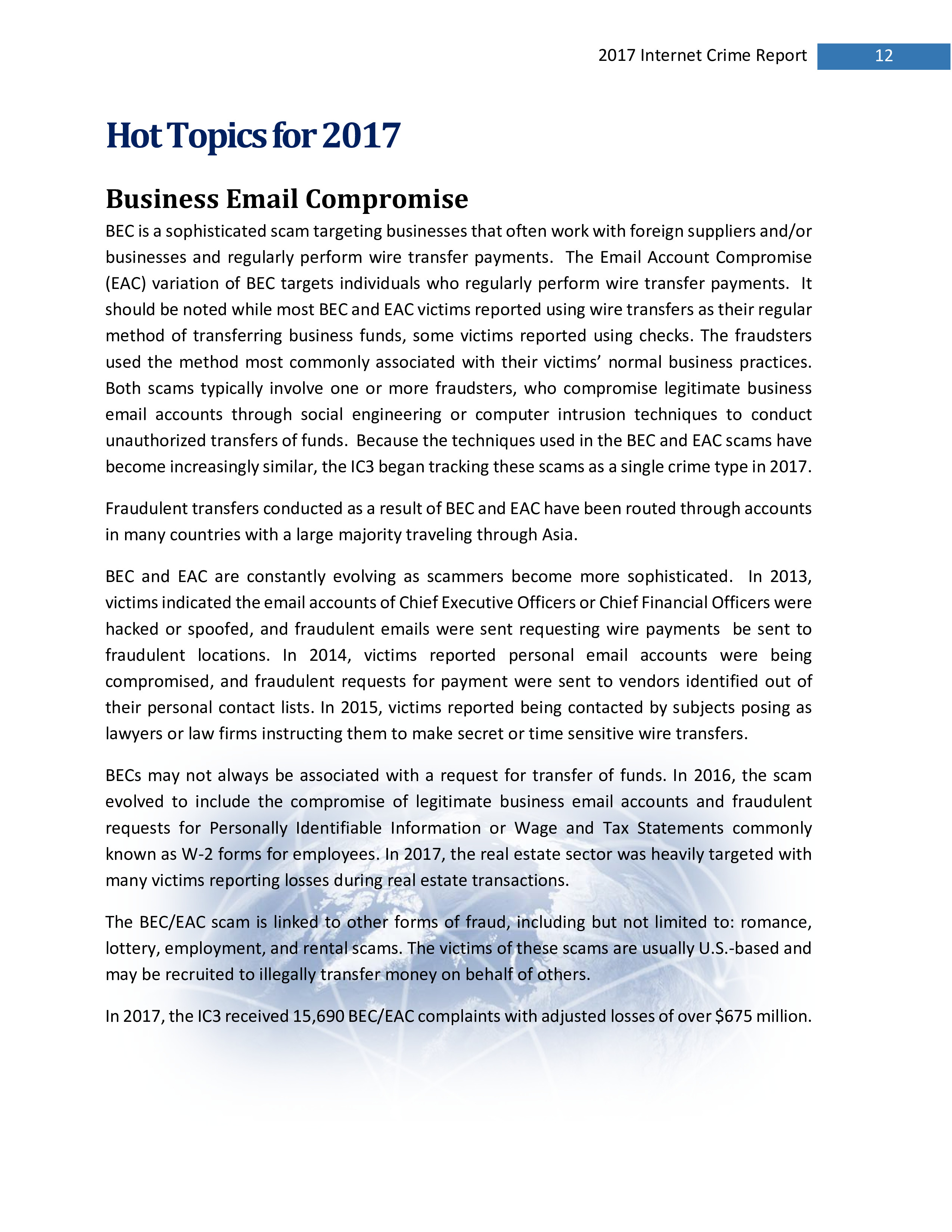 BEC通常是针对企业的复杂骗局,与外国供应商合作,定期执行电汇付款。而且,这有可能转变成针对个人的EAC。大多数BEC和EAC受害者使用电汇作为转移资金的常规方法,但一些受害者也使用支票。2017年IC3共收到15690件BEC/EAC投诉,损失超过6.75亿美元。