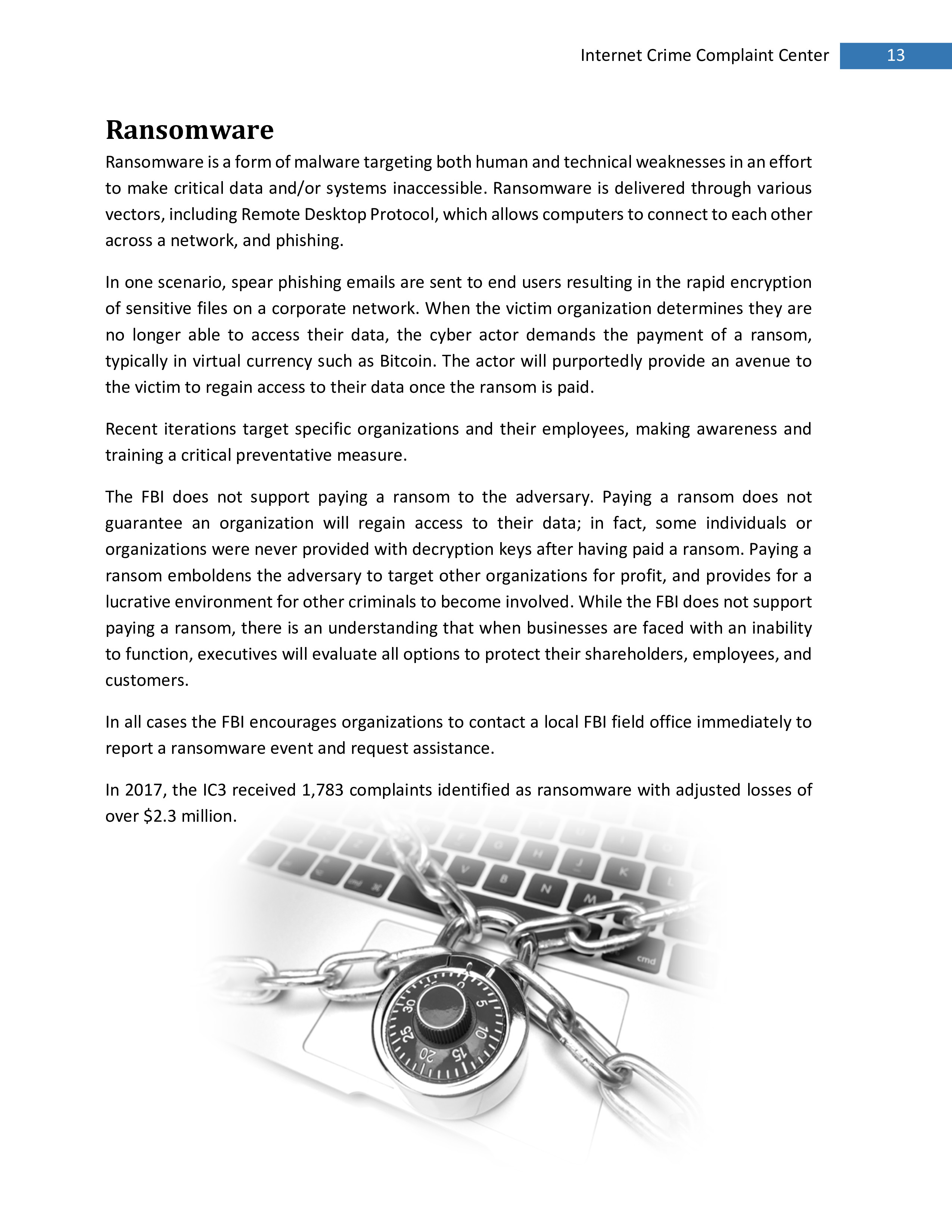 这是一种针对人为和技术弱点的恶意软件,旨在使关键数据和/或系统无法访问。2017年IC3共收到1783件被确认的勒索软件投诉,损失超过230万美元。