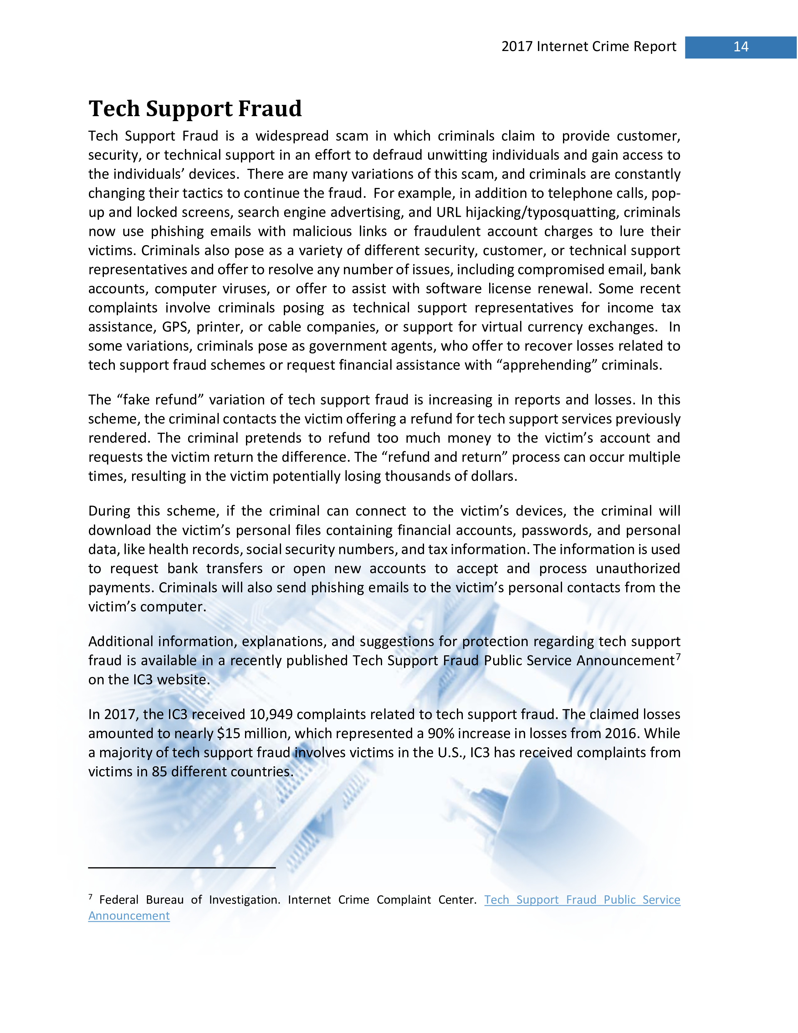 这是一种广泛的骗局,犯罪分子声称提供客户、安全或技术支持,以欺骗不知情的个人并获得对个人设备的访问权。2017年IC3收到10949起与技术支持的欺诈相关的投诉,损失接近1500万美元,比2016年增加了90%。