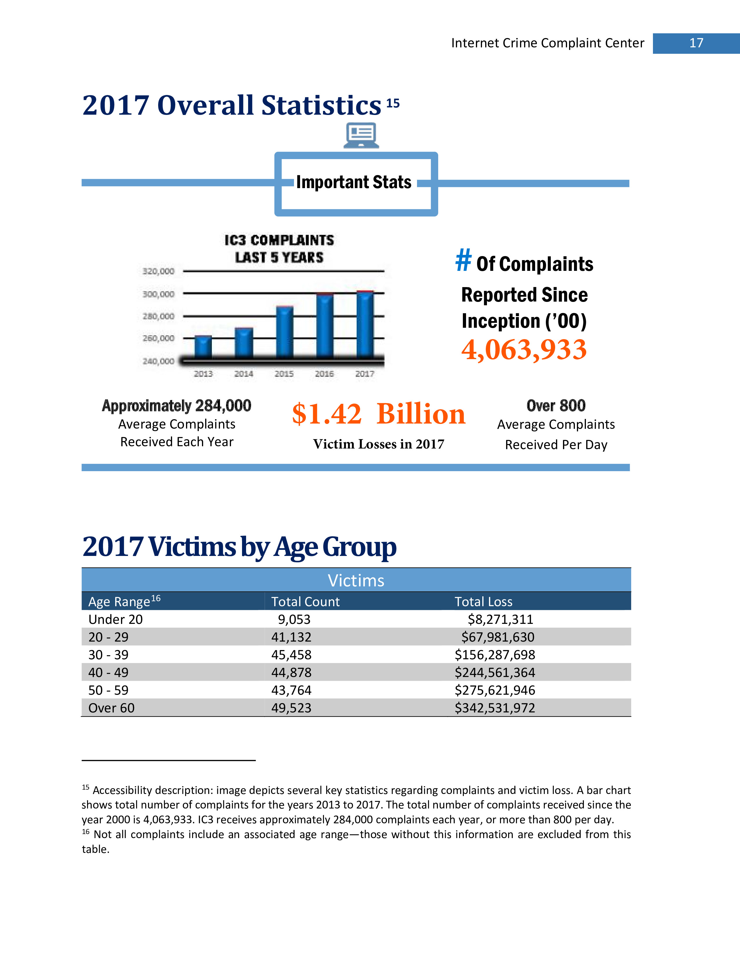 此外,美国老年人成为网络犯罪的受害者。2017年IC3收到49523件来自60岁以上受害者的投诉,损失超过3.42亿美元。
