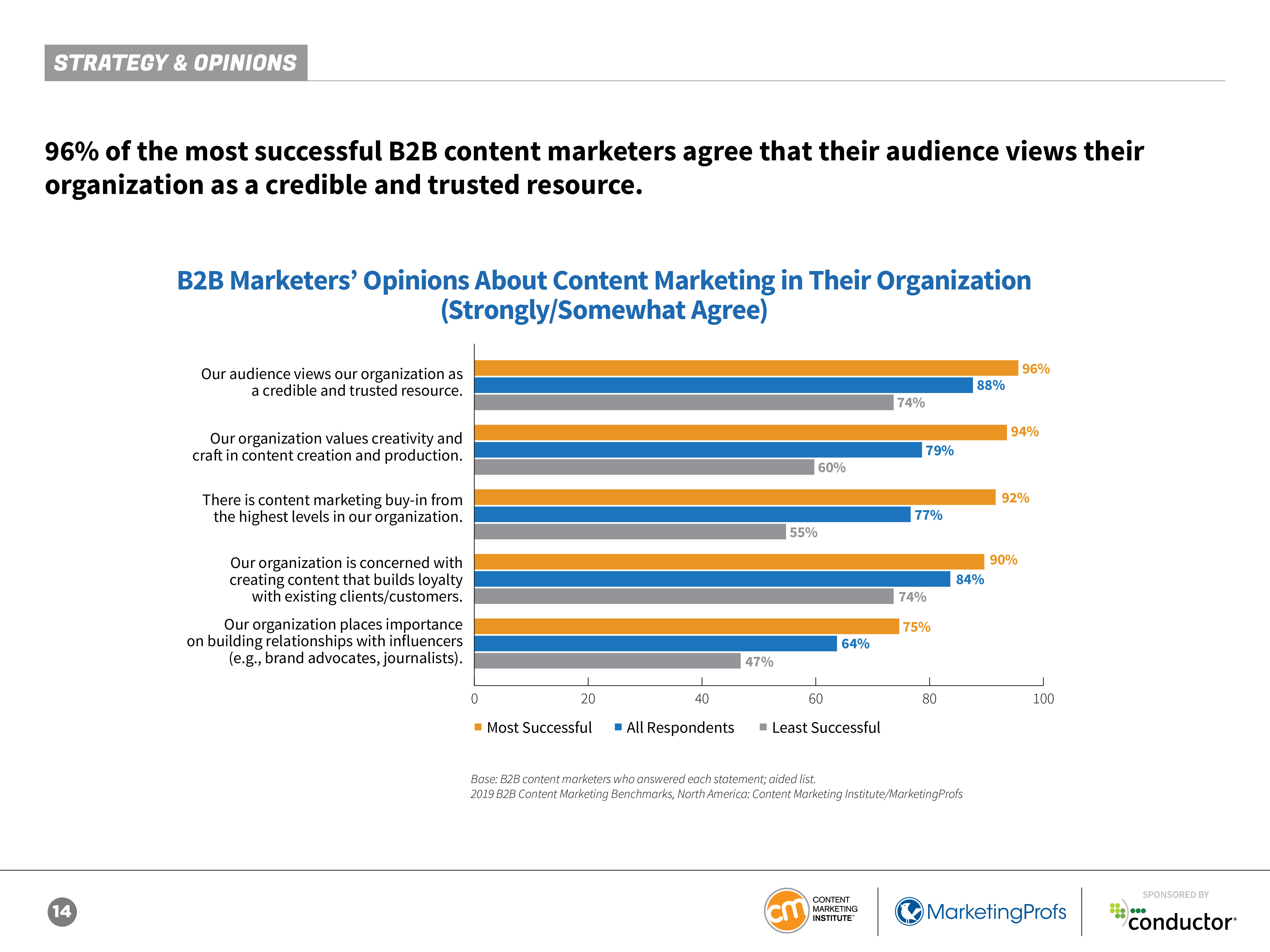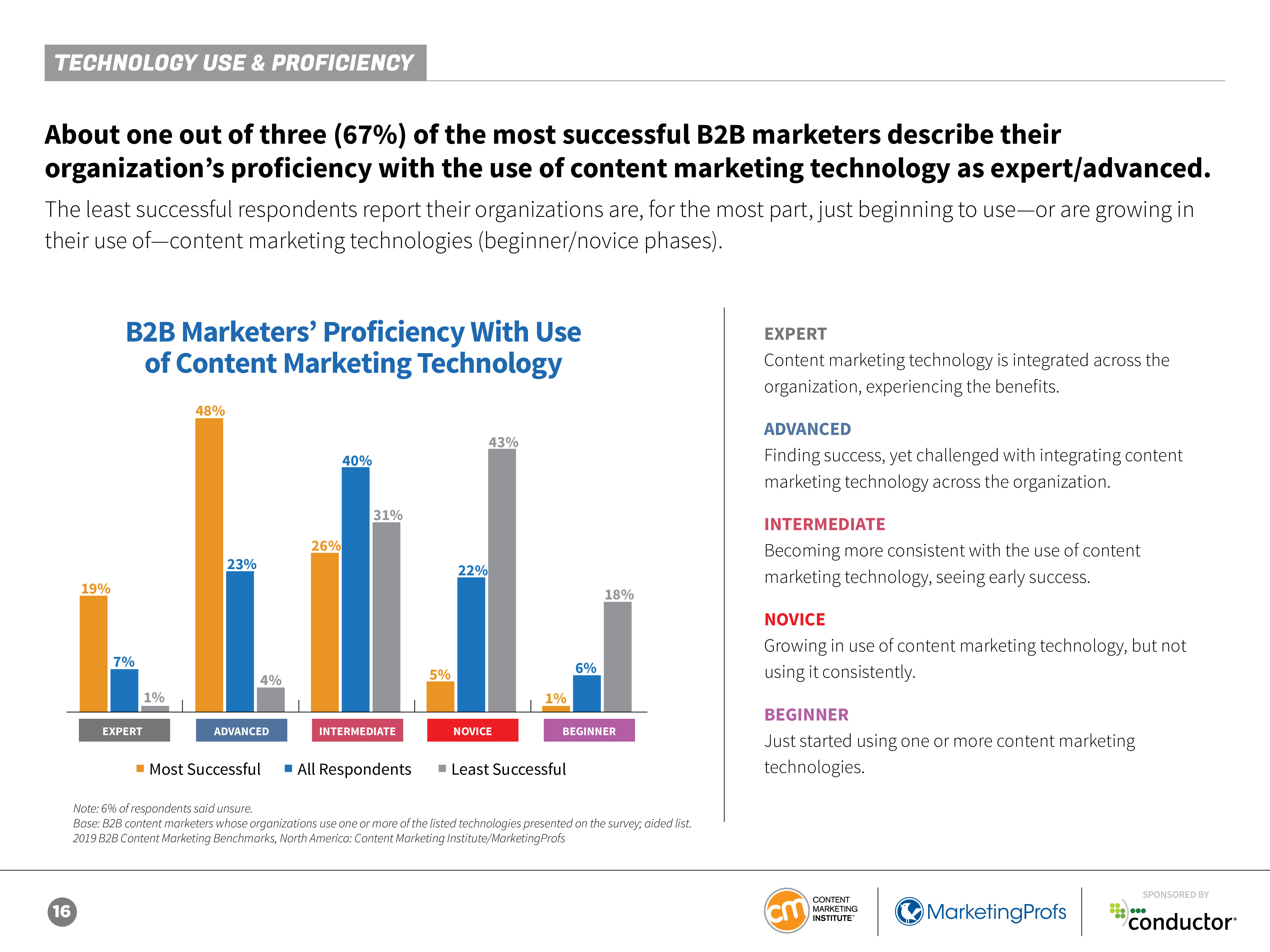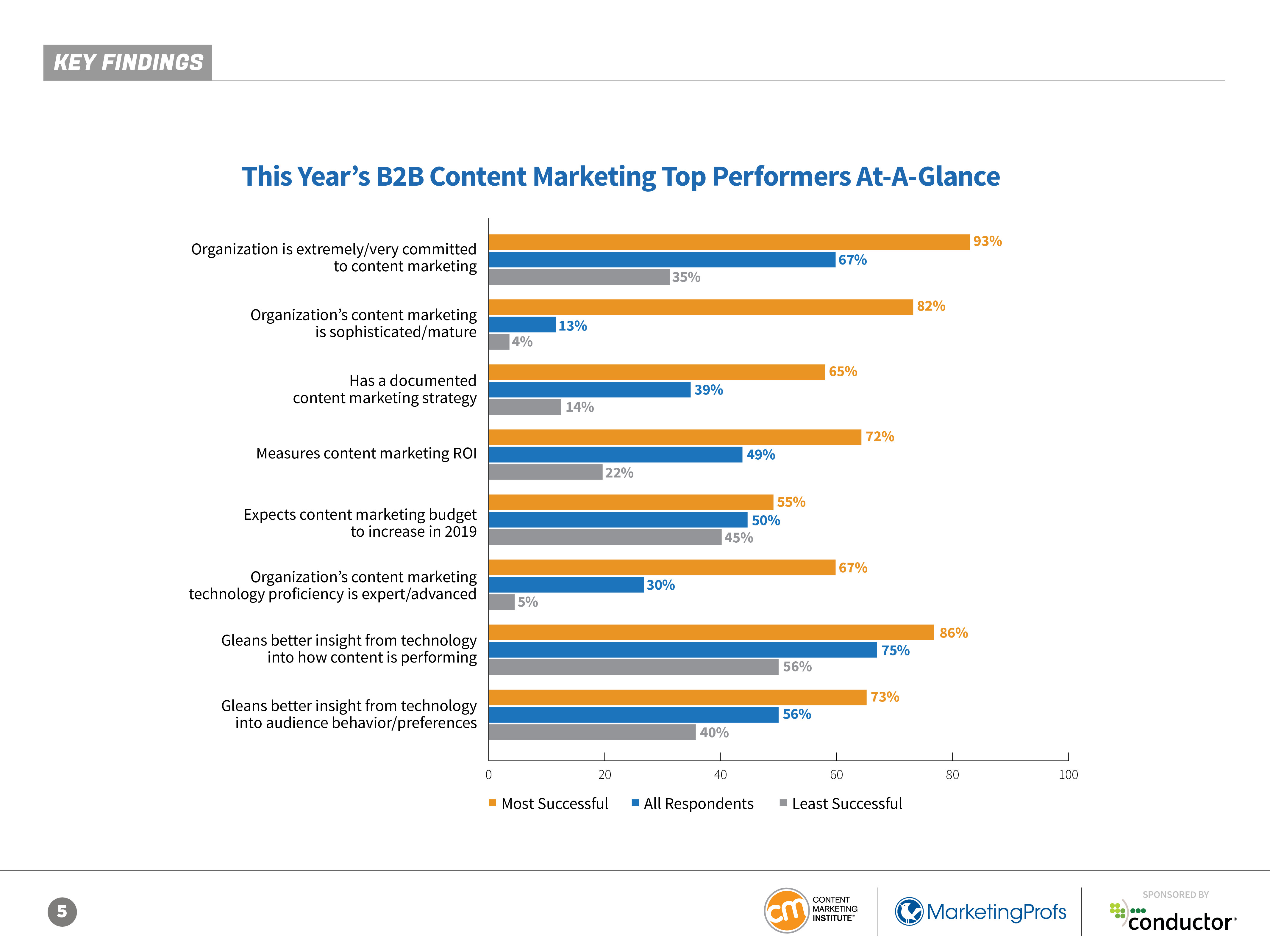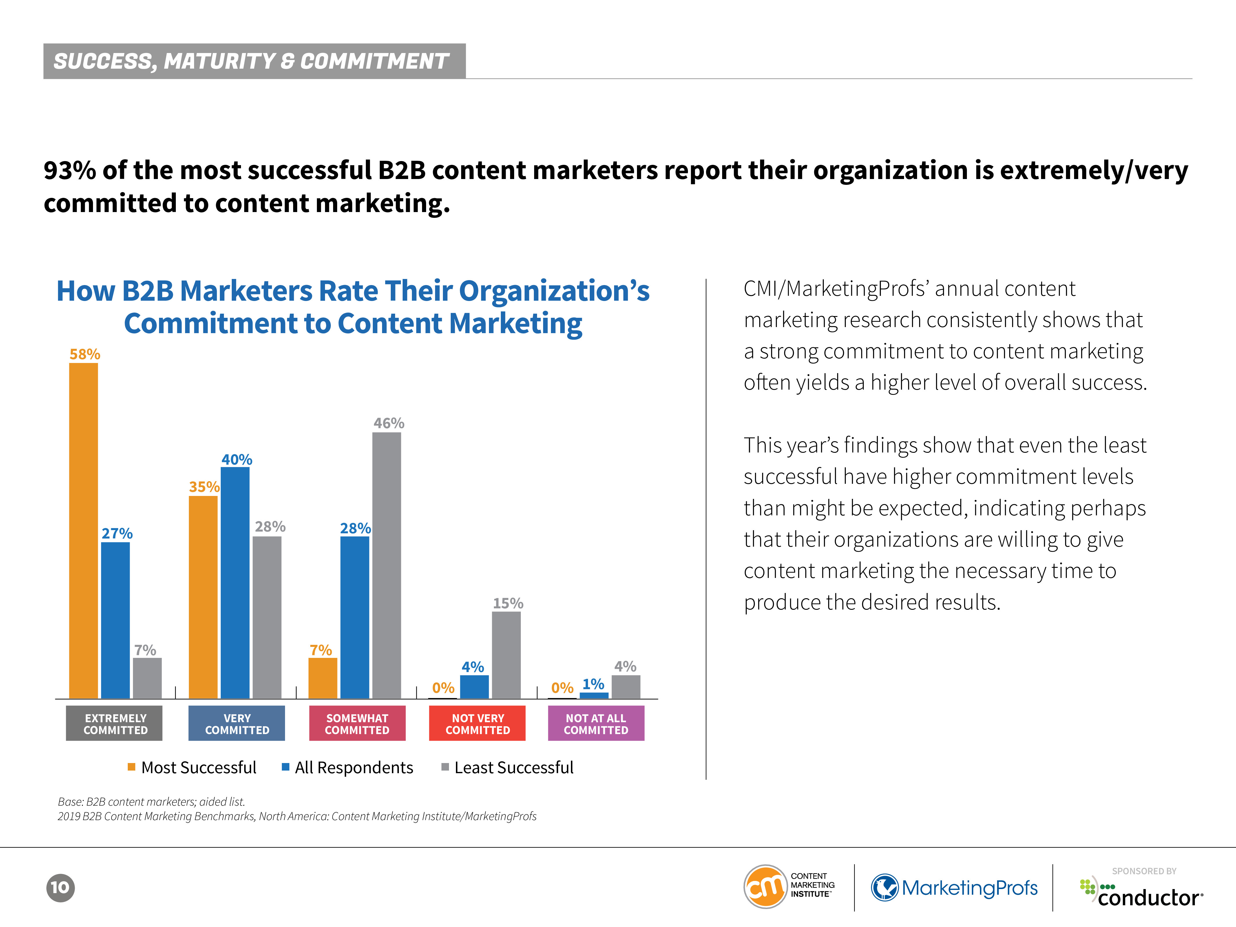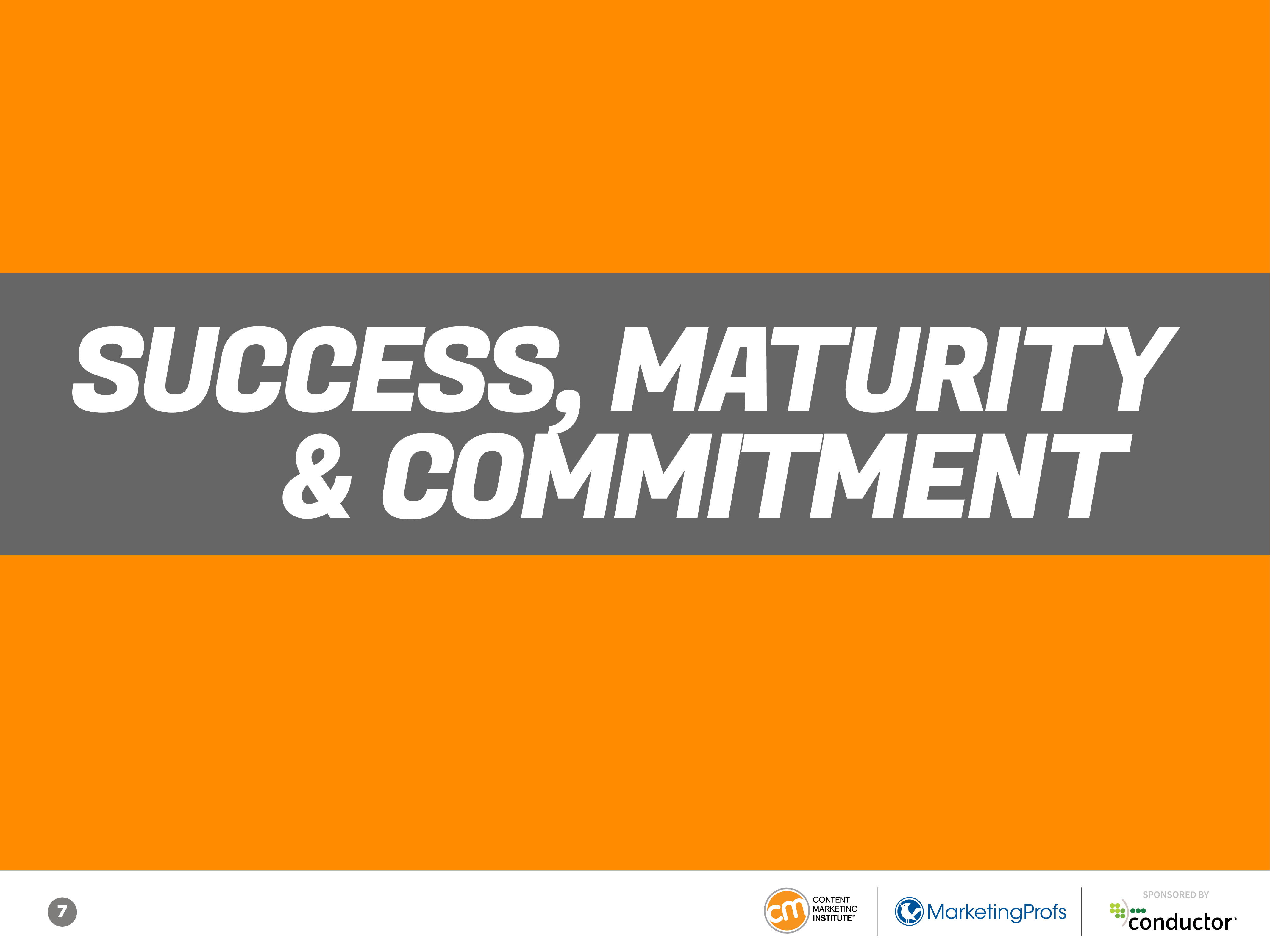 值得指出的是,93%的“成功”者表示内容营销对其组织极端(58%)或非常(35%)重要,但是在“不成功”者中只有35%这么表示。而且,“成功”者也更可能将其组织的内容营销成熟度描述为“成熟”(82% vs. 1/10)。