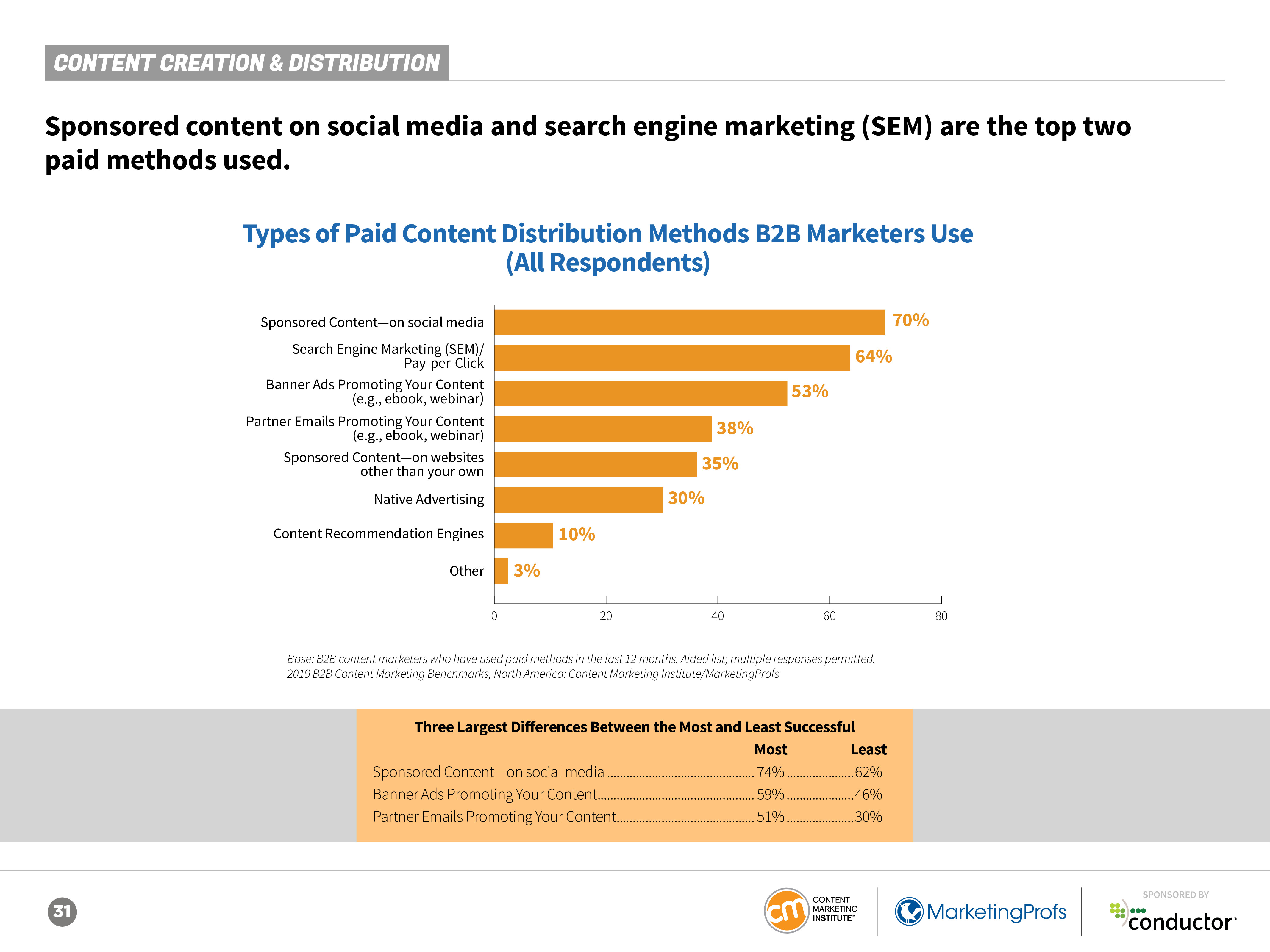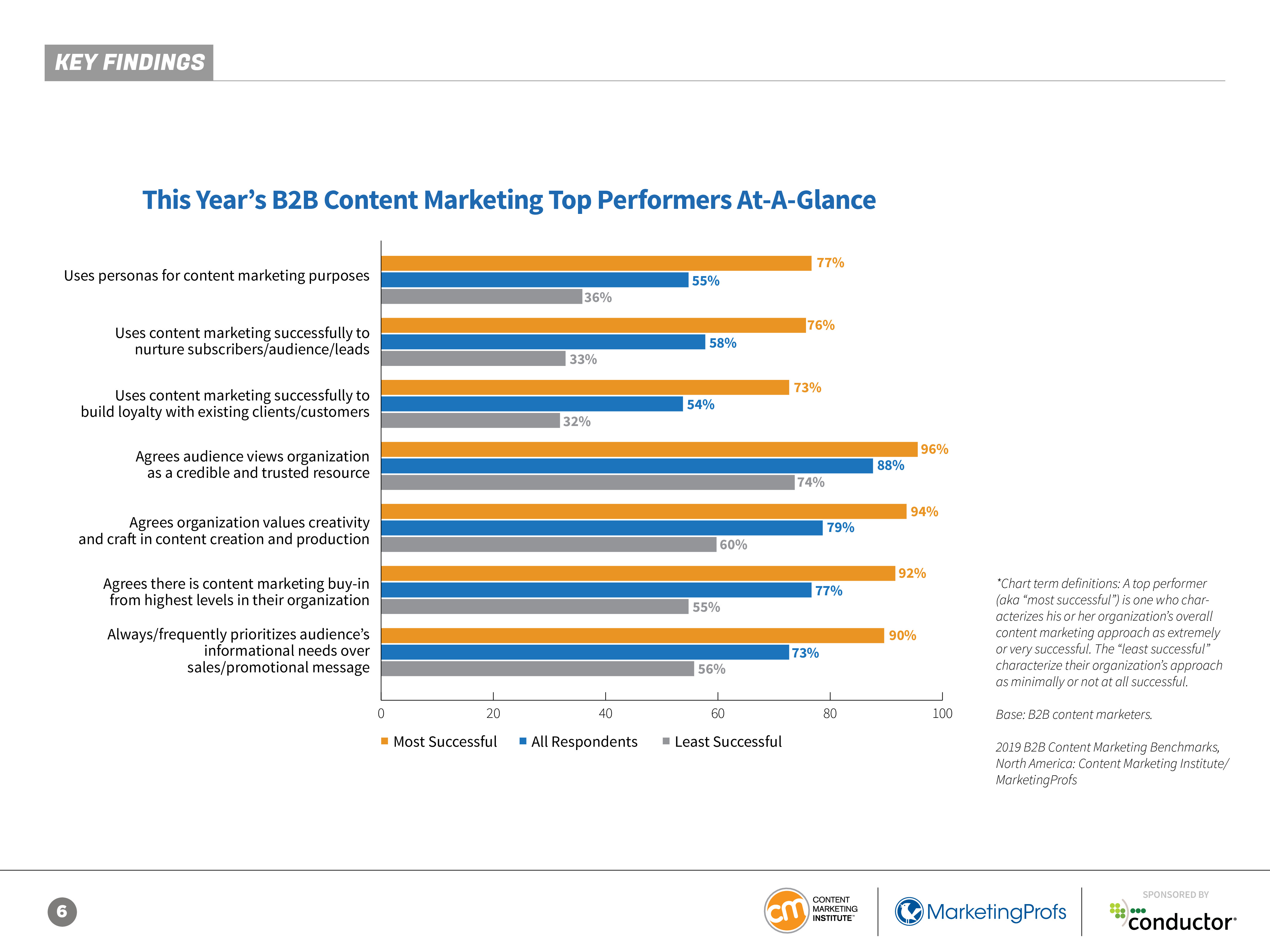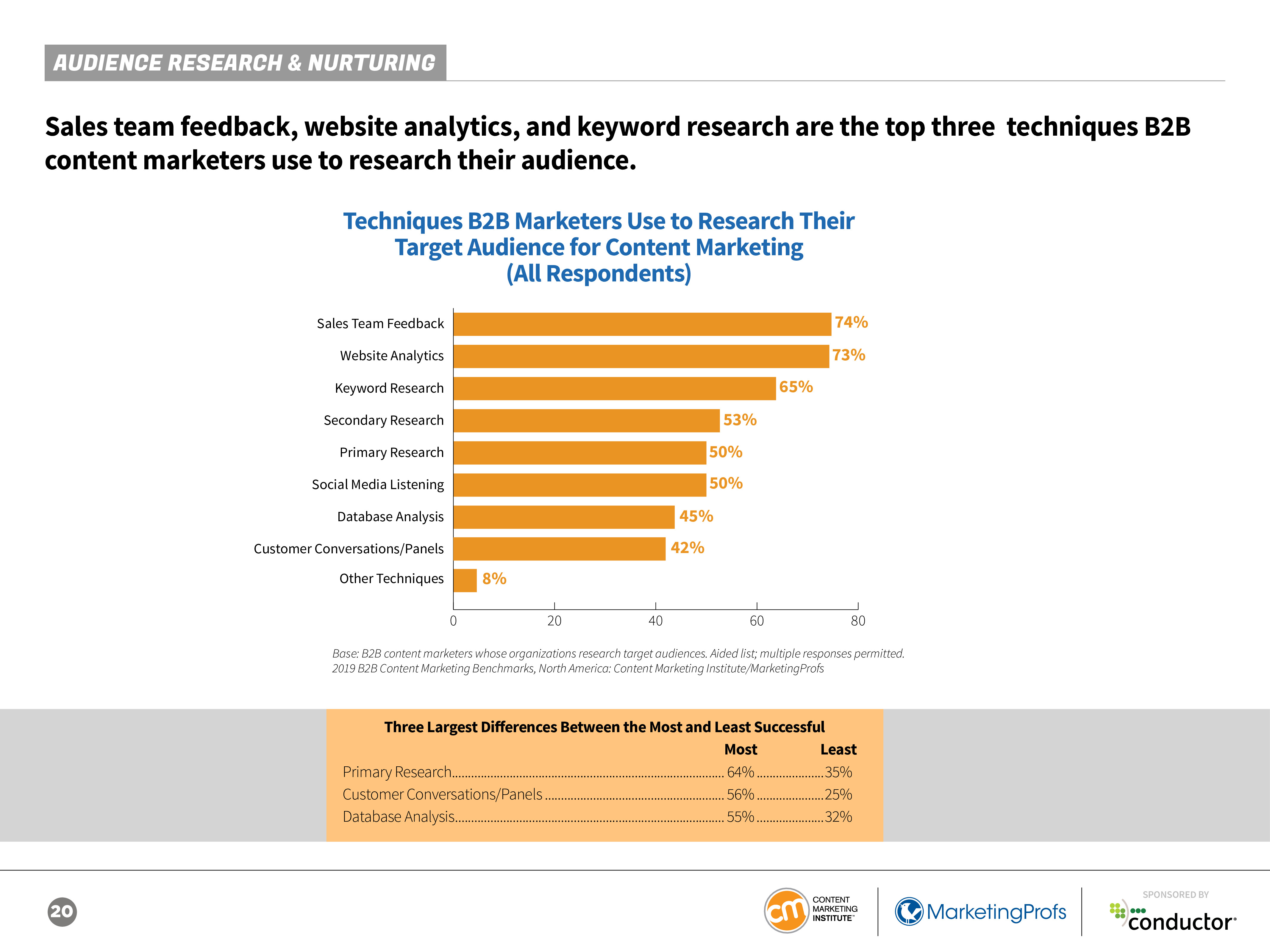 同时,营销人员用来研究目标受众的主要技术包括销售团队反馈(74%)、网站分析(73%)和关键词研究(65%)等。而“成功”和“不成功”的营销人员之间的最大差异表现在初级研究、客户对话和数据库分析使用等。