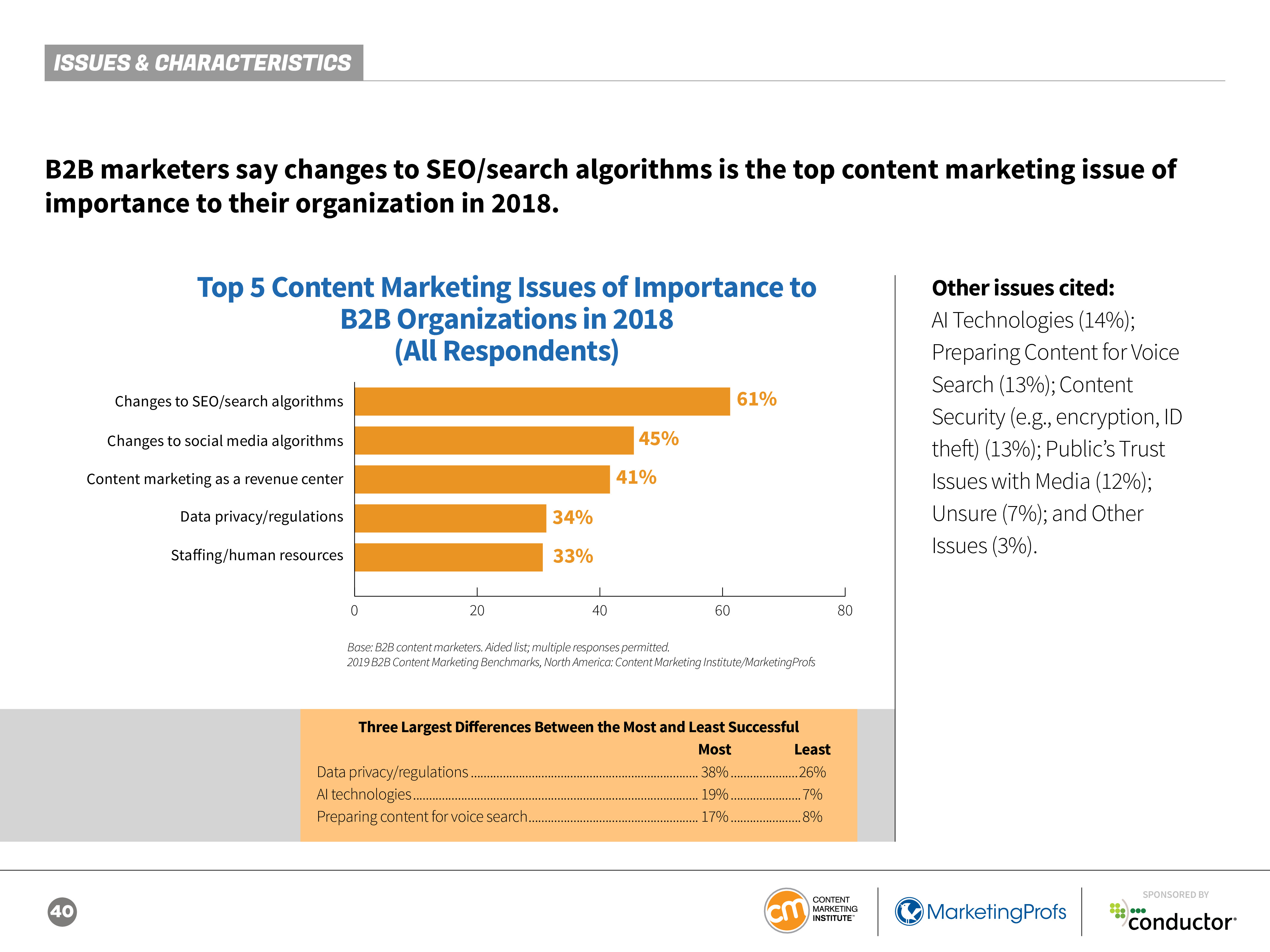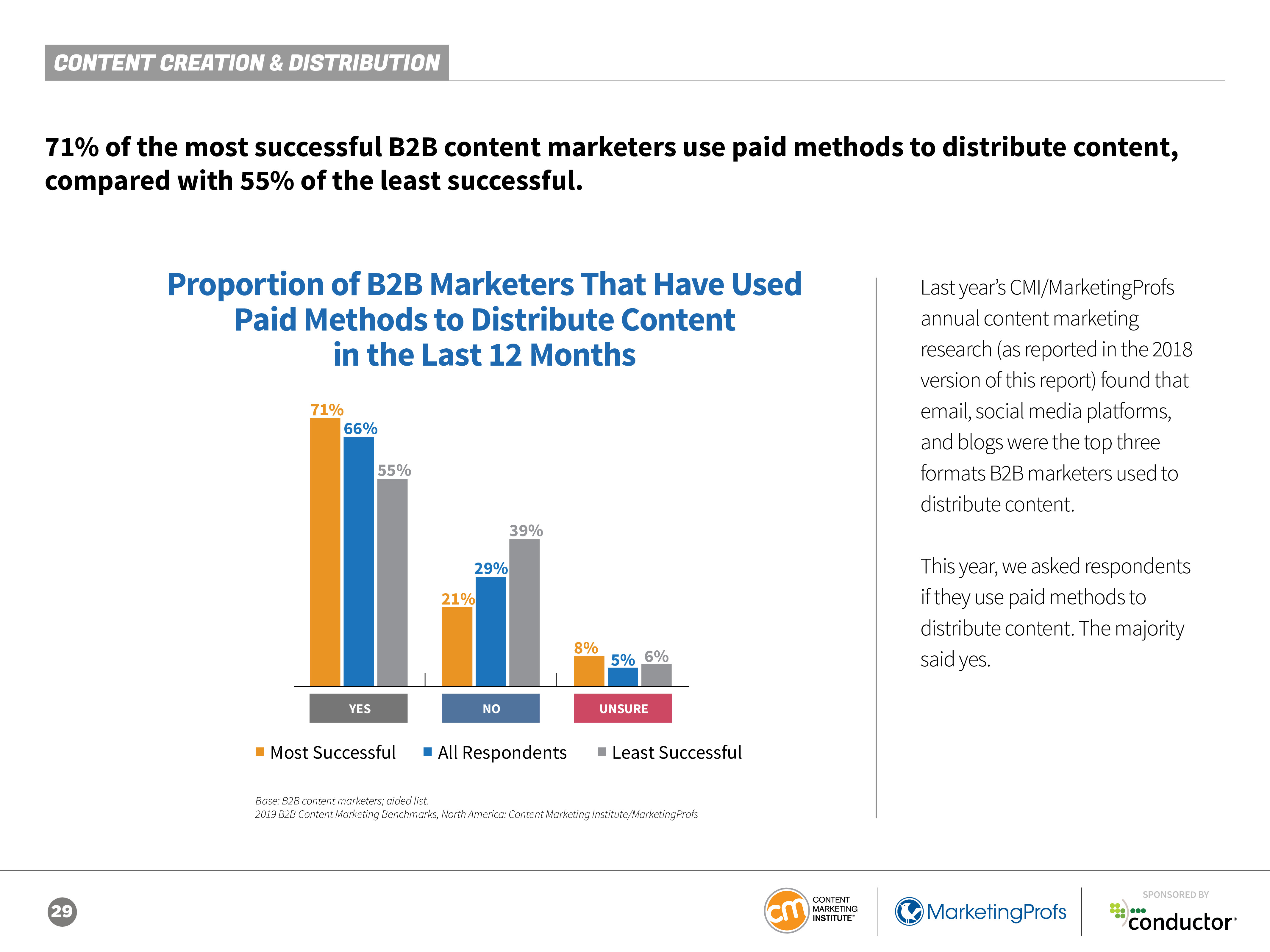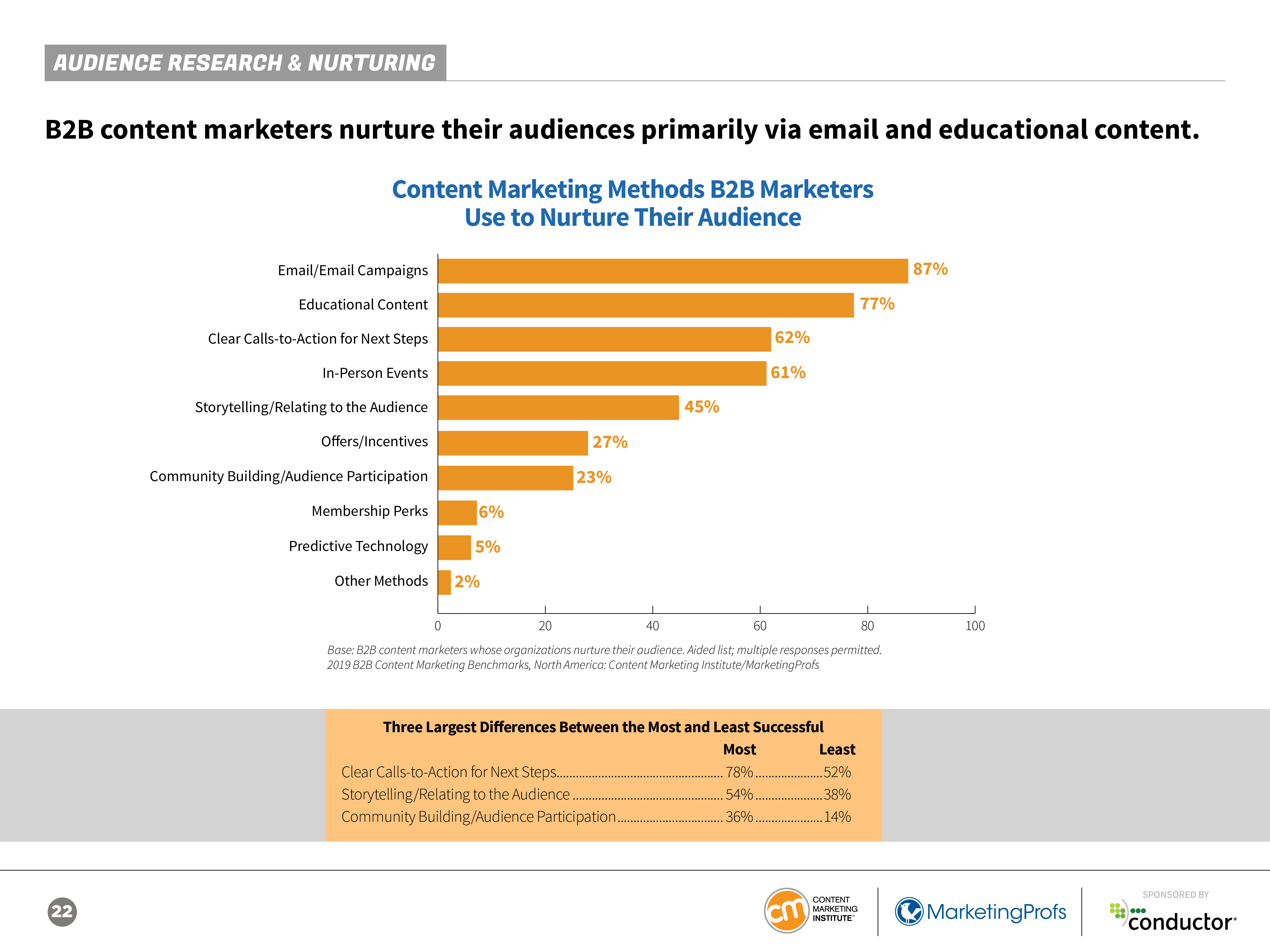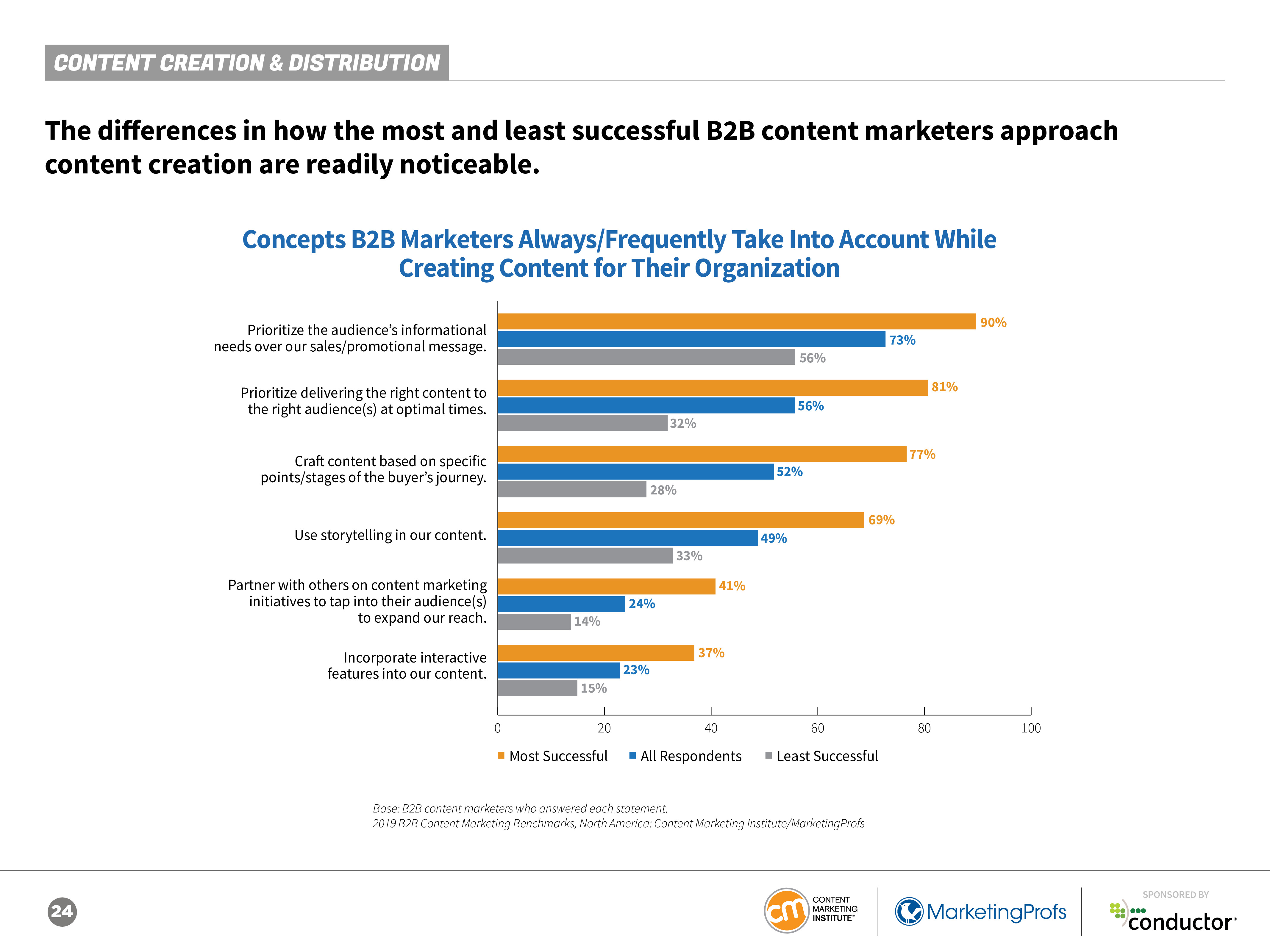 通过比较内容营销“成功”和“不成功”的受访者,是否将受众的信息需求作为优先考虑方面有很大差异。9/10的“成功”者优先考虑受众需求,只有56%的“不成功”者这么表示。
