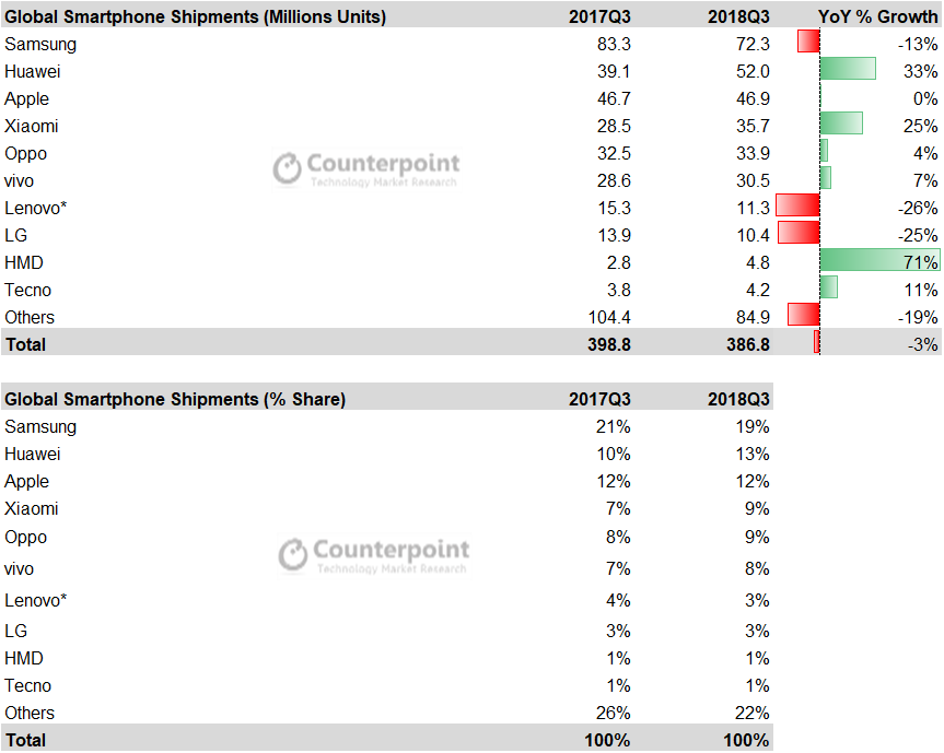 Counterpoint发布2018年第三季度全球手机市场出货量报告。2018年第三季度全球共销售3.868亿部手机,因中国等市场需求疲软出货量继续下跌;中国品牌则在国内销售低迷,海外销量创新高。