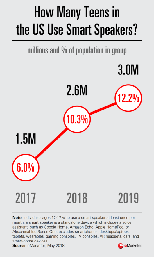 今年,260万青少年(12至17岁)至少每月使用一次智能音箱,占青少年人口的10.3%,比2017年增长71.2%。