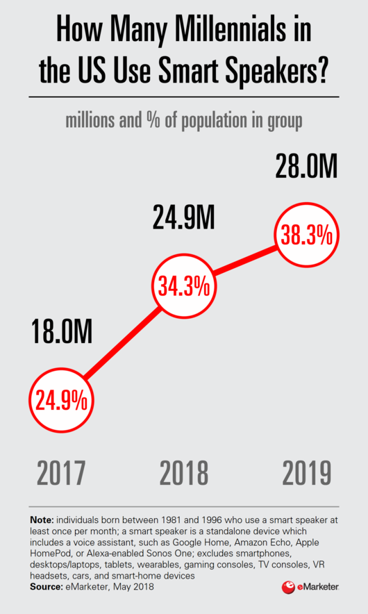 今年有2490万美国千禧一代使用智能音箱,占千禧一代人口的1/3以上,比2017年增长38.3%。