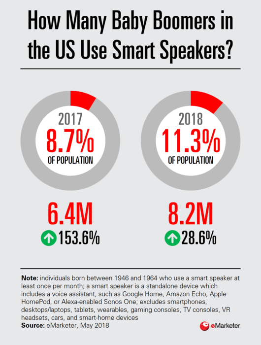 eMarketer预计,今年820万美国婴儿潮一代使用智能音箱,和去年比增长28.6%。