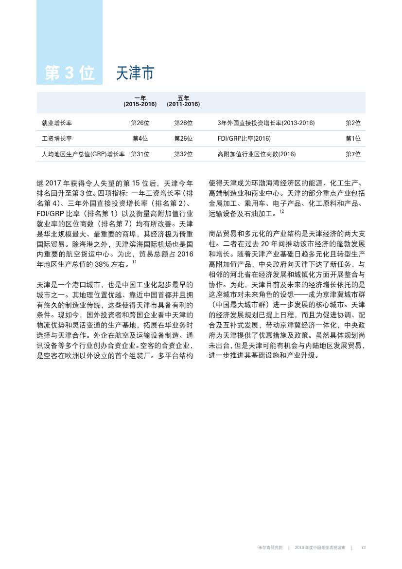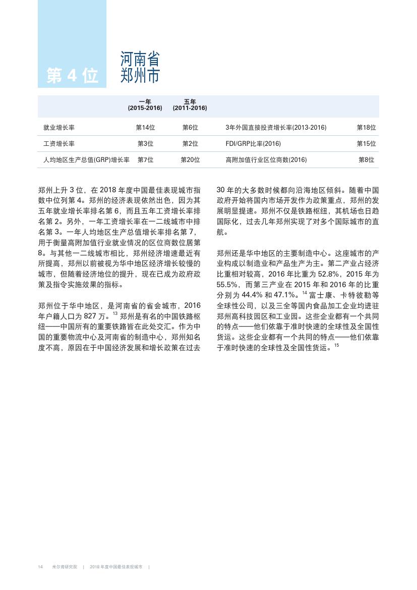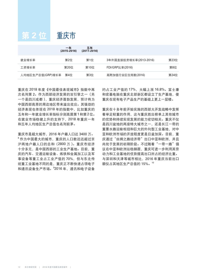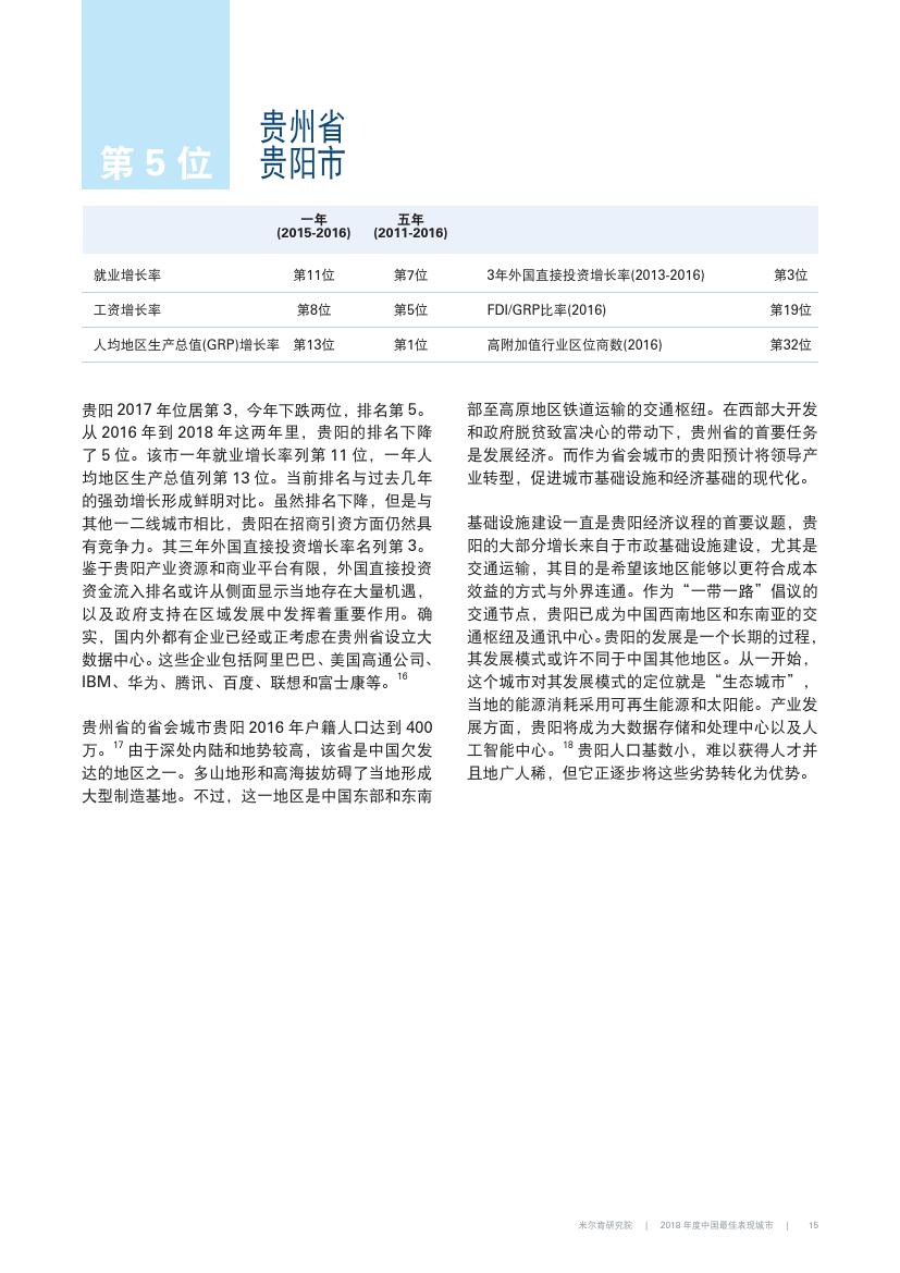 - 重庆在大城市组别中位居次席。加上四川省的成都市(排名第7),这两个城市现在是中国西部经济增长的引擎。与北京、上海和深圳等其他起步较早的发达城市相比,重庆和成都商业成本低。此外,这两个城市大力发展多元化产业,鼓励创业。所有这些举措都有助于促进经济发展。天津位列第3,其强劲的经济表现归功于高水平的外国直接投资和产业多元化,其中高附加值产业的贡献尤为突出。河南省郑州市和贵州省贵阳市分列第4 和第5 位。这两个城市近来都吸引了一批高附加值的创新型产业,实现了经济的腾飞。例如,郑州吸引富士康在当地设厂,全球大约一半的iPhone 手机都产自于此,使郑州成为“iPhone 之城”。贵阳不断深耕大数据行业。