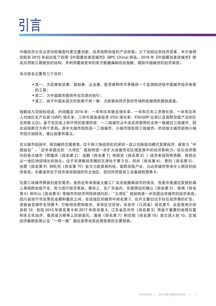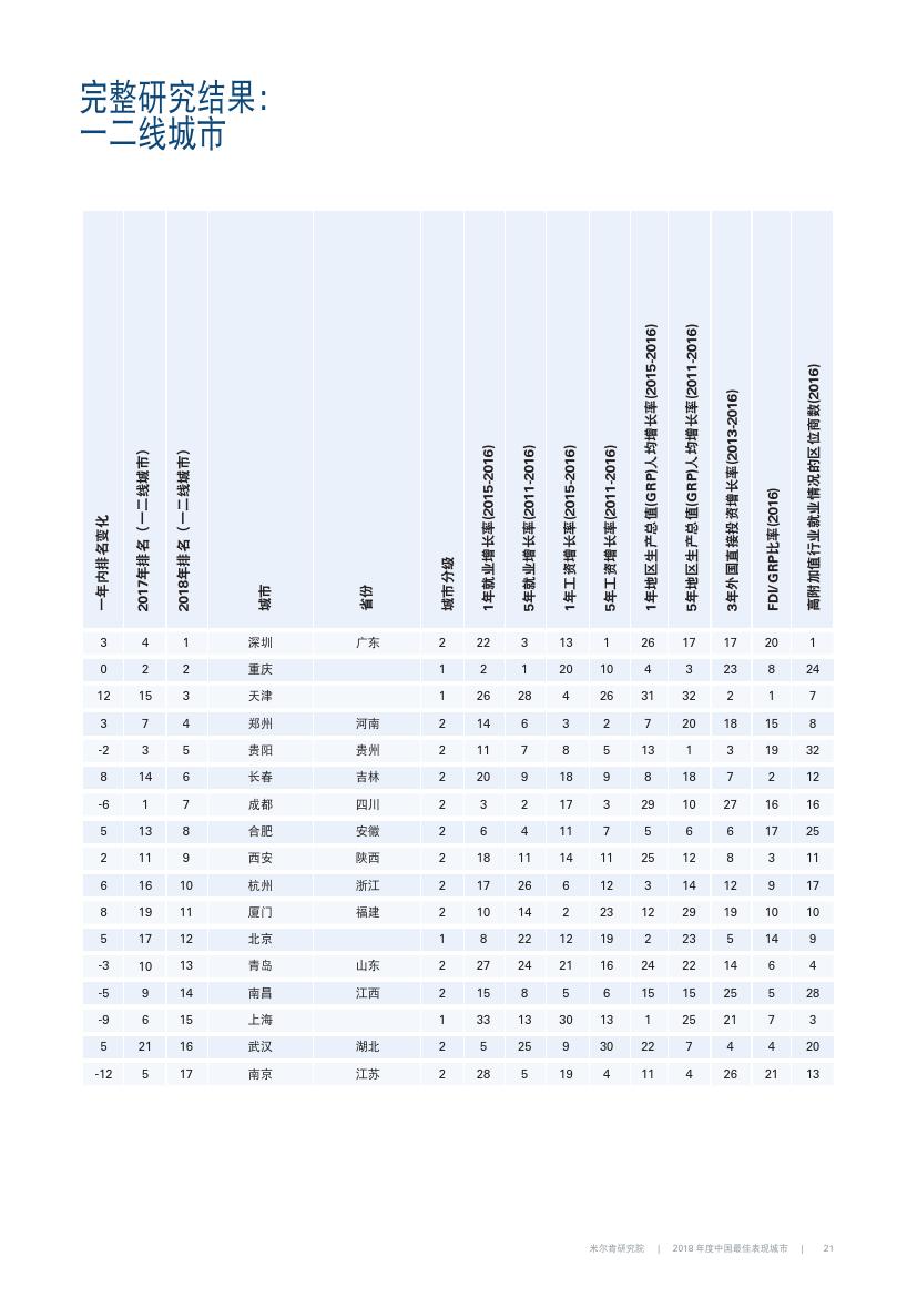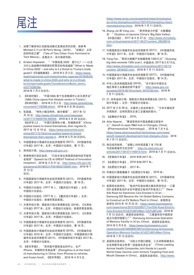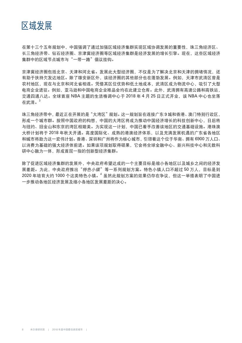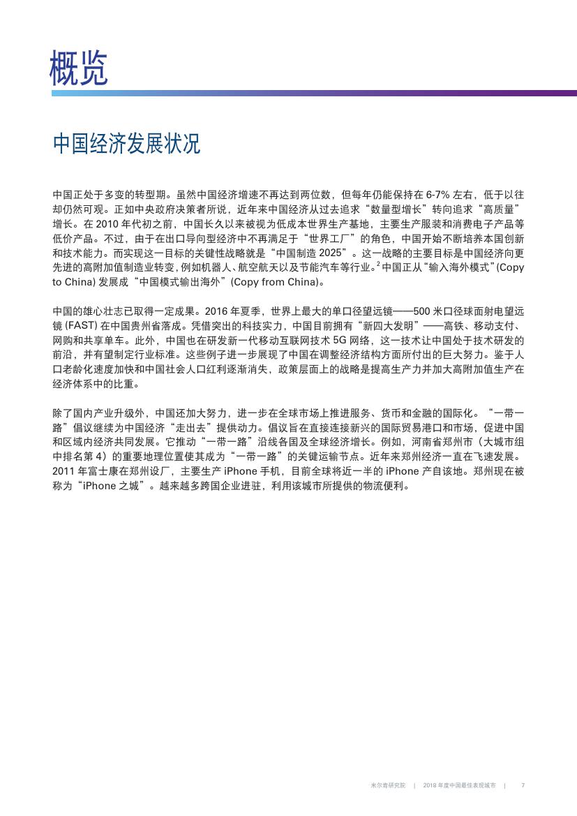 - 重庆在大城市组别中位居次席。加上四川省的成都市(排名第7),这两个城市现在是中国西部经济增长的引擎。与北京、上海和深圳等其他起步较早的发达城市相比,重庆和成都商业成本低。此外,这两个城市大力发展多元化产业,鼓励创业。所有这些举措都有助于促进经济发展。天津位列第3,其强劲的经济表现归功于高水平的外国直接投资和产业多元化,其中高附加值产业的贡献尤为突出。河南省郑州市和贵州省贵阳市分列第4 和第5 位。这两个城市近来都吸引了一批高附加值的创新型产业,实现了经济的腾飞。例如,郑州吸引富士康在当地设厂,全球大约一半的iPhone 手机都产自于此,使郑州成为“iPhone 之城”。贵阳不断深耕大数据行业。