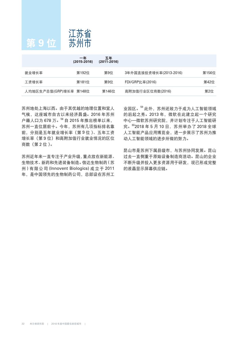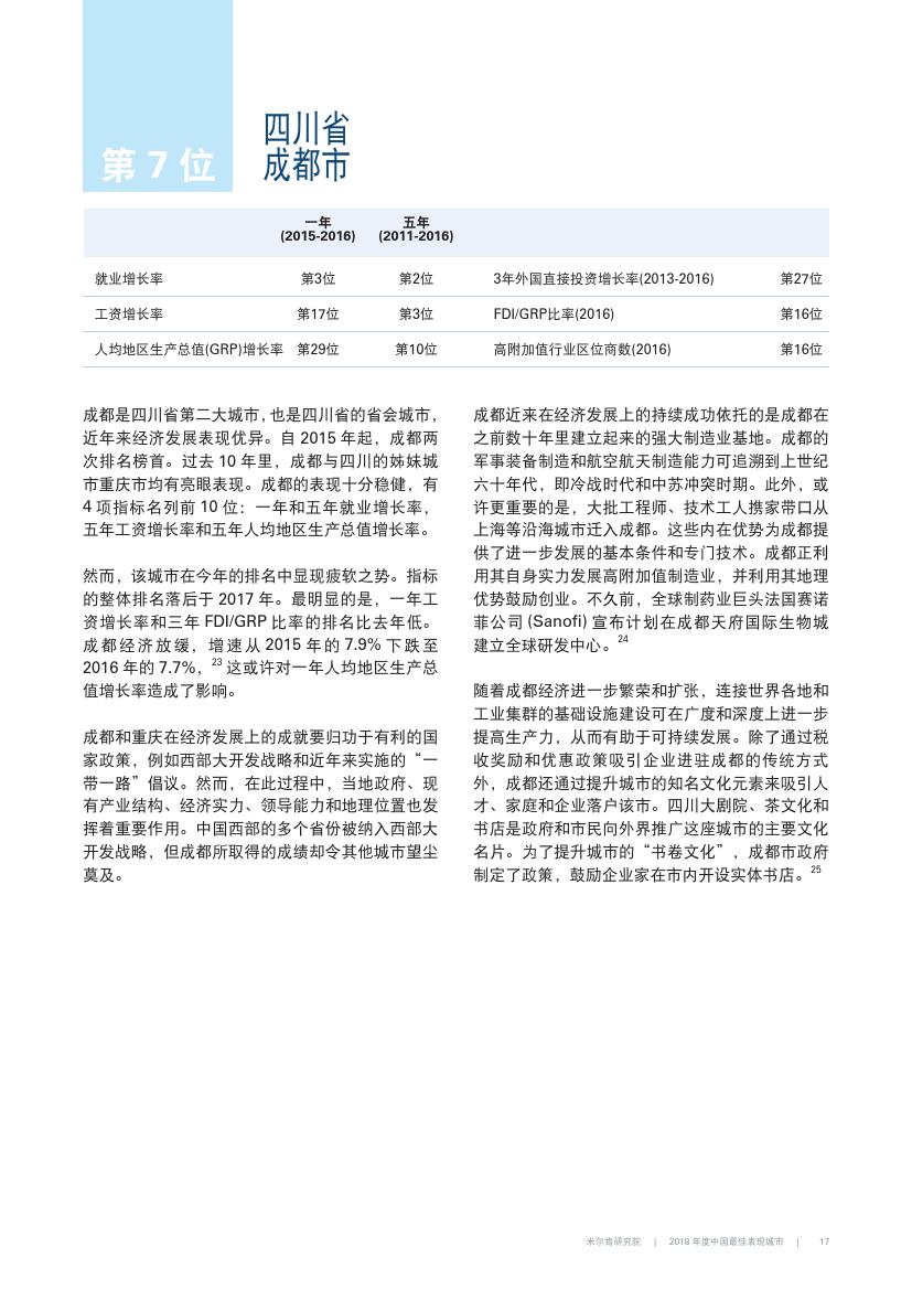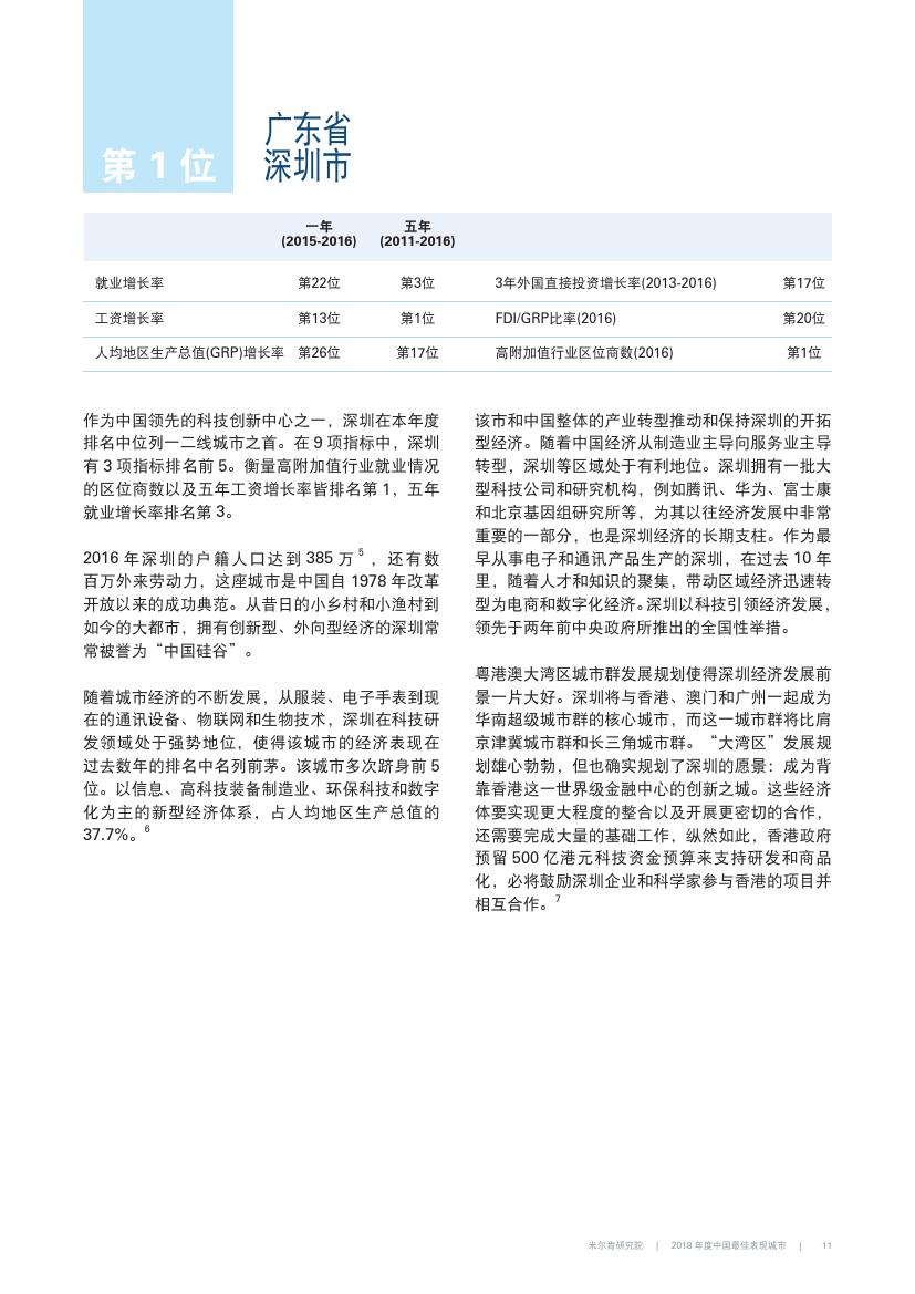 - 广东省深圳市今年在大城市中名列第1,而过去连续两年屈居第4。深圳从低成本制造业基地(主要生产电子产品)转型为重视创新和高附加值的科技中心,目前被誉为“中国硅谷”。这座城市近年来成绩斐然,主要得益于其友善的营商政策和开放的创业环境。