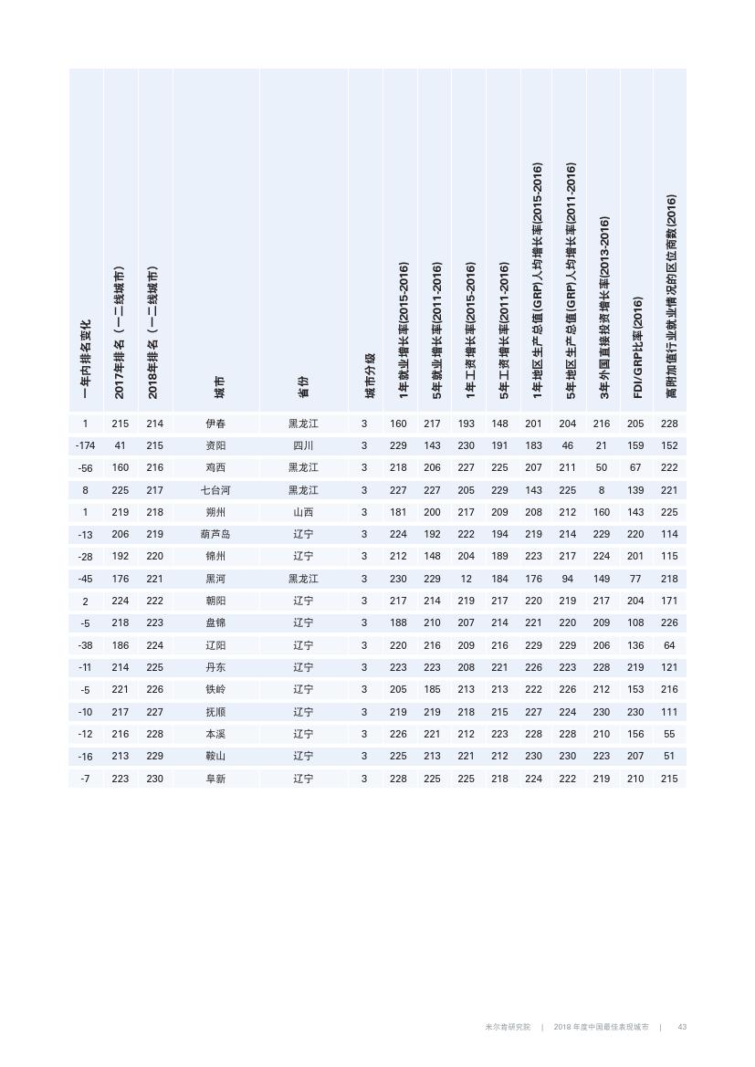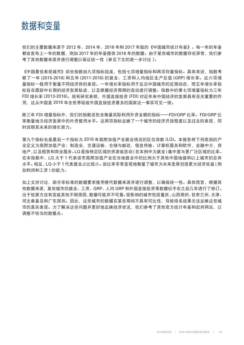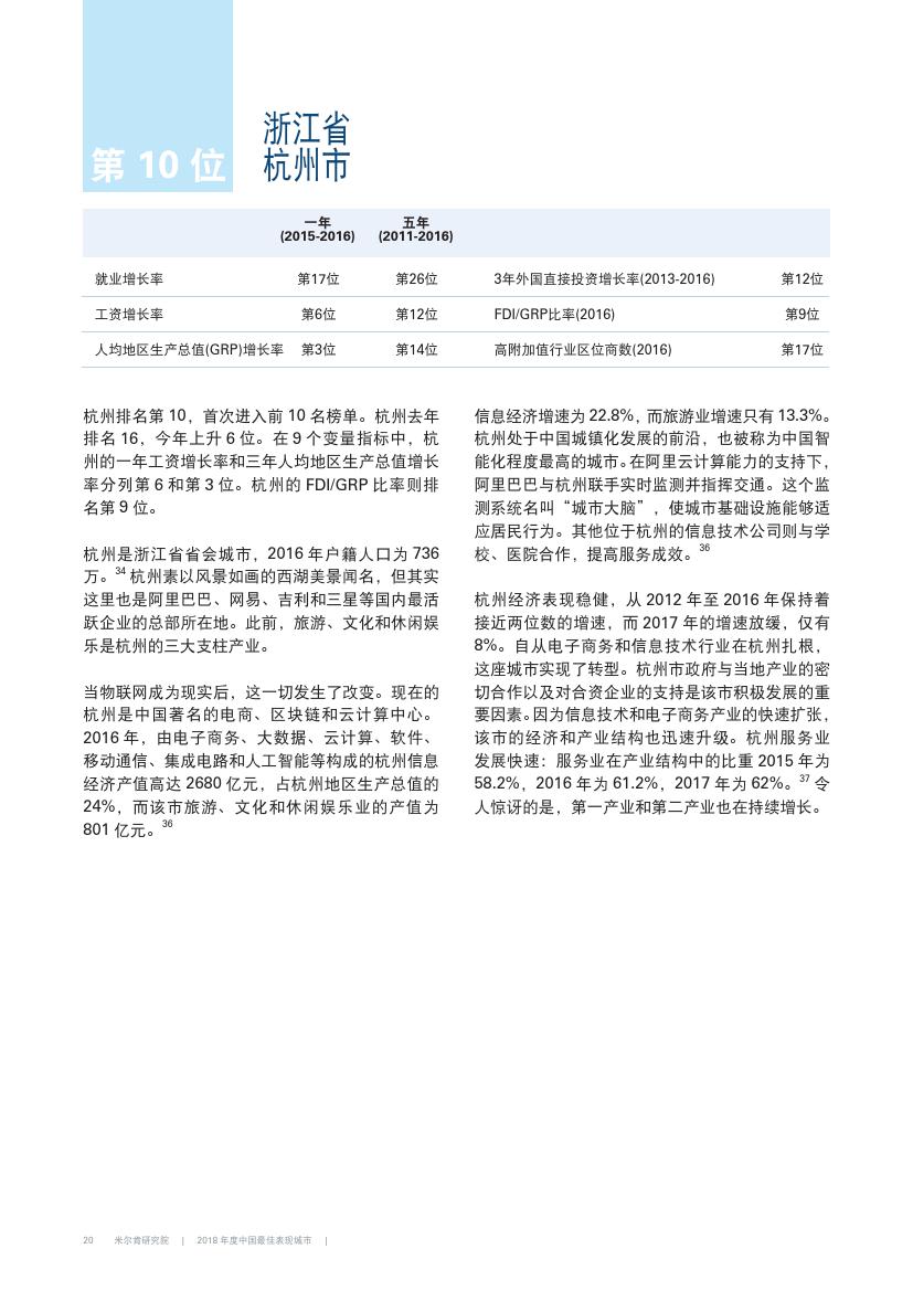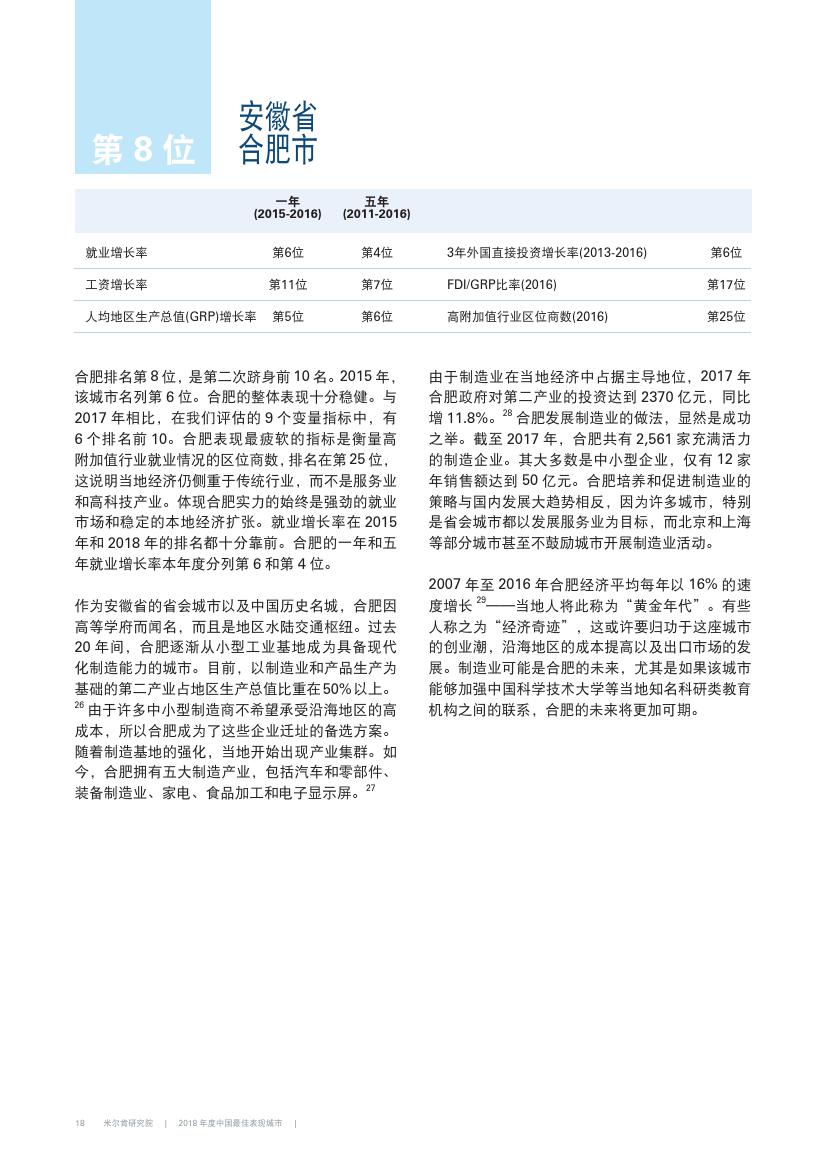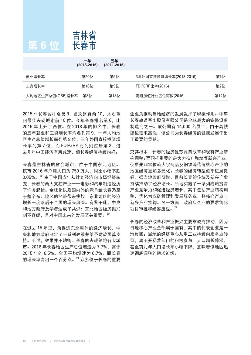 - 虽然近几十年来大多数东北城市的发展并不顺利,但吉林省长春市经济表现相对较好,排名第6 位。这座素以汽车和电影制作闻名的城市,近年来调整产业结构、侧重服务业,有助于实现产业多样性和平衡长春的产业结构。安徽省合肥市名列第8 位。合肥和贵阳一样,一直在大力发展高附加值产业。2012 年,合肥成立中国声谷产业园,依托科大讯飞等诸多企业开发声控设备和科技。占据前10 名排行榜最后两席的是陕西省西安市(排名第9)和浙江省杭州市(排名第10)。作为“一带一路”关键节点城市,西安取得强劲的经济表现,主要依靠的是外国直接投资。风景秀丽、历史悠久的杭州通过发展互联网产业逐步转型。