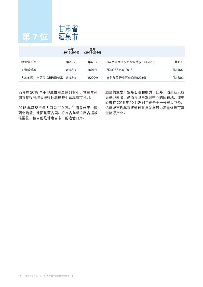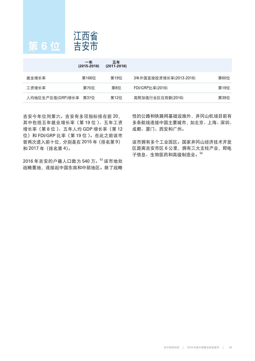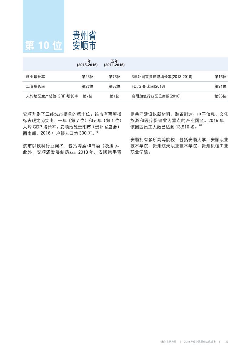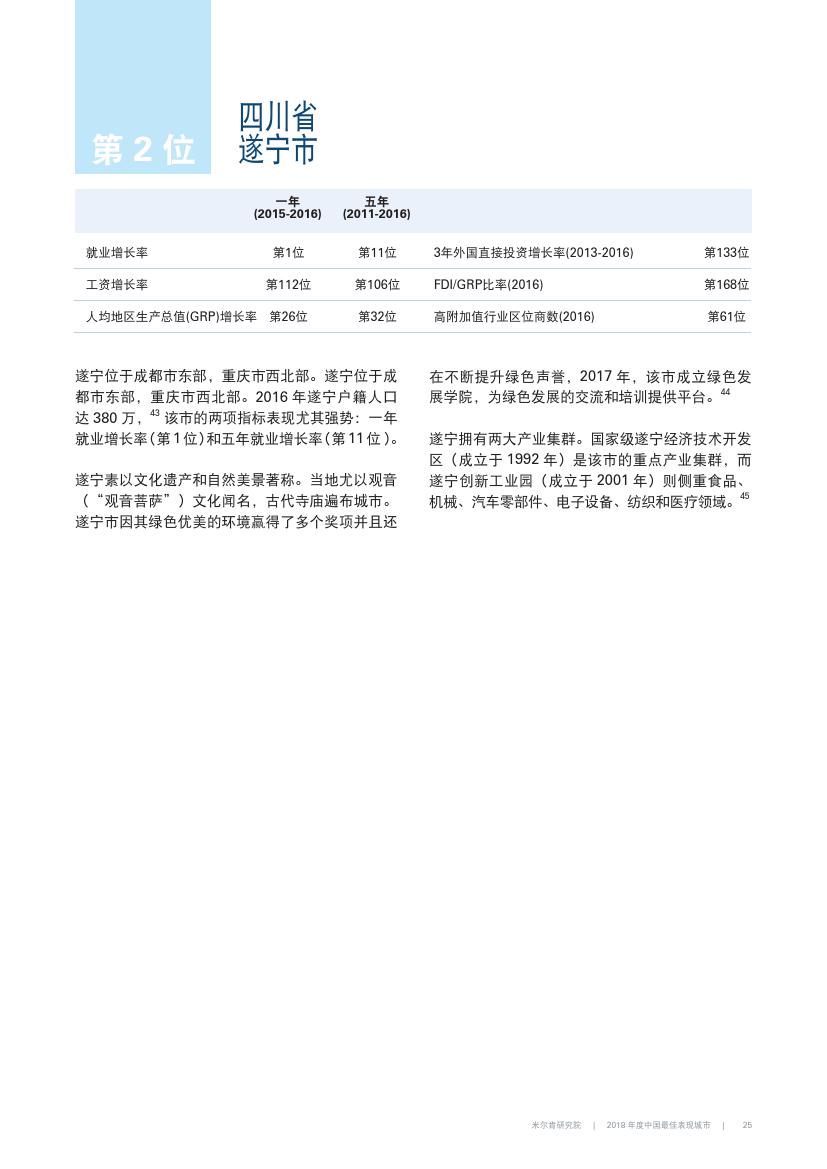 - 四川省遂宁市(排名第2)的亮眼经济表现主要归功于其一年和五年就业增长率。在一年和五年人均地区生产总值增长率的带动下,贵州省安顺市(排名第10)位次居前。外国直接投资以及“一带一路”倡议在推动安徽省芜湖市(排名第4)和甘肃省酒泉市(排名第7)的增长发挥了关键作用。不过虽然这些城市今年经济表现强劲,但仍需发展更为多元化的高附加值产业,增强其经济的长期健康发展。江西省吉安市列第6 位。事实上,吉安在2015 年(排名第9)和2017 年(排名第4)均进入了前10 名的榜单,说明该市在小城市当中经济表现相对稳定。江苏省苏州市(排名第9)在前几期排名中的成绩同样相当不错。其理想的经济表现得益于产业发达,尤其重视高科技产业。
