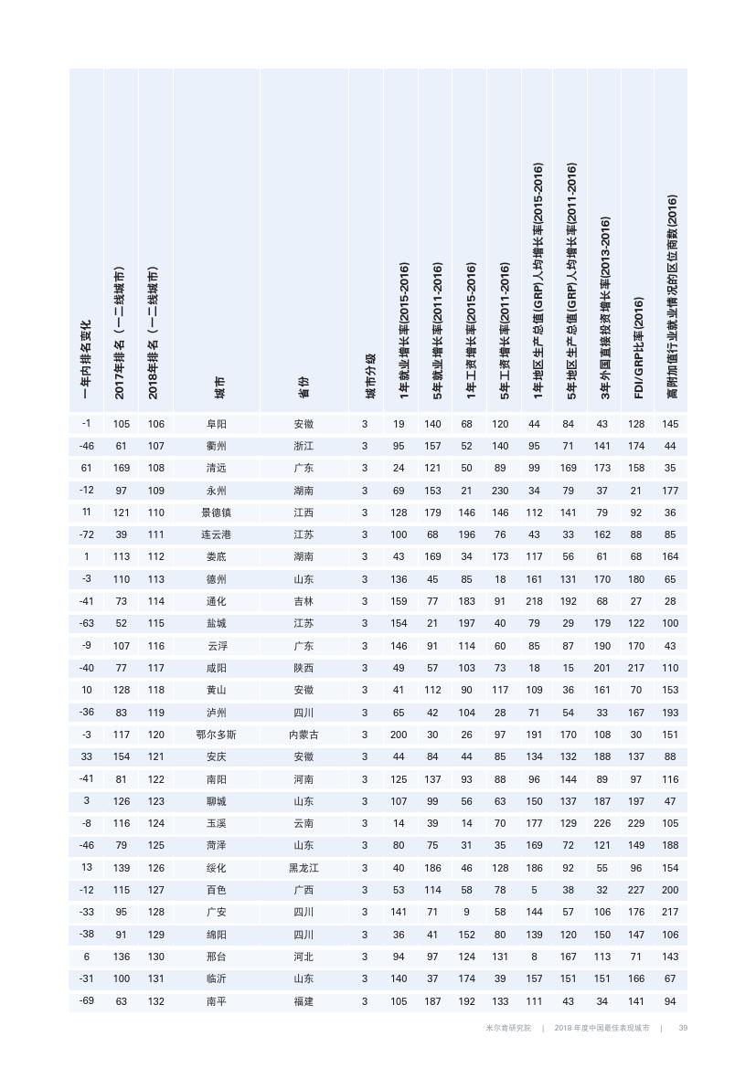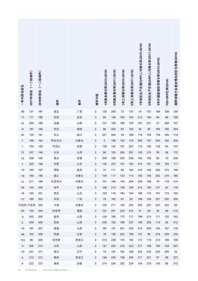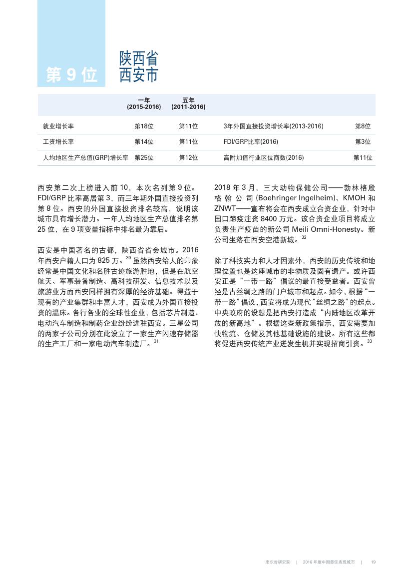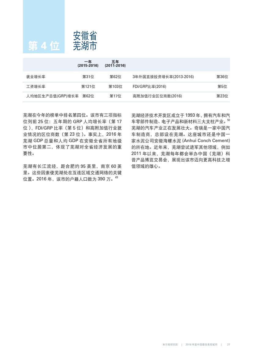 - 四川省遂宁市(排名第2)的亮眼经济表现主要归功于其一年和五年就业增长率。在一年和五年人均地区生产总值增长率的带动下,贵州省安顺市(排名第10)位次居前。外国直接投资以及“一带一路”倡议在推动安徽省芜湖市(排名第4)和甘肃省酒泉市(排名第7)的增长发挥了关键作用。不过虽然这些城市今年经济表现强劲,但仍需发展更为多元化的高附加值产业,增强其经济的长期健康发展。江西省吉安市列第6 位。事实上,吉安在2015 年(排名第9)和2017 年(排名第4)均进入了前10 名的榜单,说明该市在小城市当中经济表现相对稳定。江苏省苏州市(排名第9)在前几期排名中的成绩同样相当不错。其理想的经济表现得益于产业发达,尤其重视高科技产业。