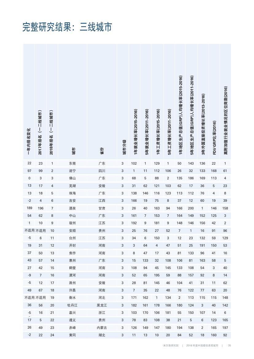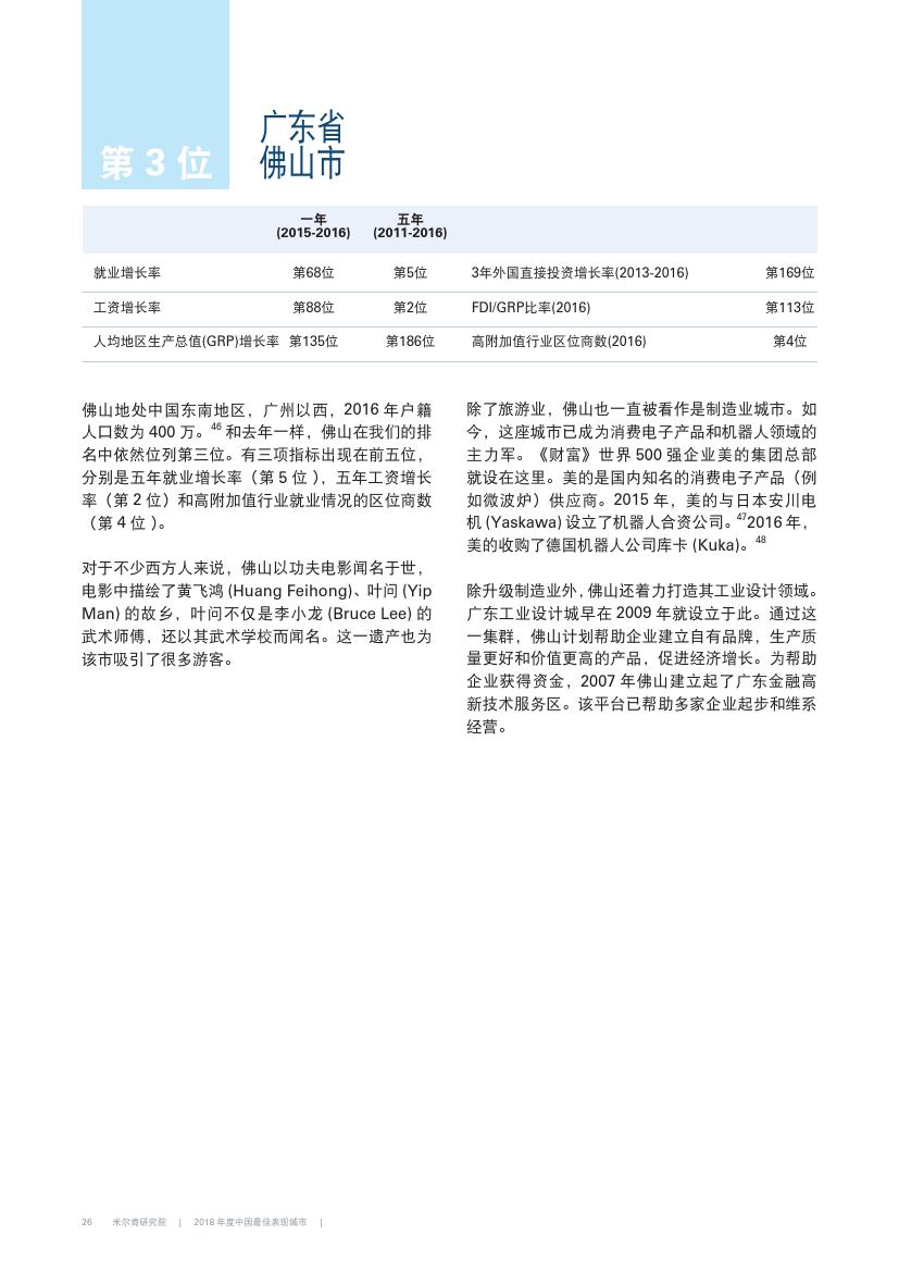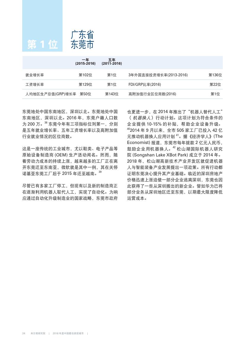 - 广东省东莞市在小城市组中夺魁。虽然过去几年间该市的经济受到冲击,但调整经济结构的做法成效显著。东莞市目前大力发展高附加值产业,尤其致力于发展机器人产业,并在生产活动中引入自动化技术。