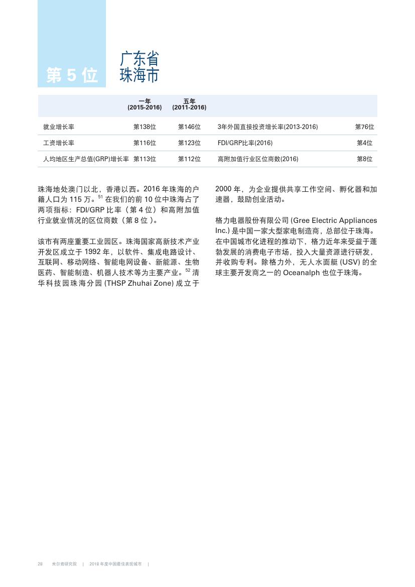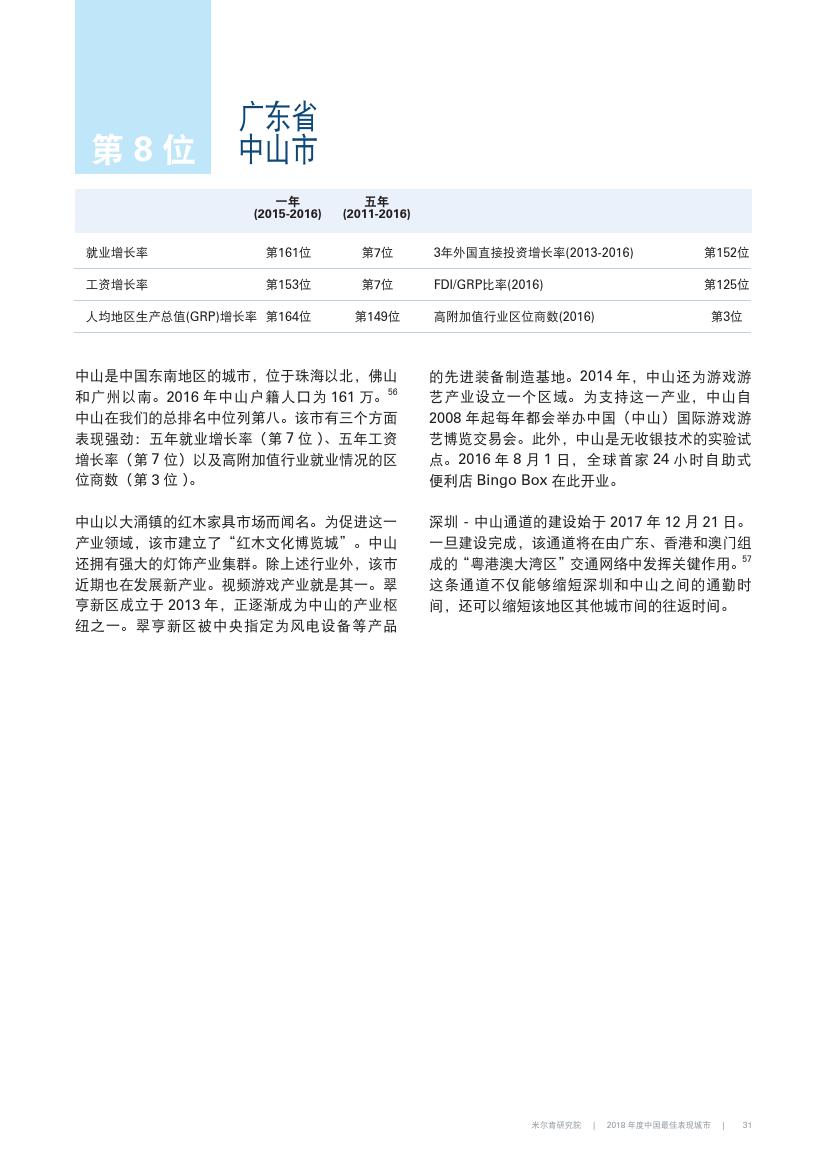 - 除东莞外,广东省还有三个城市跻身小城市组前10——佛山(排名第3)、珠海(排名第5)和中山(排名第8)。这些城市还在努力升级其产业机构。“大湾区”发展框架计划推动广东9 城、香港和澳门的互联互通,进一步壮大这一区域经济集群。