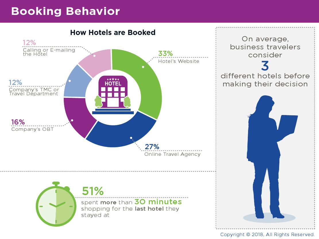 全球商务旅行协会(GBTA)与美国欧姆尼(Omni)酒店集团联合推出的一项研究表明,平均而言,商务旅客在预订前会考虑三家酒店。33%的受访者会通过酒店官网进行直接预订;27%的人选择了OTA;16%的商务旅客会采用企业OBT(在线预订工具)完成预订。