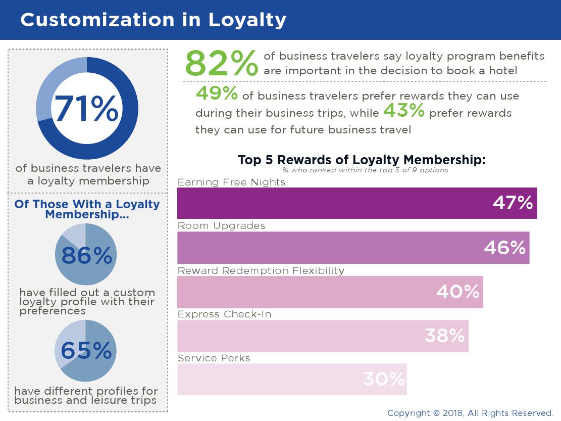 82%的受访者表示,忠诚度计划是推动预订酒店决策完成的重要影响因素。此外,九成的商旅客在选择酒店时会将奖励积分和额外津贴作为激励因素,81%的人认为忠诚会员会获得更好的服务。