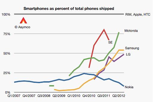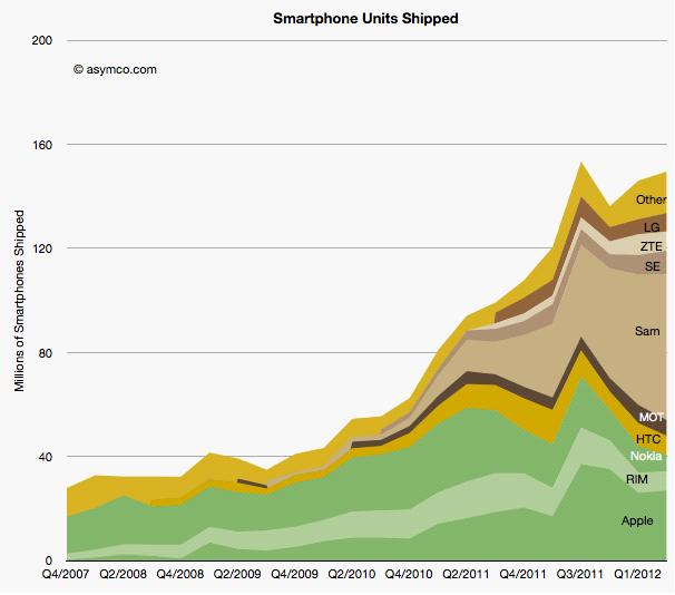 三星公司虽然涉足智能手机领域不久,但该公司智能手机目前已成为智能手机一线品牌,每季度的销量超过5000万部 ,销售智能手机获取的利润将近占所有行业总利润的40%。