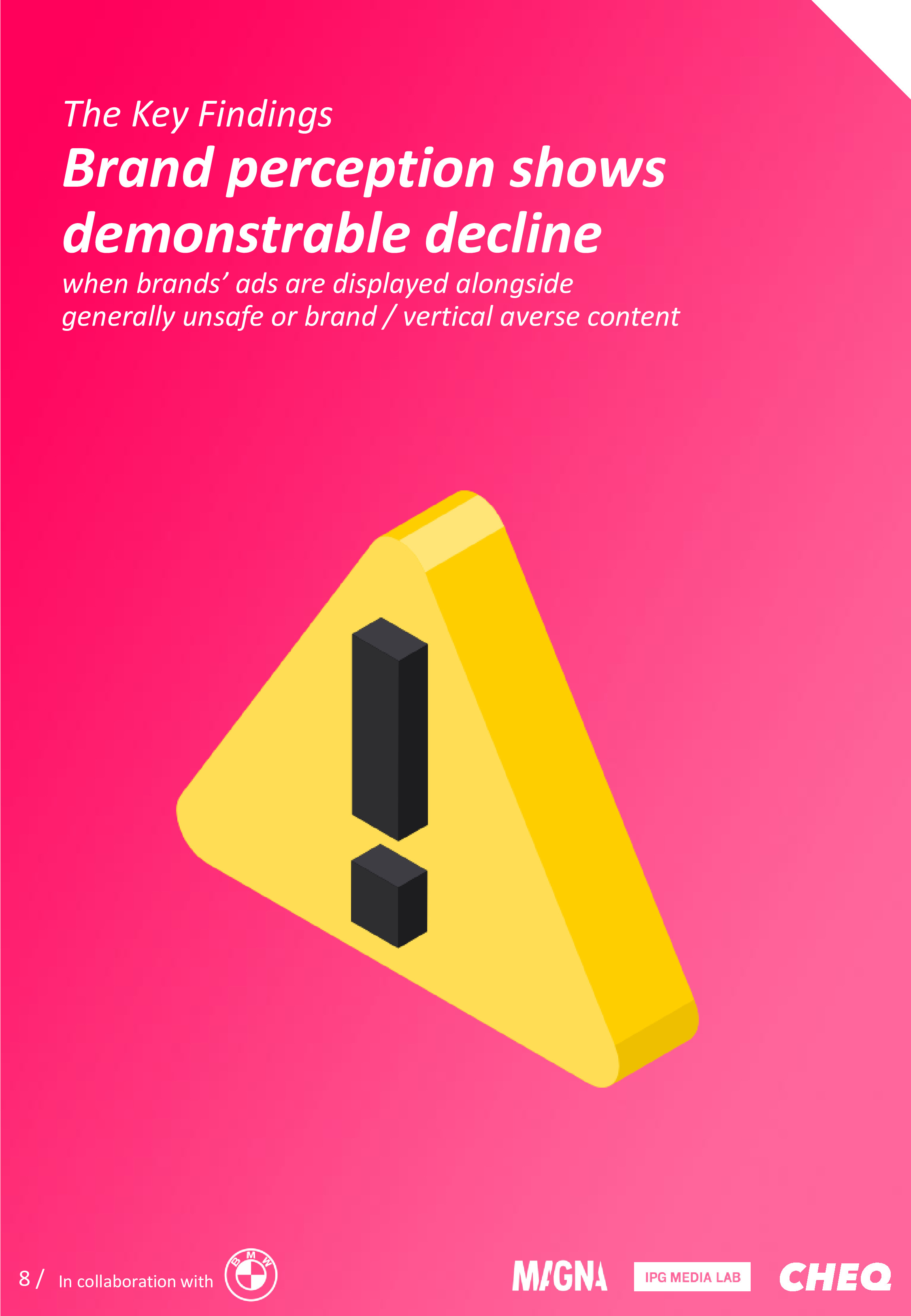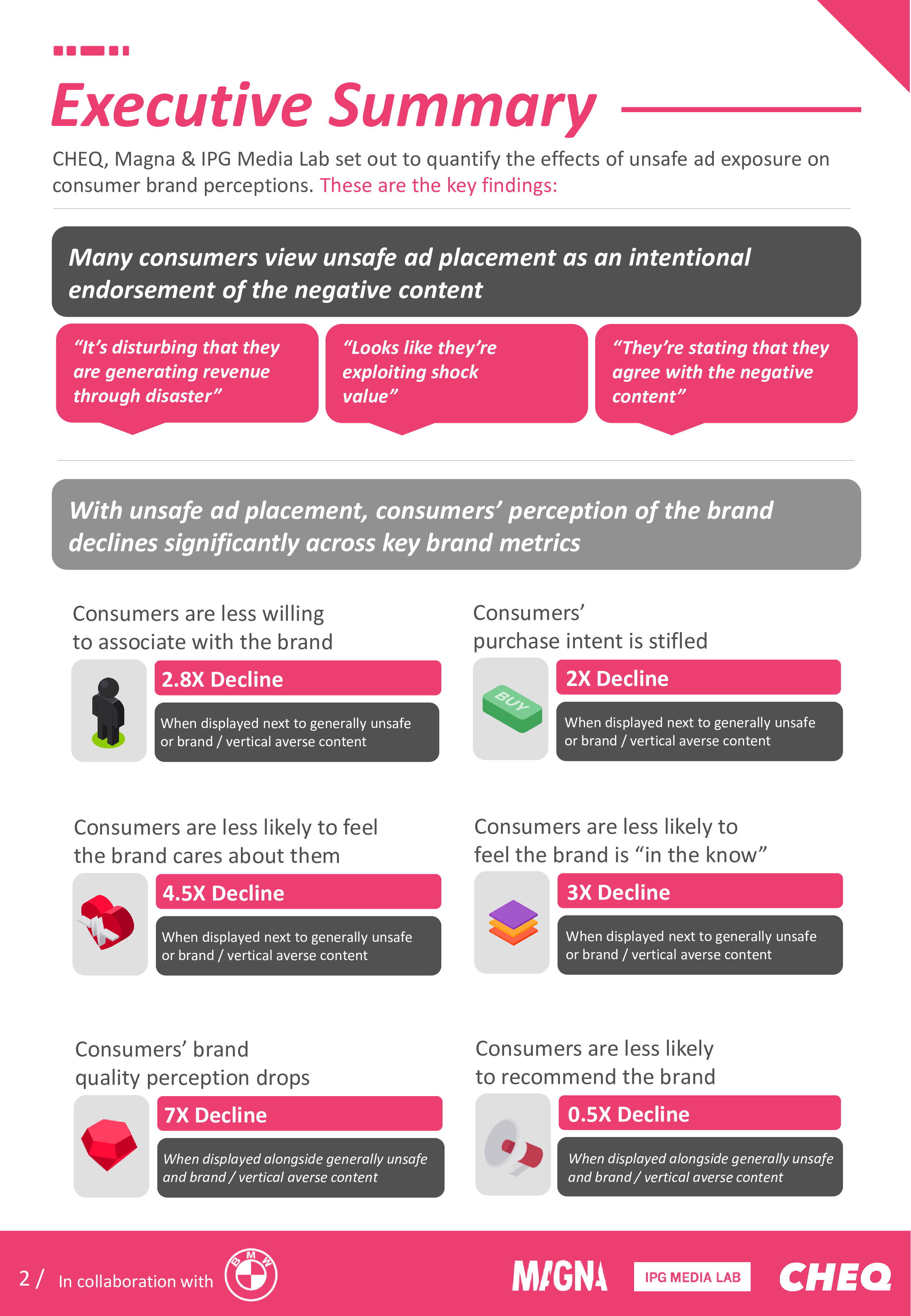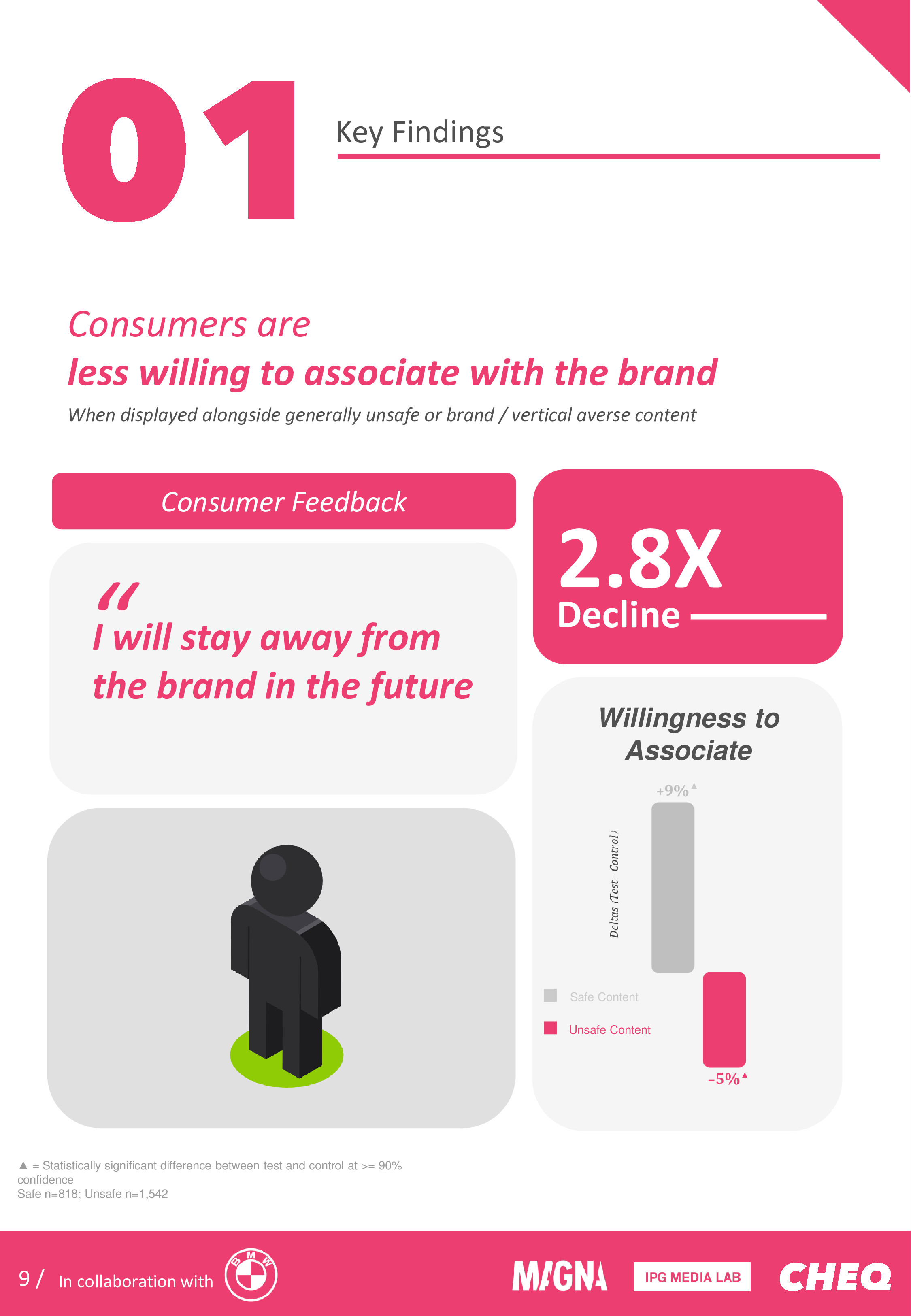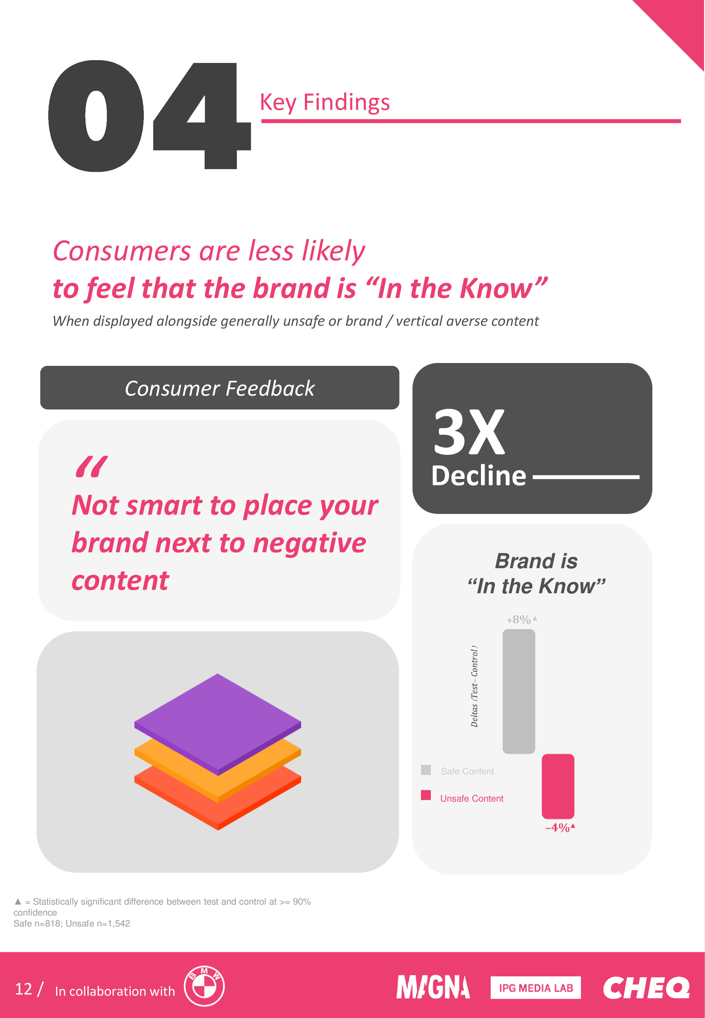 近期出现了一系列品牌安全问题,品牌安全企业CHEQ与IPG Mediabrands和宝马委托MAGNA实施的调查发现,负面内容附近出现的广告导致消费者与这些品牌联系的意愿减少2.8倍。