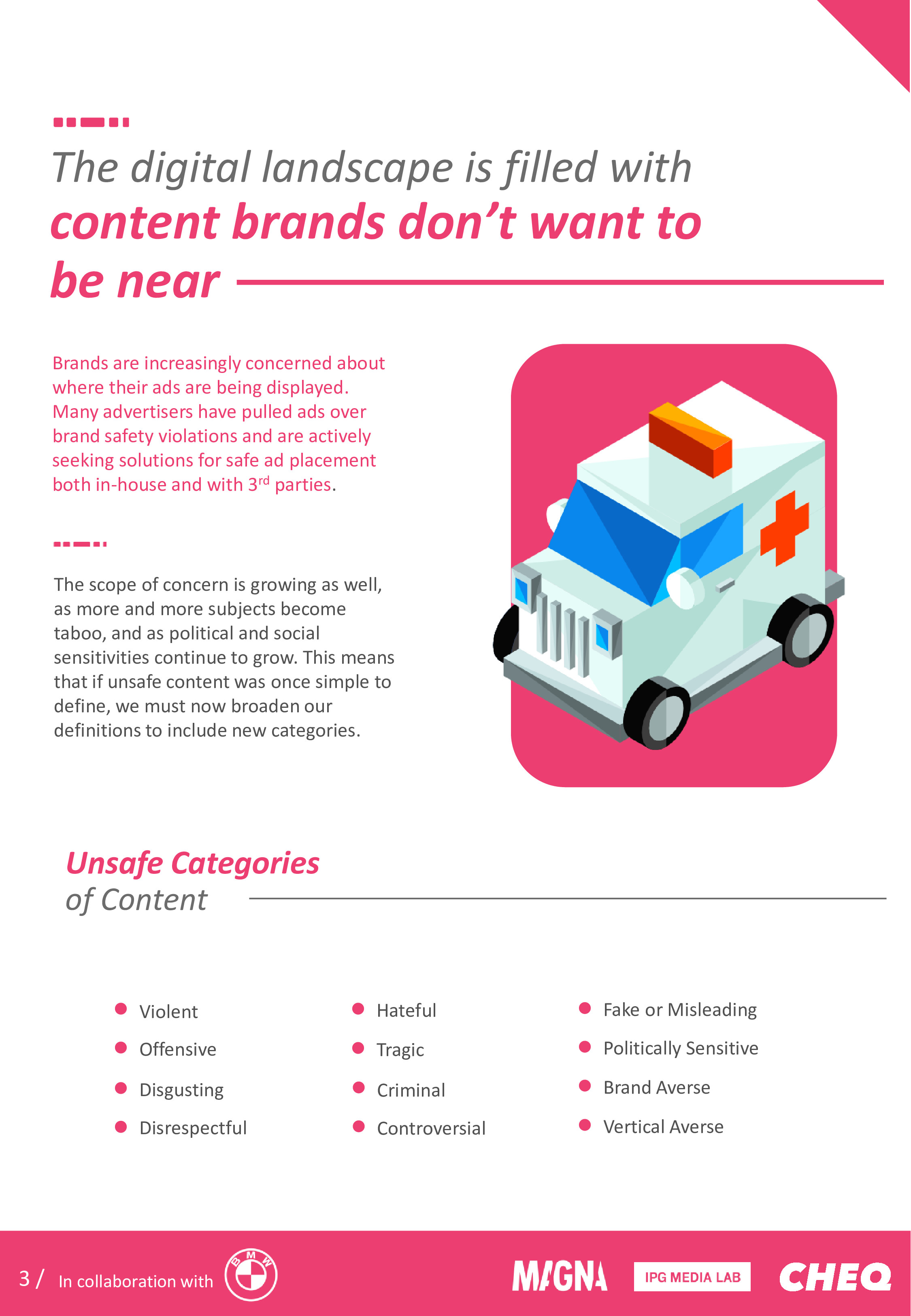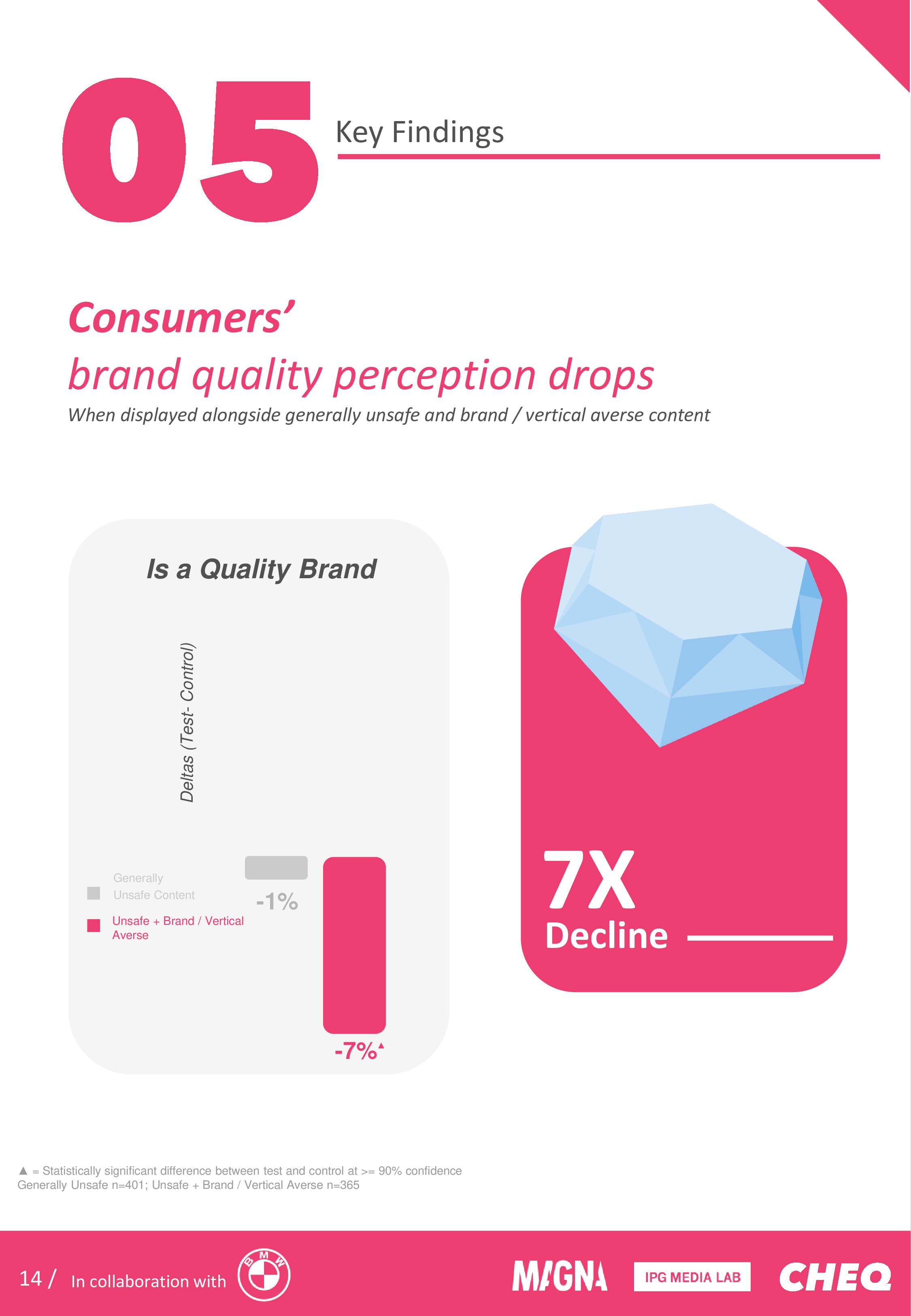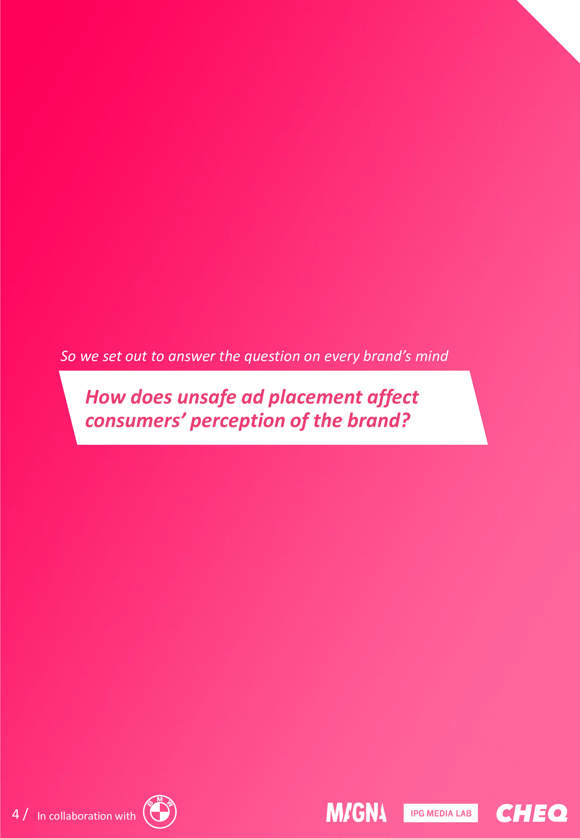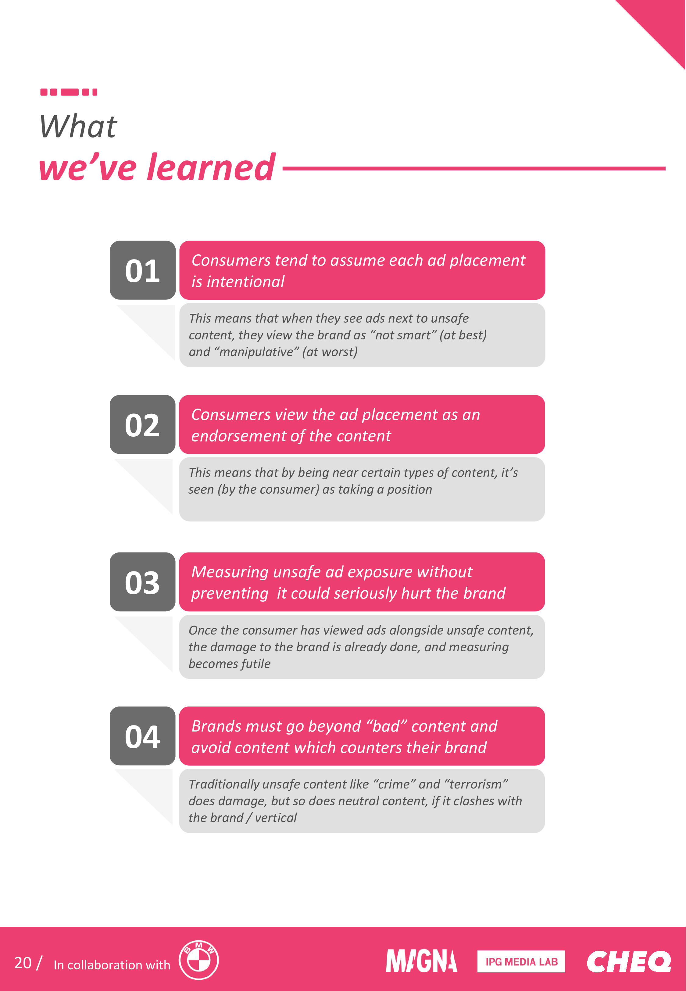 近期出现了一系列品牌安全问题,品牌安全企业CHEQ与IPG Mediabrands和宝马委托MAGNA实施的调查发现,负面内容附近出现的广告导致消费者与这些品牌联系的意愿减少2.8倍。