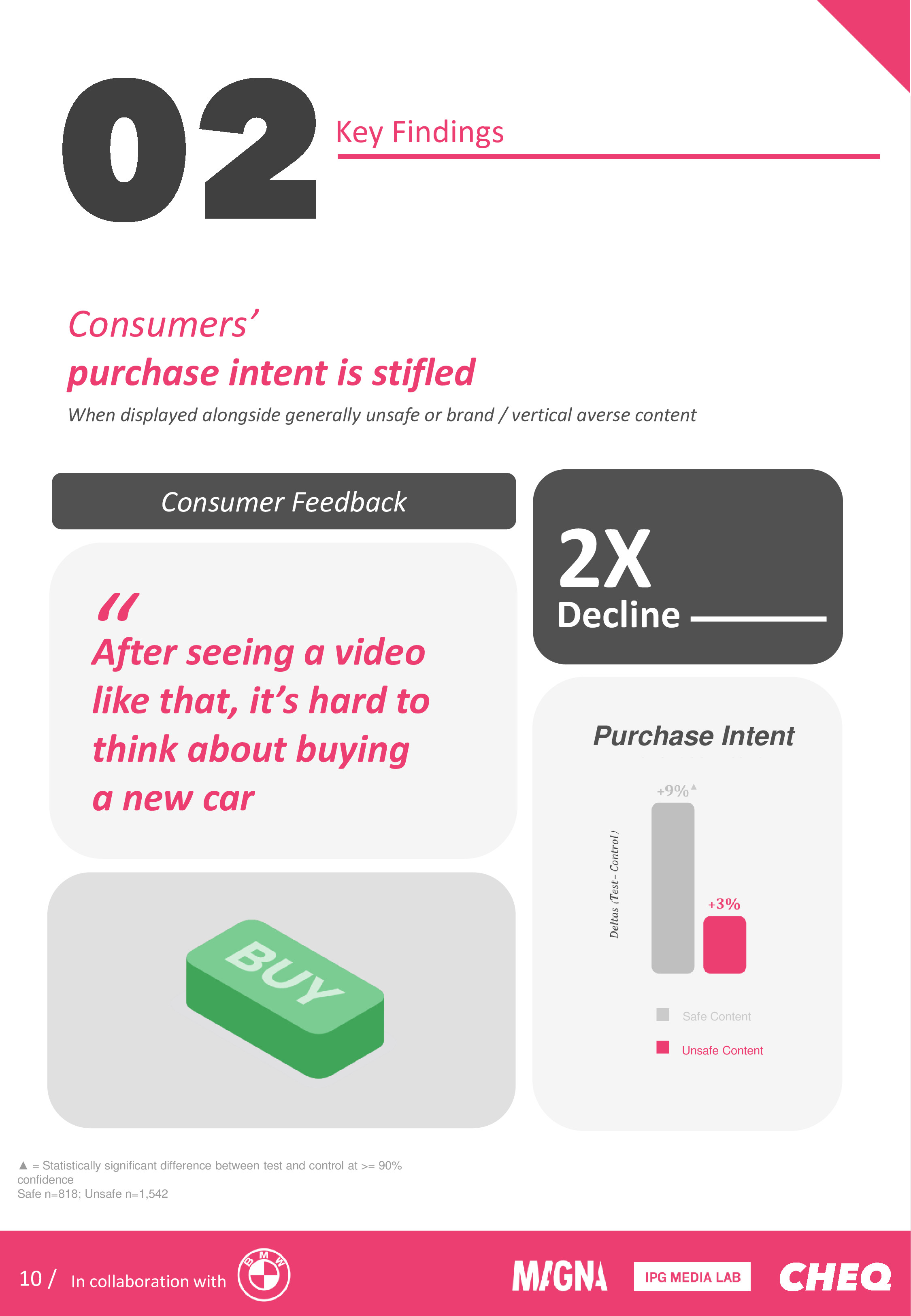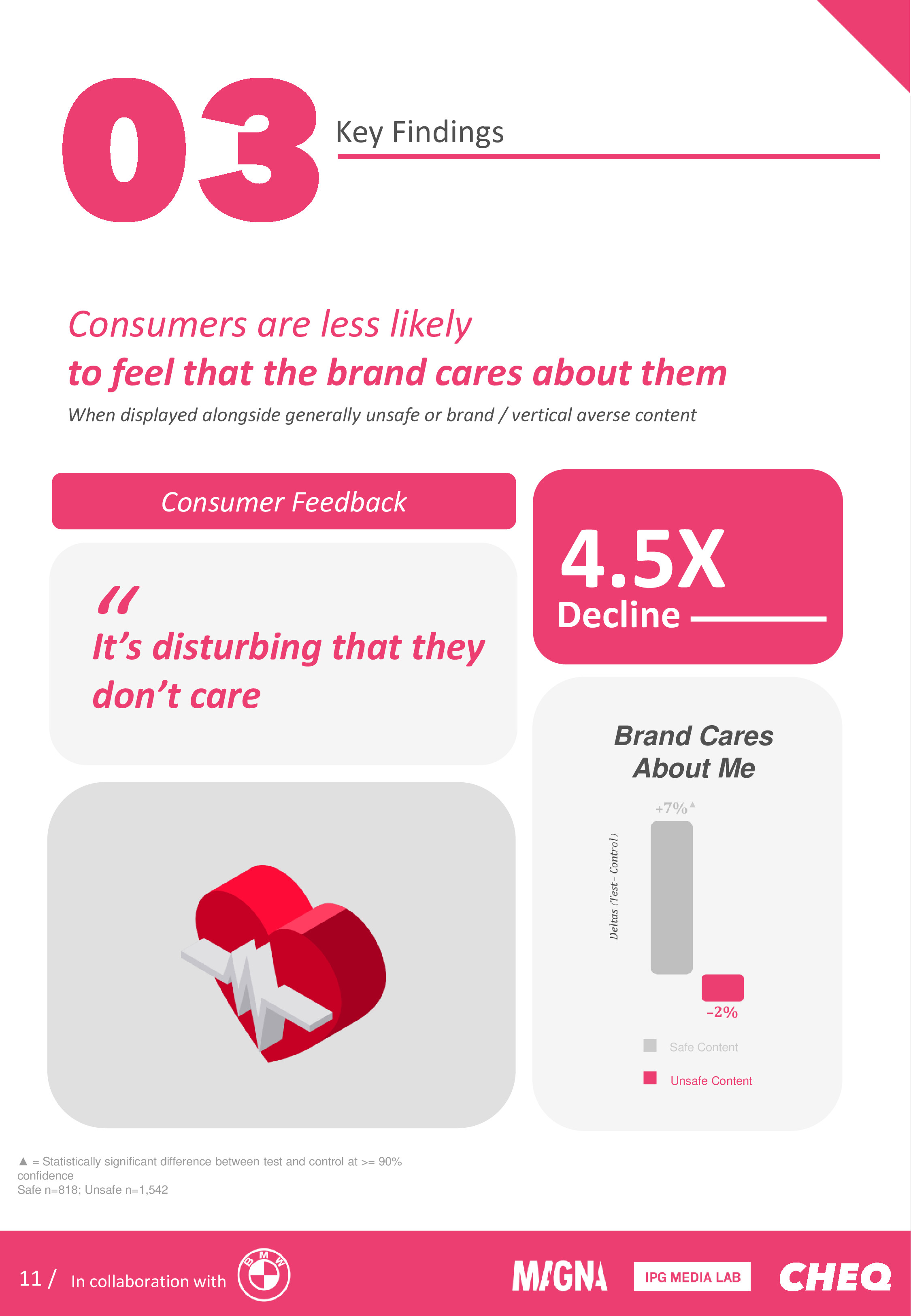 调查发现,许多消费者将品牌不安全的广告展示视为对负面内容的有意认可。当消费者认为每个广告展示都是有意的时,广告在不安全的环境中展示会使消费者与品牌联系的意愿下降2.9倍。