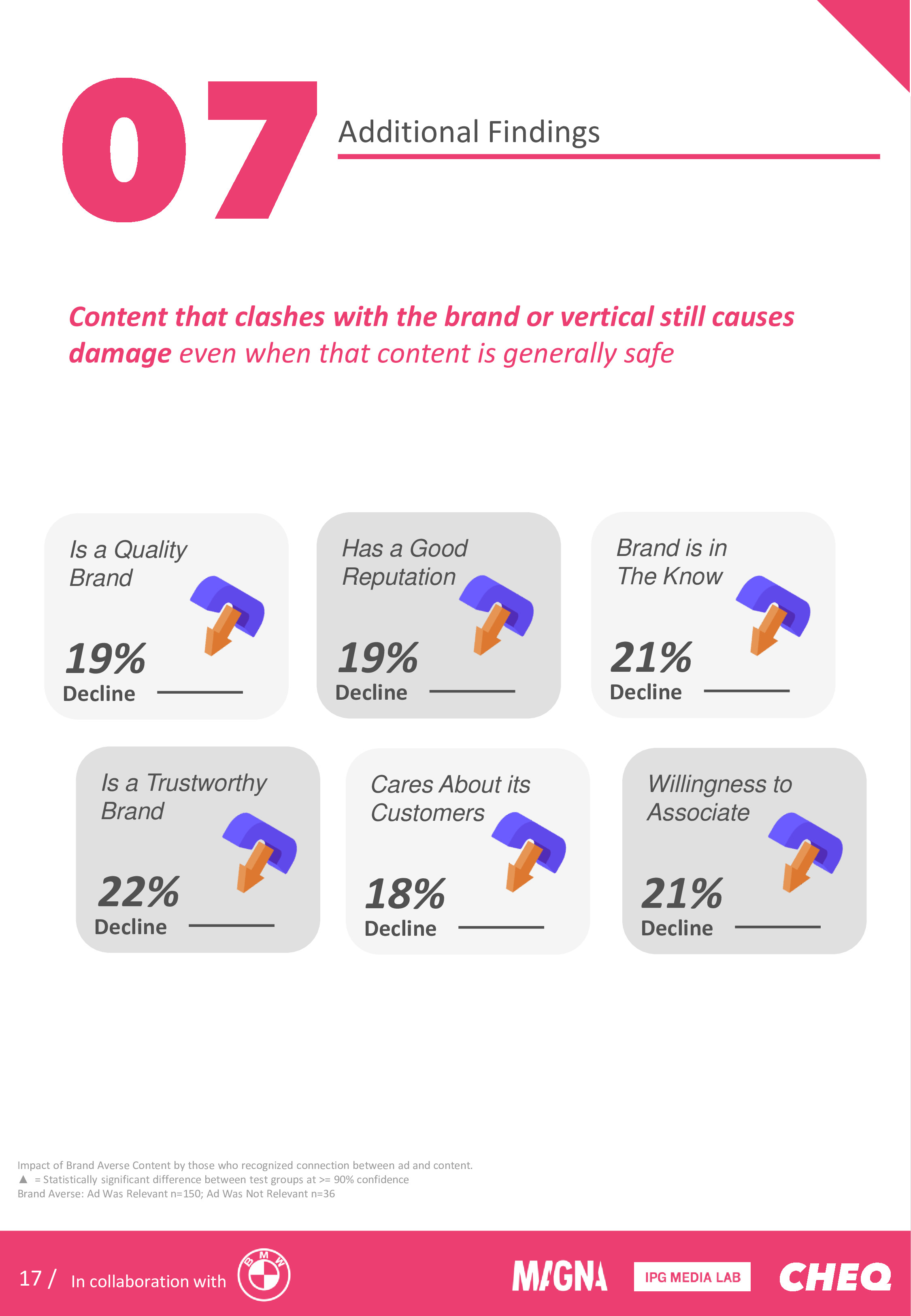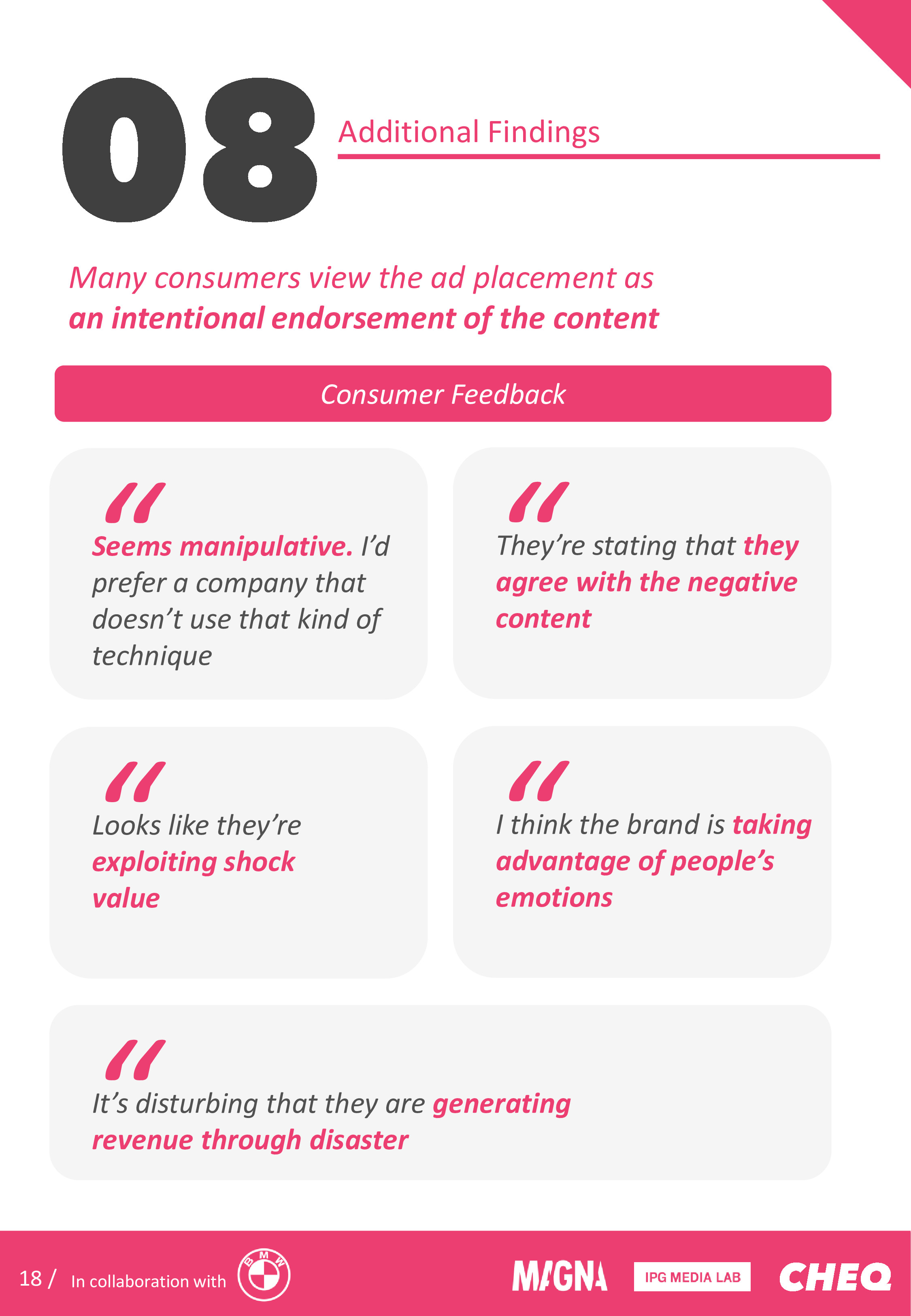 MAGNA调查了超过2000名消费者对与三种不同类型的“负面”内容一起出现的广告的反应,即一般是不安全的内容、品牌反感内容和垂直行业反感内容。