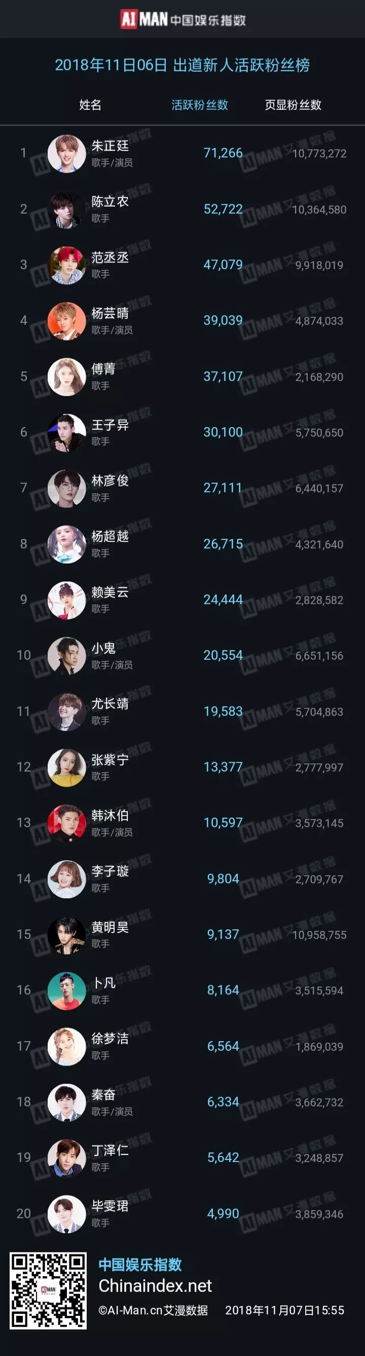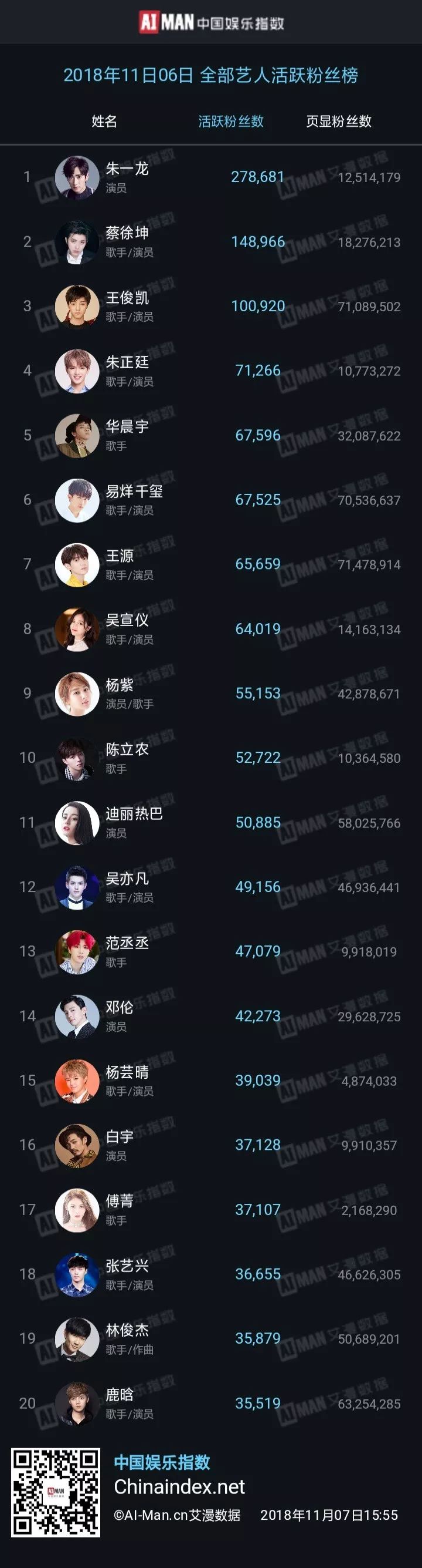 艾漫数据:2018年11月06日艺人数据榜 【11月06日 全部艺人活跃粉丝榜TOP20】 【11月06日 出道新人活跃粉丝榜TOP20】 更多阅读:艾漫数据:2018年12月10日艺人数据榜艾漫数据:2022年4月艾漫数据代言大盘报告艾漫数据:国产爱豆的发展现状腾讯娱乐&艾漫数据:2015年腾讯娱乐白皮书–音乐篇腾讯娱乐&艾漫数据:2015年腾讯娱乐白皮书–综艺篇腾讯娱乐&艾漫数据:2015年腾讯娱乐白皮书–电视篇腾讯娱乐&艾漫数据:2015年腾讯娱乐白皮书–明星篇腾讯娱乐&艾漫数据:2015年腾讯娱乐白皮书–明星篇艾漫数据:2019上半年各线级城市泛娱乐受众大数据分析报告艾漫数据:2019年第1季度明星商业价值系列榜单腾讯娱乐&艾漫数据:关于90后娱乐选择的22个真相艾漫数据&微博:2018粉丝白皮书艾漫数据:2021年8月电影月度大盘报告艾漫数据:细数2015娱乐圈十宗最FIFPRO:2024年女足报告
